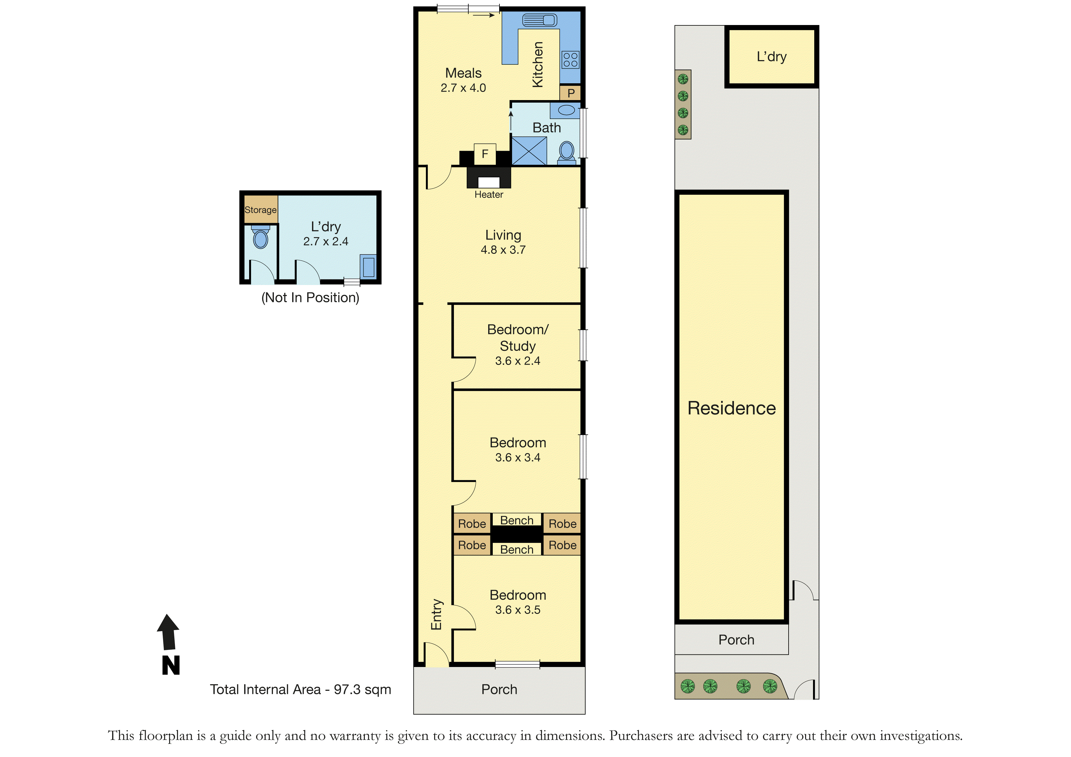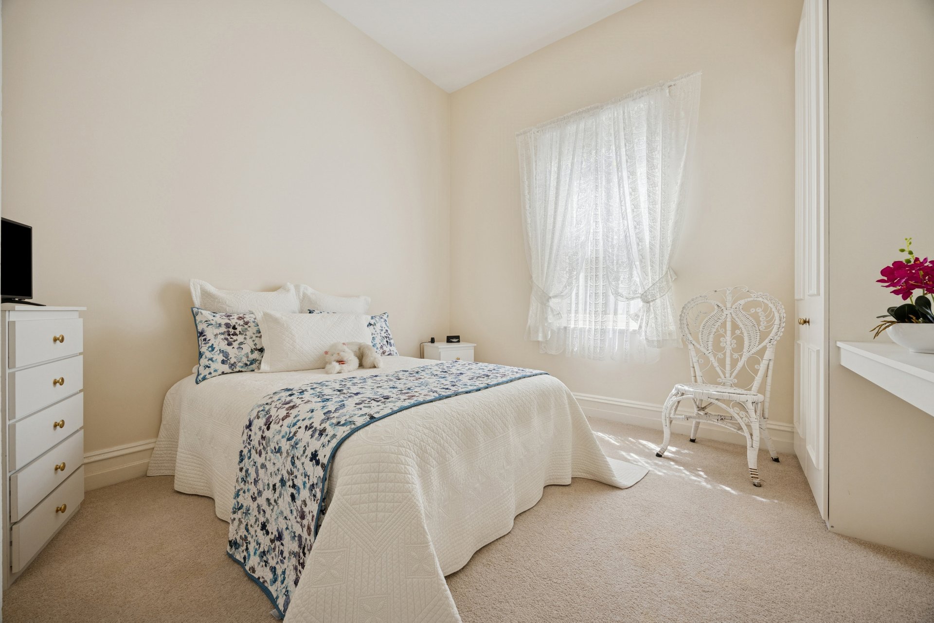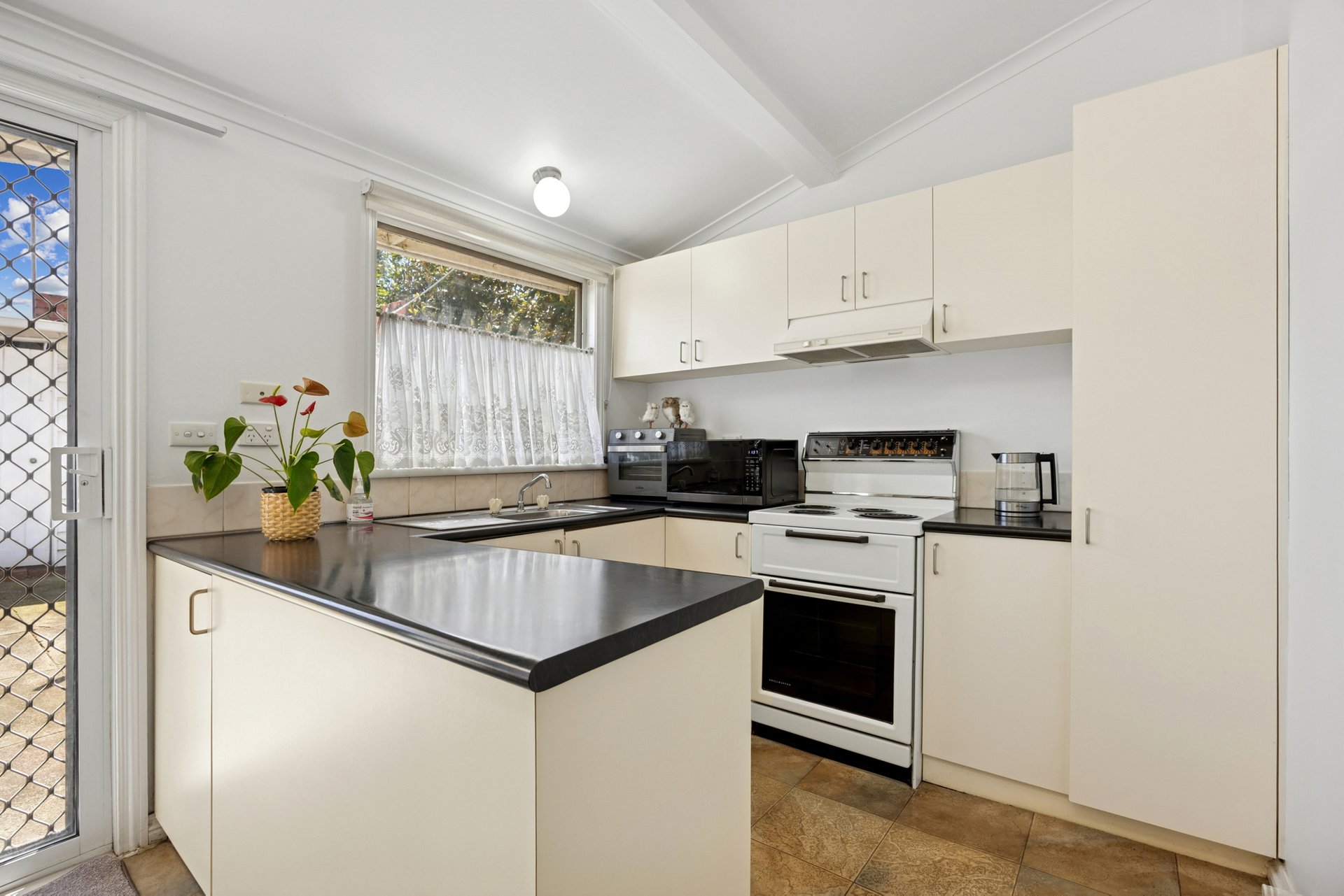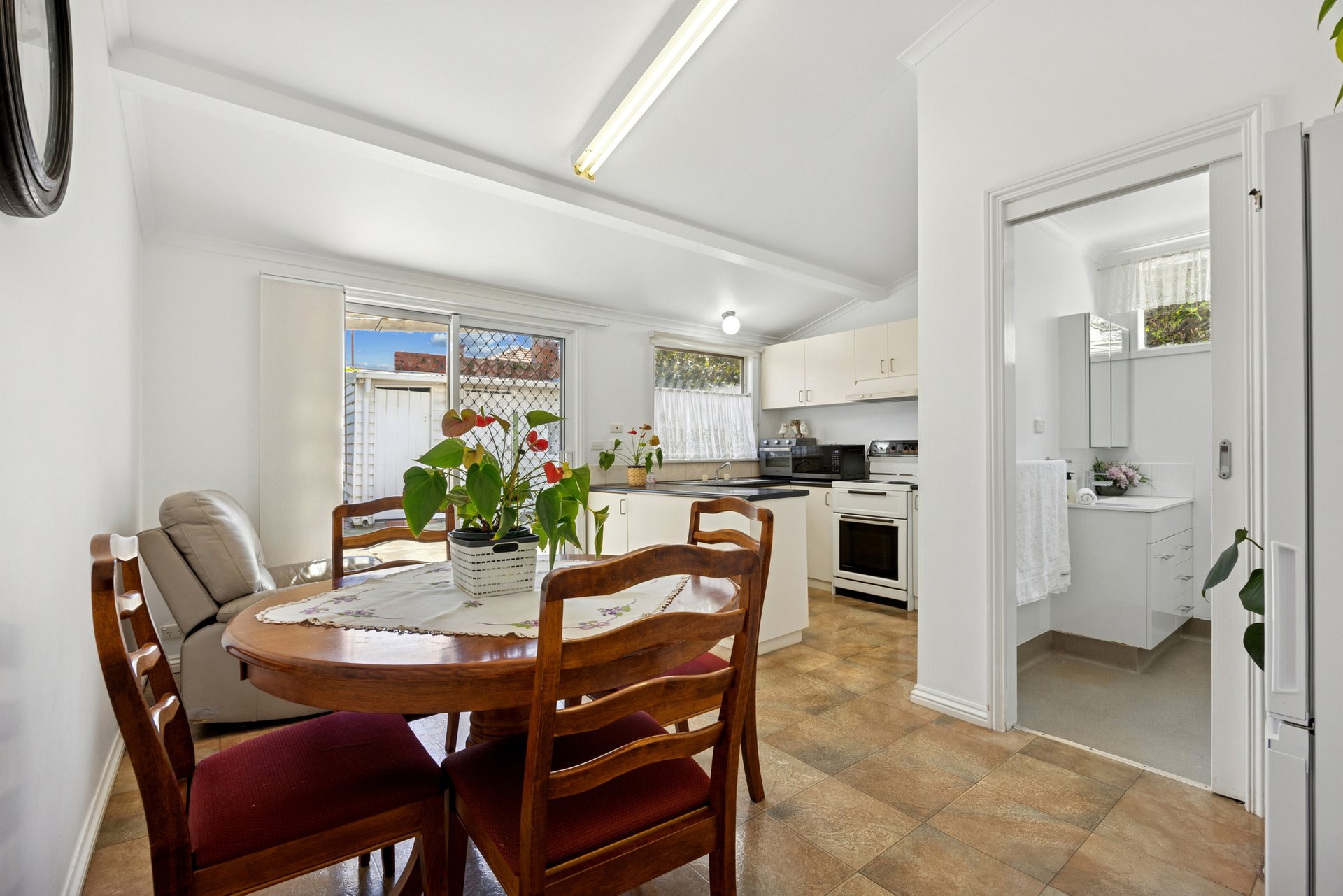 The traditional hallway draws you through the home, opening to three generous bedrooms. Two have built-in robes, and the third works as a study or bedroom, giving you that extra room you don’t often find, and space that elevates the comfort. Further along, the living room is anchored by a gas heater and flows into the meals area and an updated kitchen with excellent storage and bench space. Sliding doors open from here to a paved courtyard that’s low-maintenance and private.