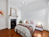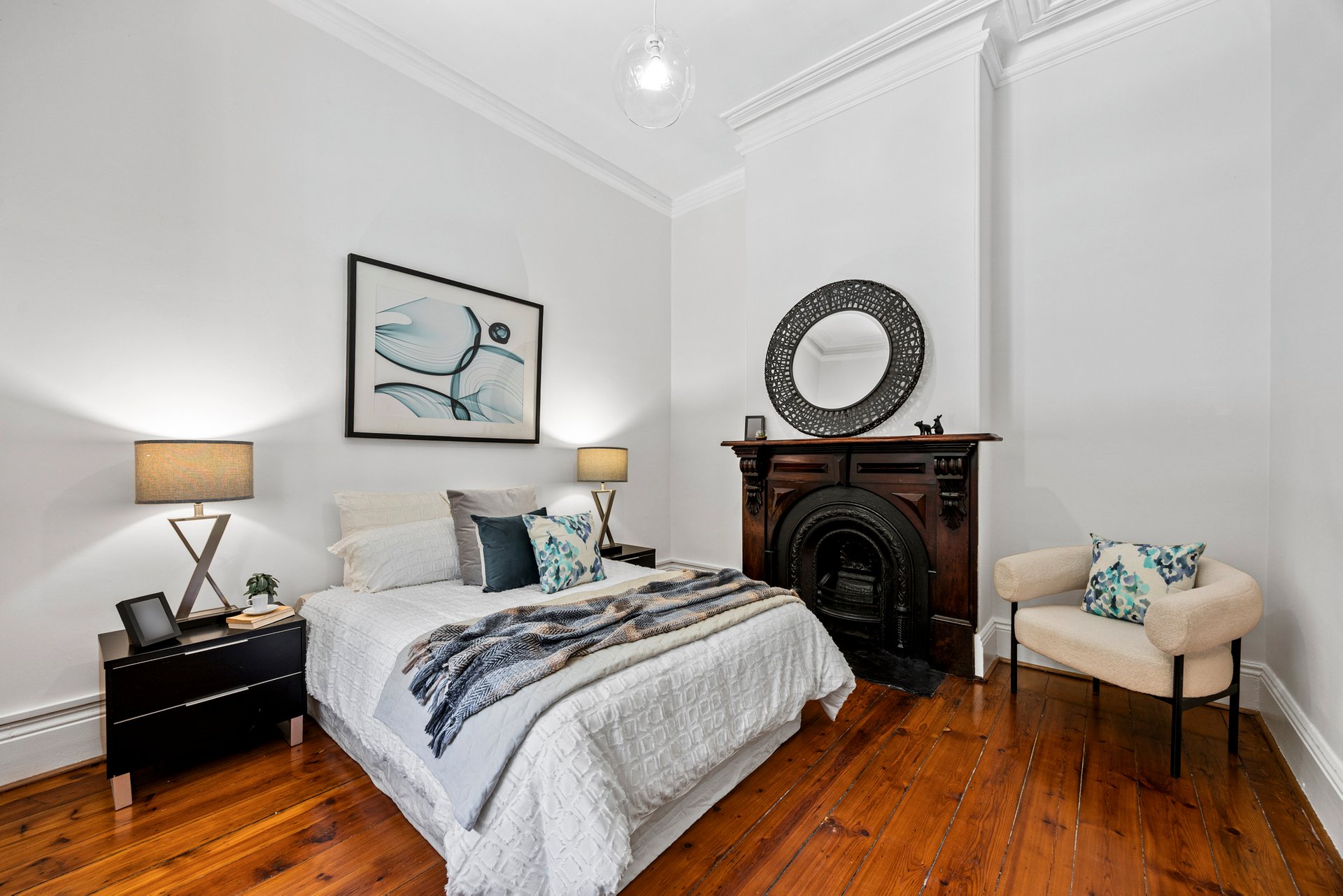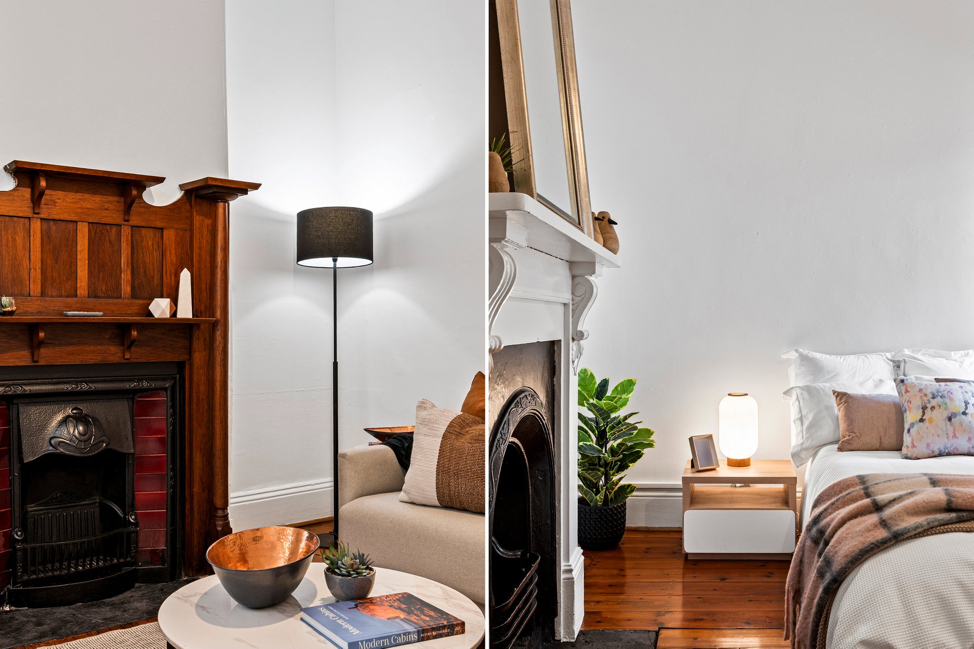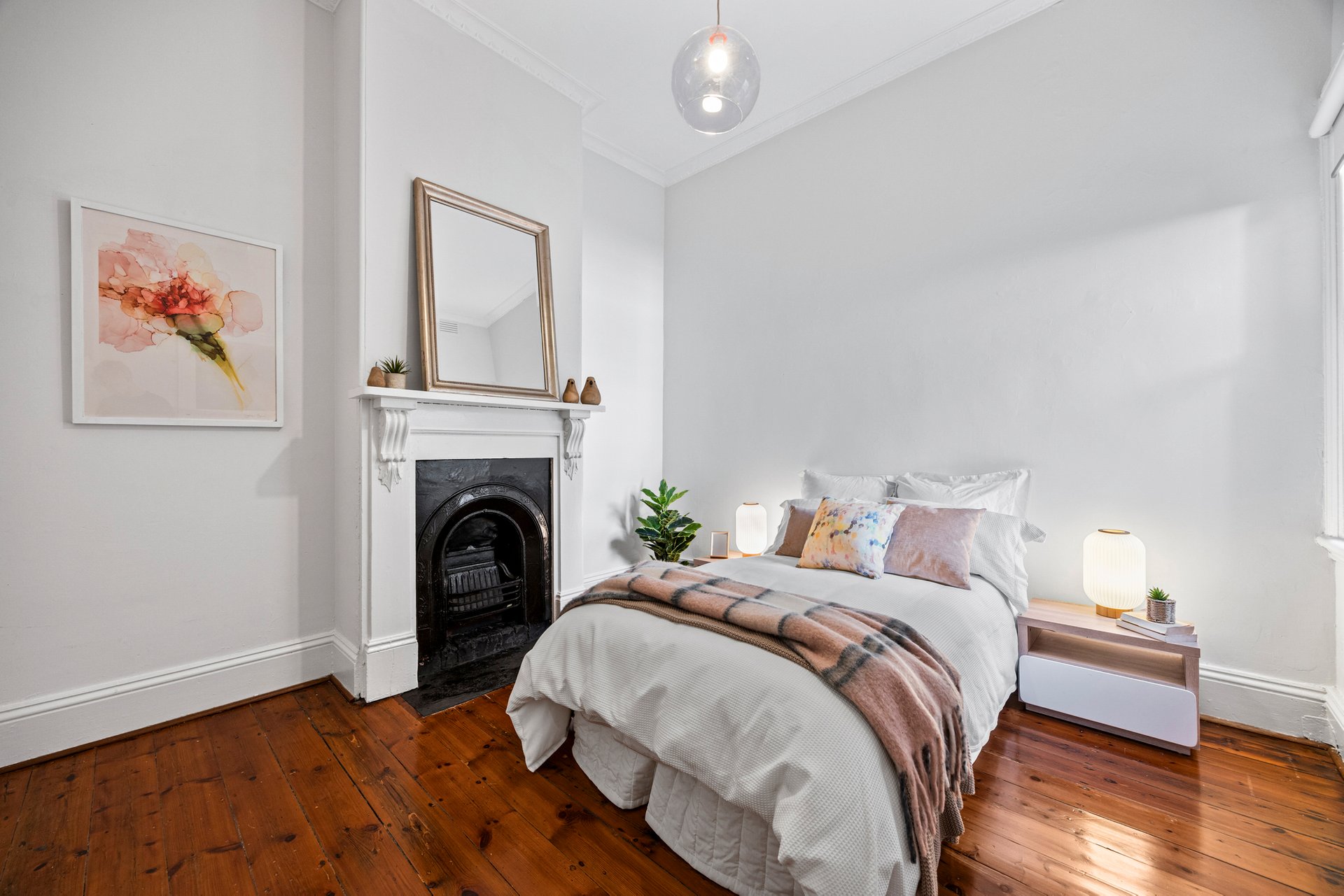 The two bedrooms, located at the front of the property, feature large windows allowing natural light to fill the space. Each bedroom has its own fireplace, adding character and warmth. A renovated bathroom at the rear of the property includes floor-to-ceiling tiles, vanity basin with chrome finishes, and modern fixtures.