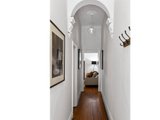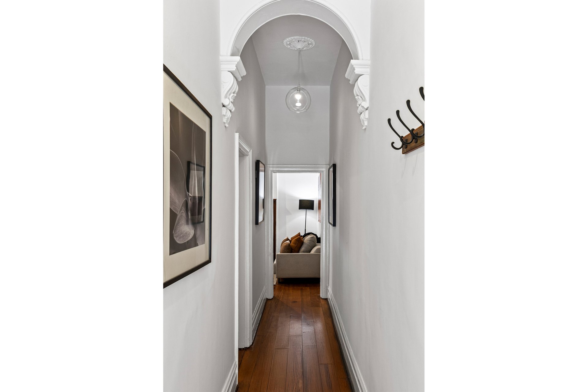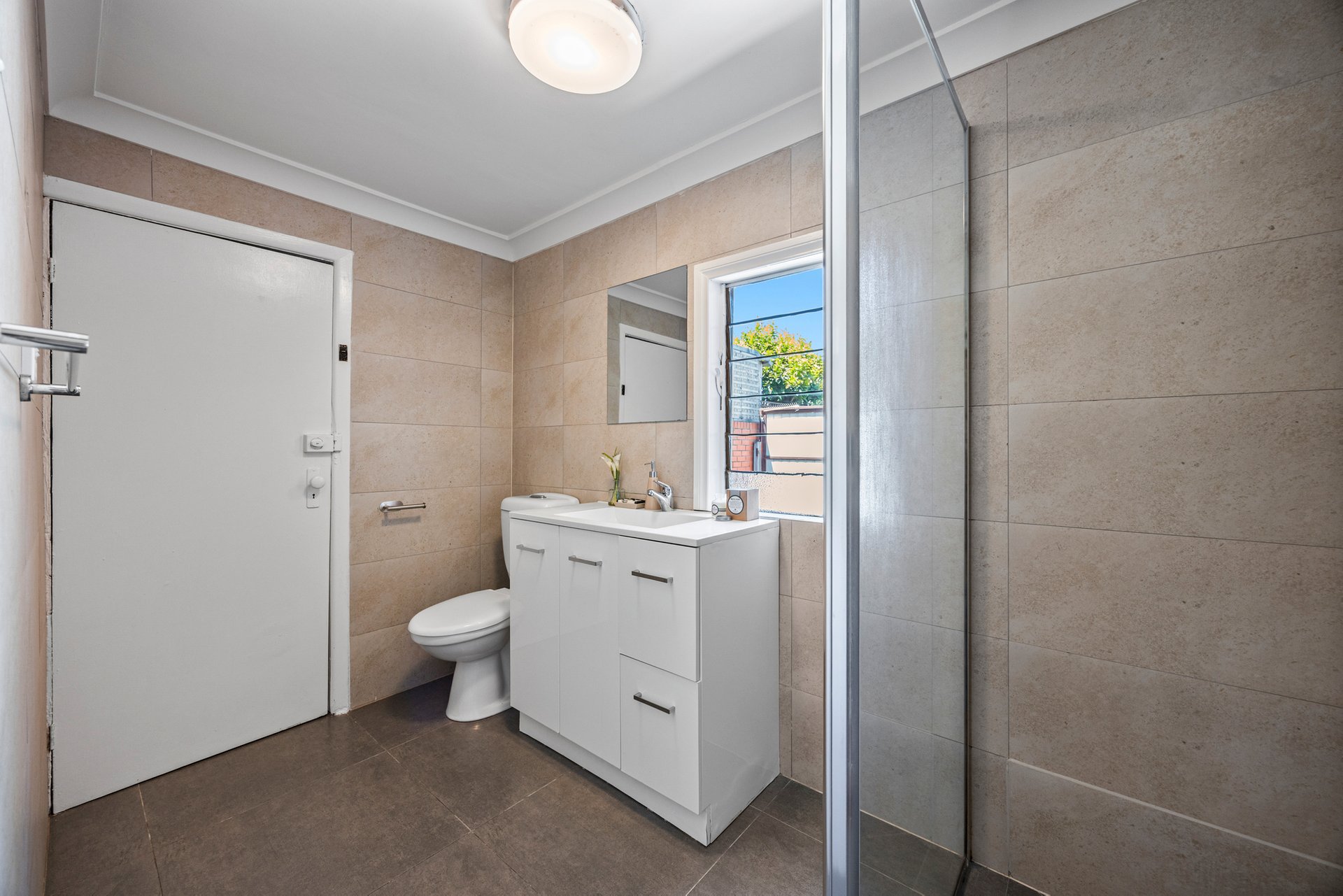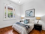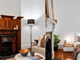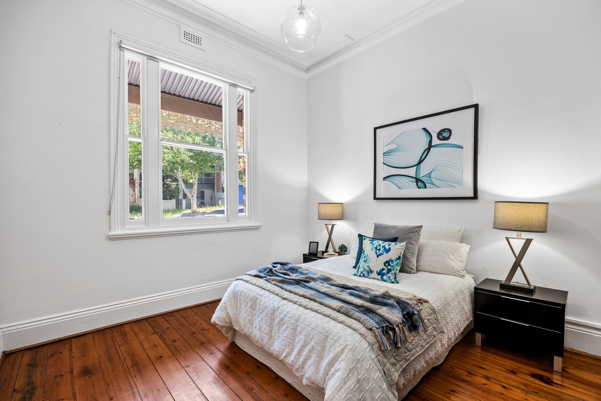 The two bedrooms, located at the front of the property, feature large windows allowing natural light to fill the space. Each bedroom has its own fireplace, adding character and warmth. A renovated bathroom at the rear of the property includes floor-to-ceiling tiles, vanity basin with chrome finishes, and modern fixtures.