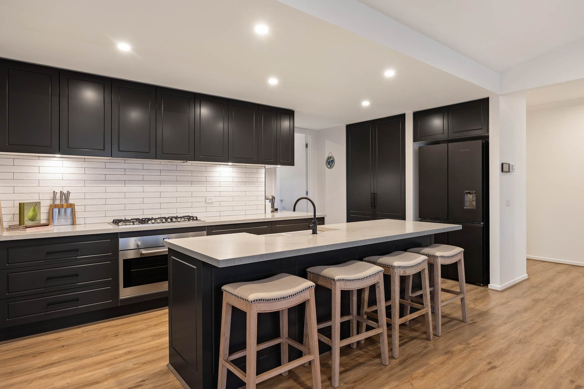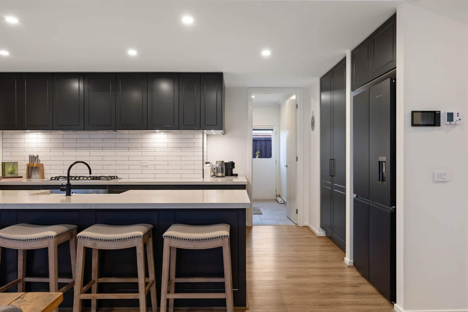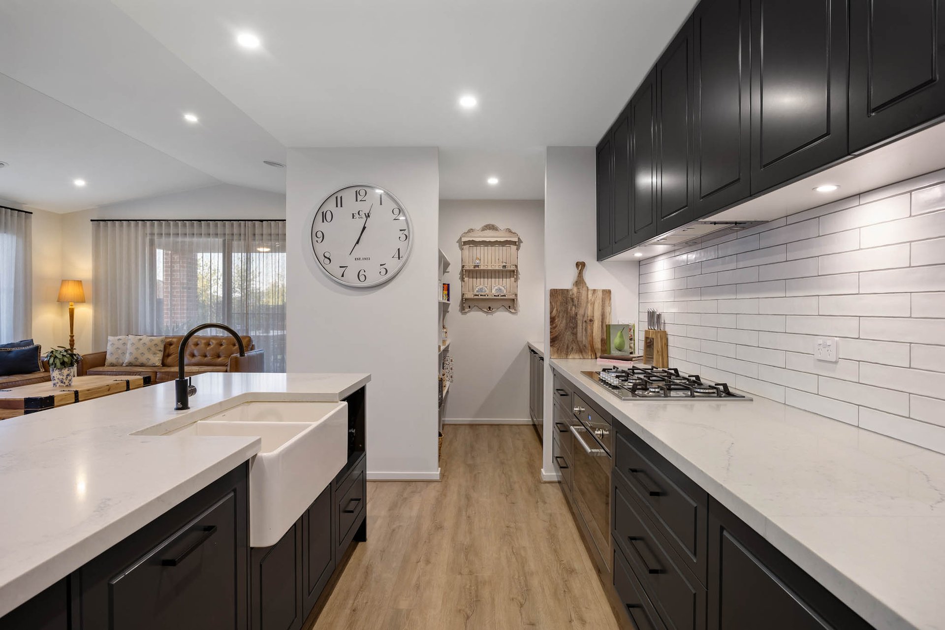 At the centre, the kitchen is executed with precision, appointed with stone surfaces, undermount Bocchi farmhouse sinks, soft-close cabinetry, and a butler's-style walk-in pantry. A full suite of ILVE appliances, including 900mm-wide cooking and an integrated dishwasher, supports both everyday function and elevated entertaining.