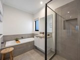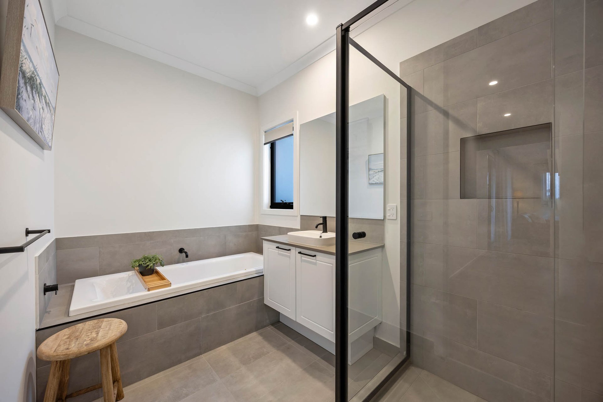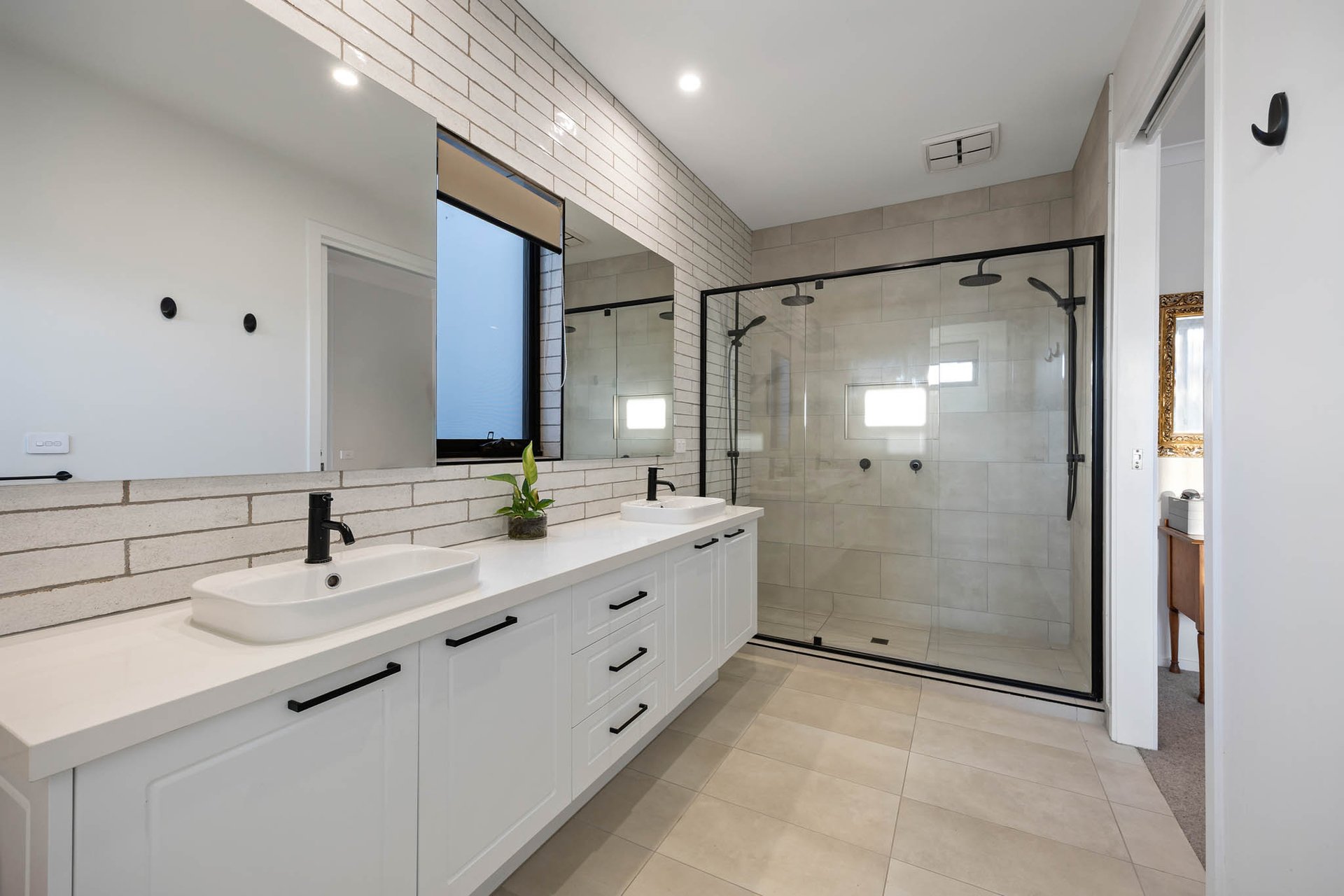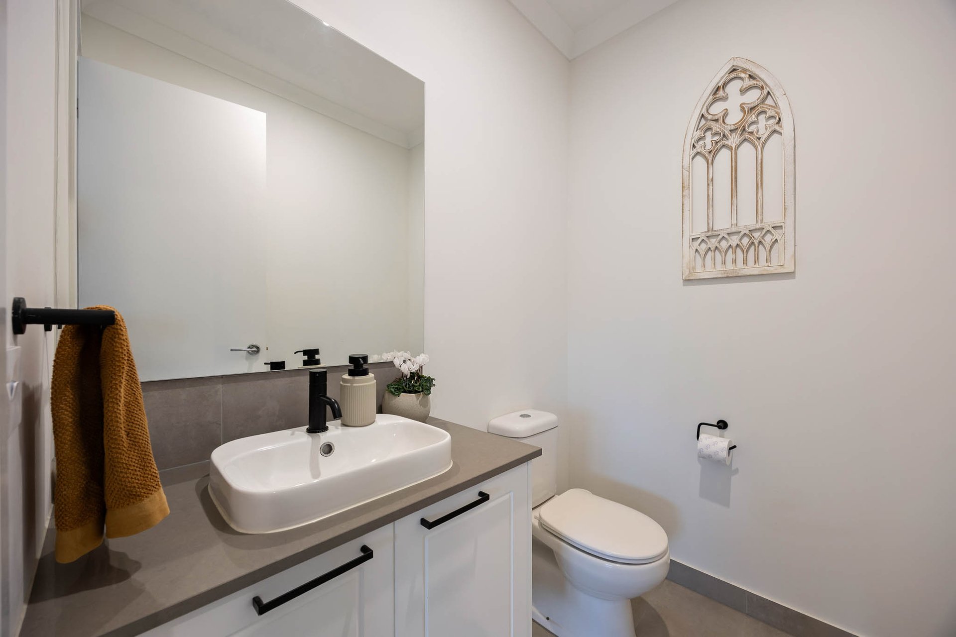Accommodation comprises three bedrooms, each finished with pure wool carpet. The main bedroom is appointed with a dressing-room-scale walk-in robe and a luxurious ensuite featuring a twin stone vanity, niched double shower, and matte black fittings within a calm, cohesive palette. The remaining two bedrooms, both king-sized with walk-in robes, are served by a main bathroom with niched shower and bath, alongside a powder room.