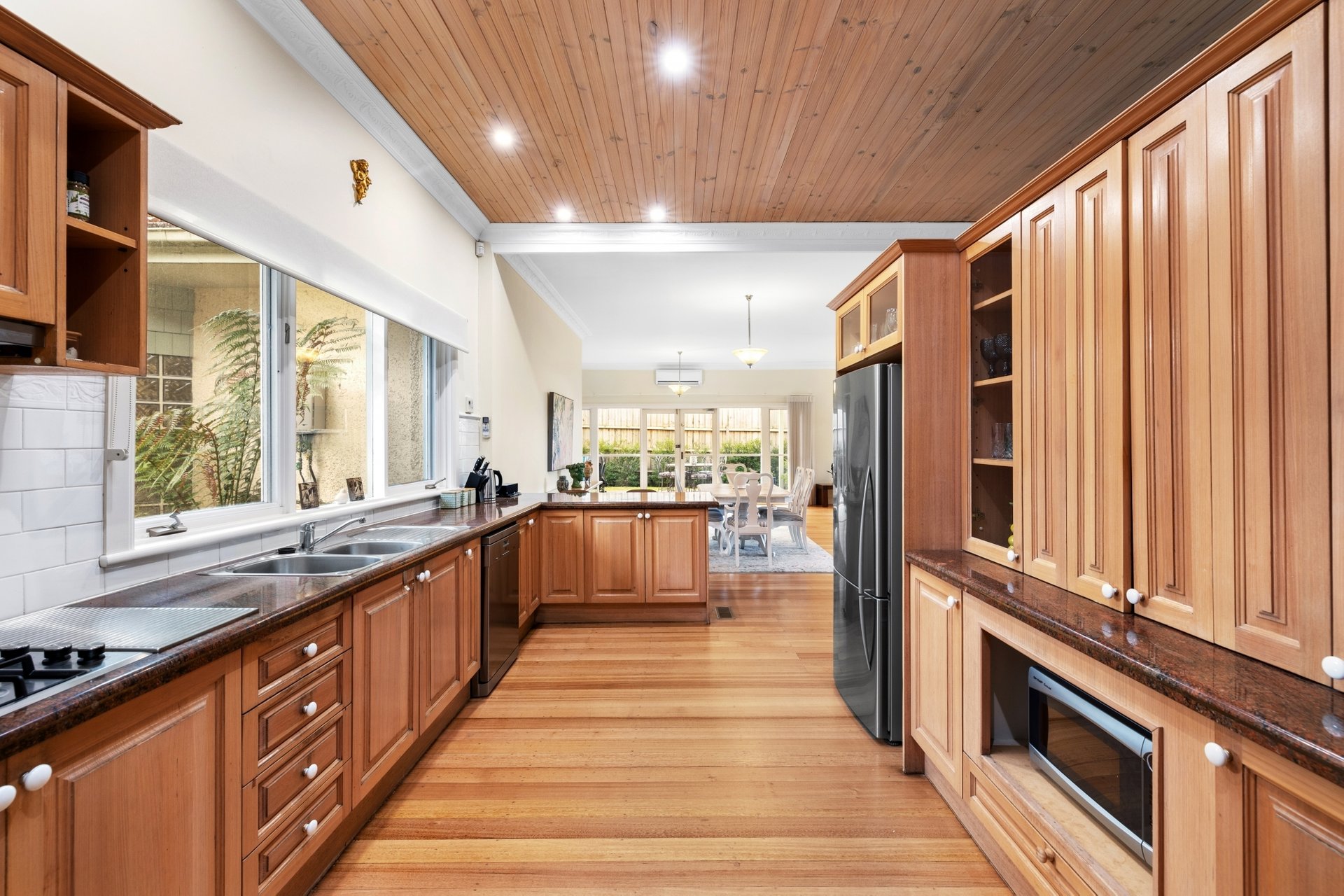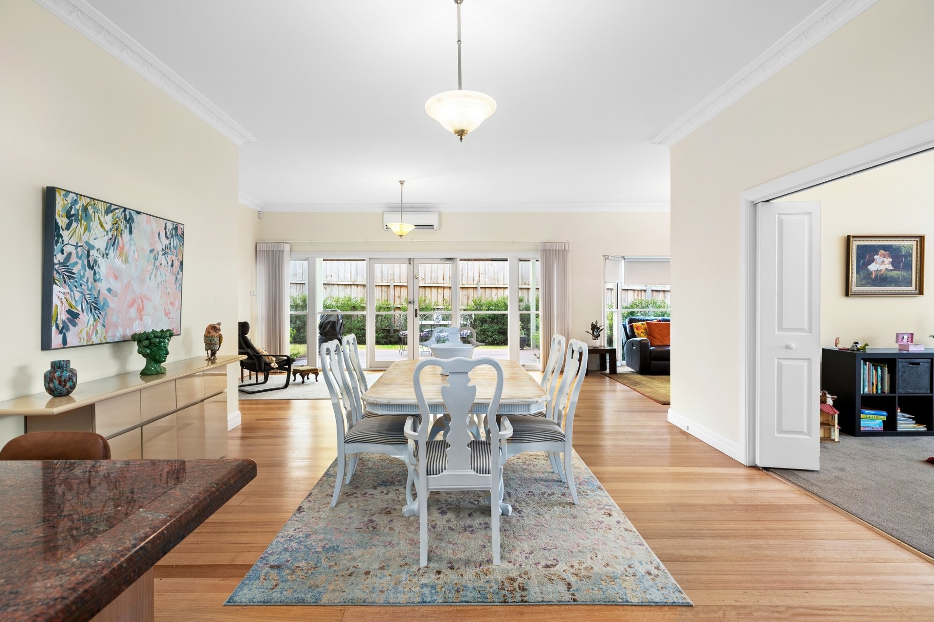 Inside, a graceful sequence of spaces unfolds across one level: formal lounge and dining rooms divided by French doors, a sitting area and a sun-soaked conservatory with reflective film. At the heart of the home, a timber kitchen stands with pride, appointed with stainless steel appliances, granite benchtops and abundant storage. It overlooks an expansive family and meals area that flows through French doors to a covered alfresco deck.