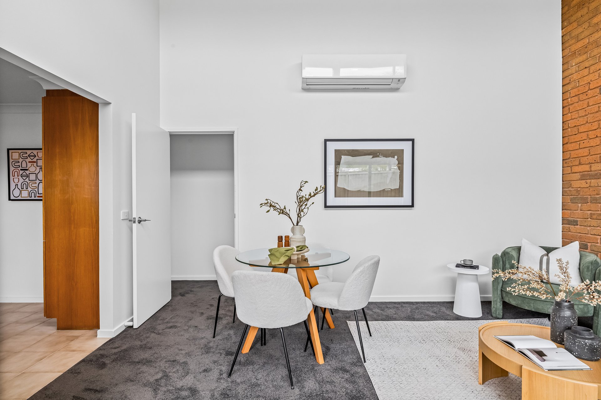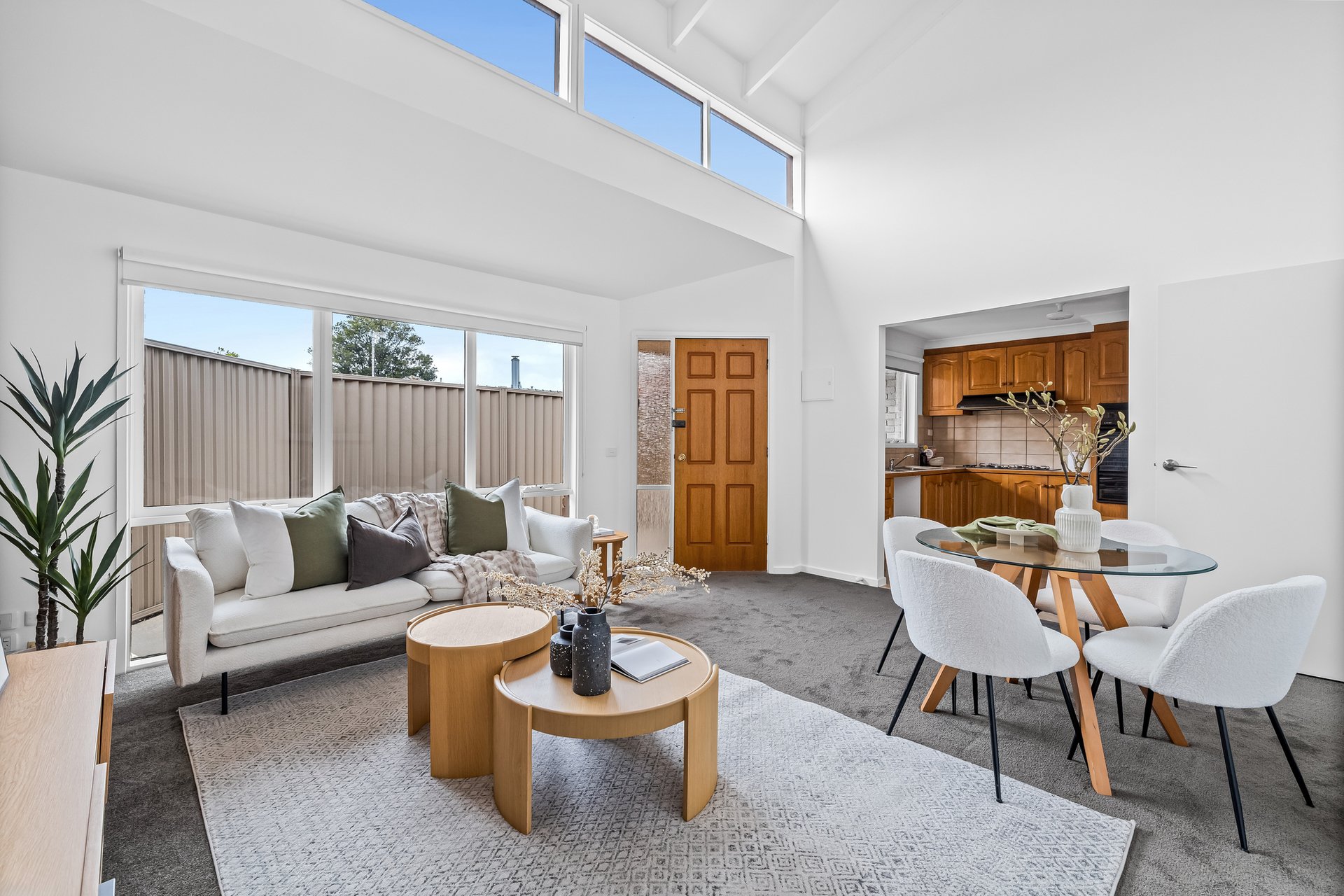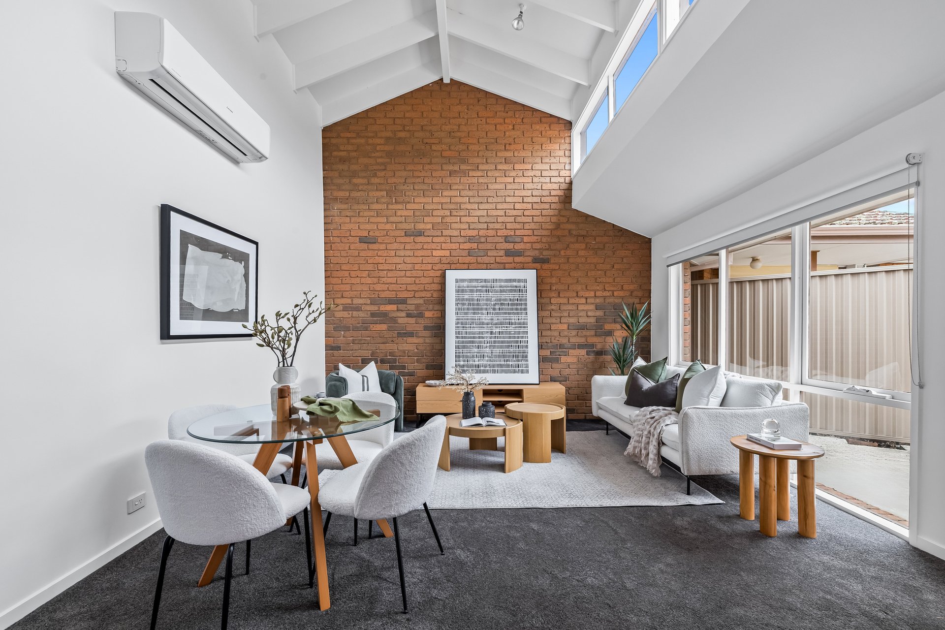 Inside, the home welcomes you with a light-filled living area enhanced by soaring high ceilings and brand-new carpet, creating an immediate sense of space and warmth. The adjoining open-plan kitchen flows seamlessly into the living zone, offering a practical and inviting layout for everyday living and entertaining. Year-round comfort is assured with both heating and cooling.