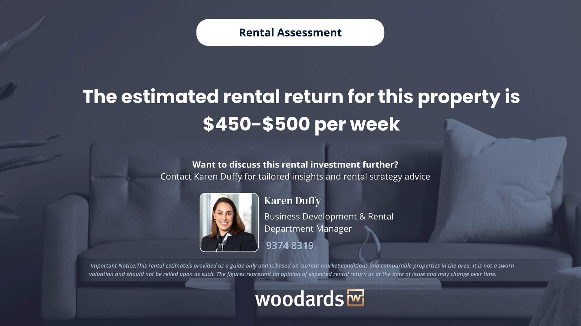 Two generous bedrooms are fitted with built-in robes and serviced by a central bathroom, while a separate laundry adds further functionality. At the rear, a large private courtyard provides an excellent setting for entertaining. Adding further appeal is an extra-large single garage, offering secure off-street parking as well as valuable storage space.