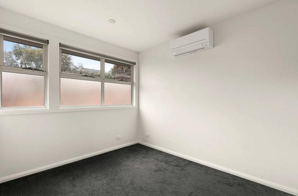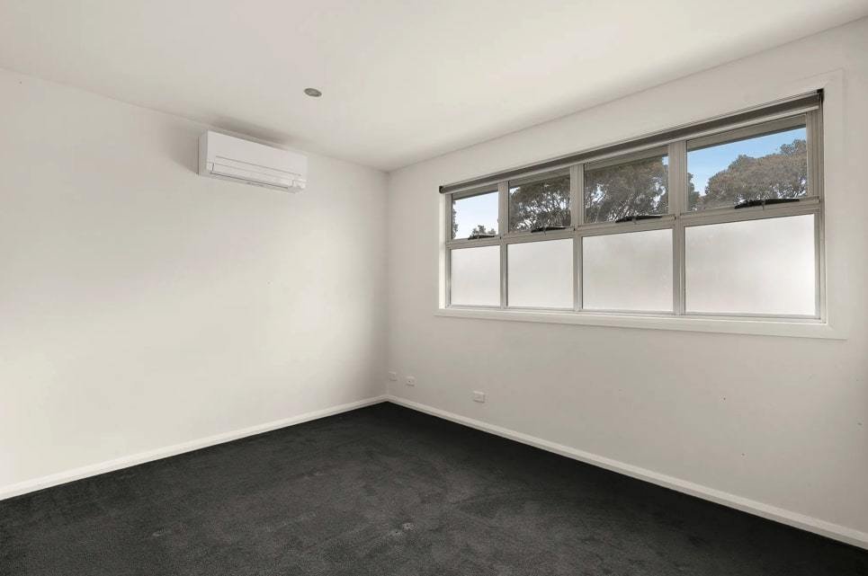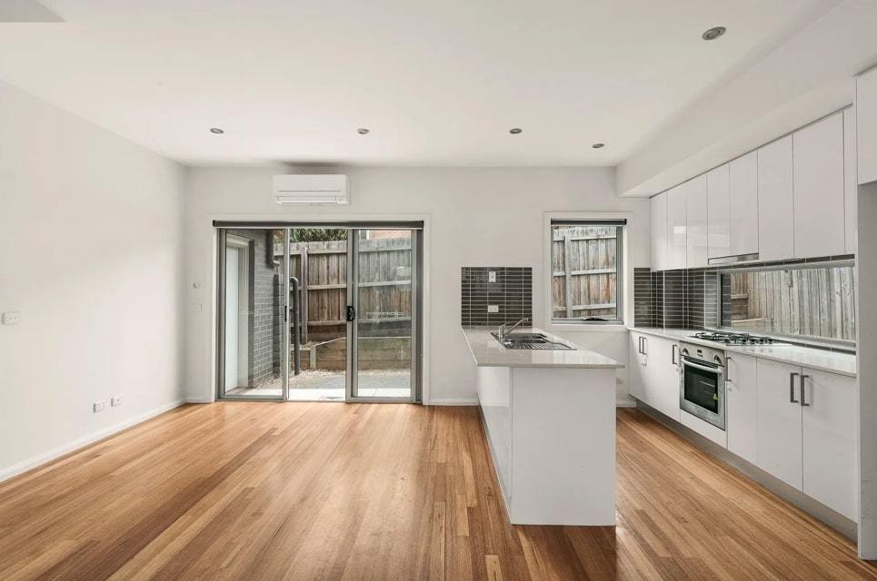 Inside, the home features an open plan living, dining and kitchen area fitted with a dishwasher, stainless steel oven and gas cooktop. Three generous bedrooms each include built-in robes and split systems for year-round comfort, while a central bathroom with shower and toilet services the upper level. A separate laundry connects to a convenient powder room downstairs. The low maintenance yard provides space to relax with a clothesline and direct access to a single remote garage, completing a property designed for easy modern living in one of Melbourne's most accessible suburbs.