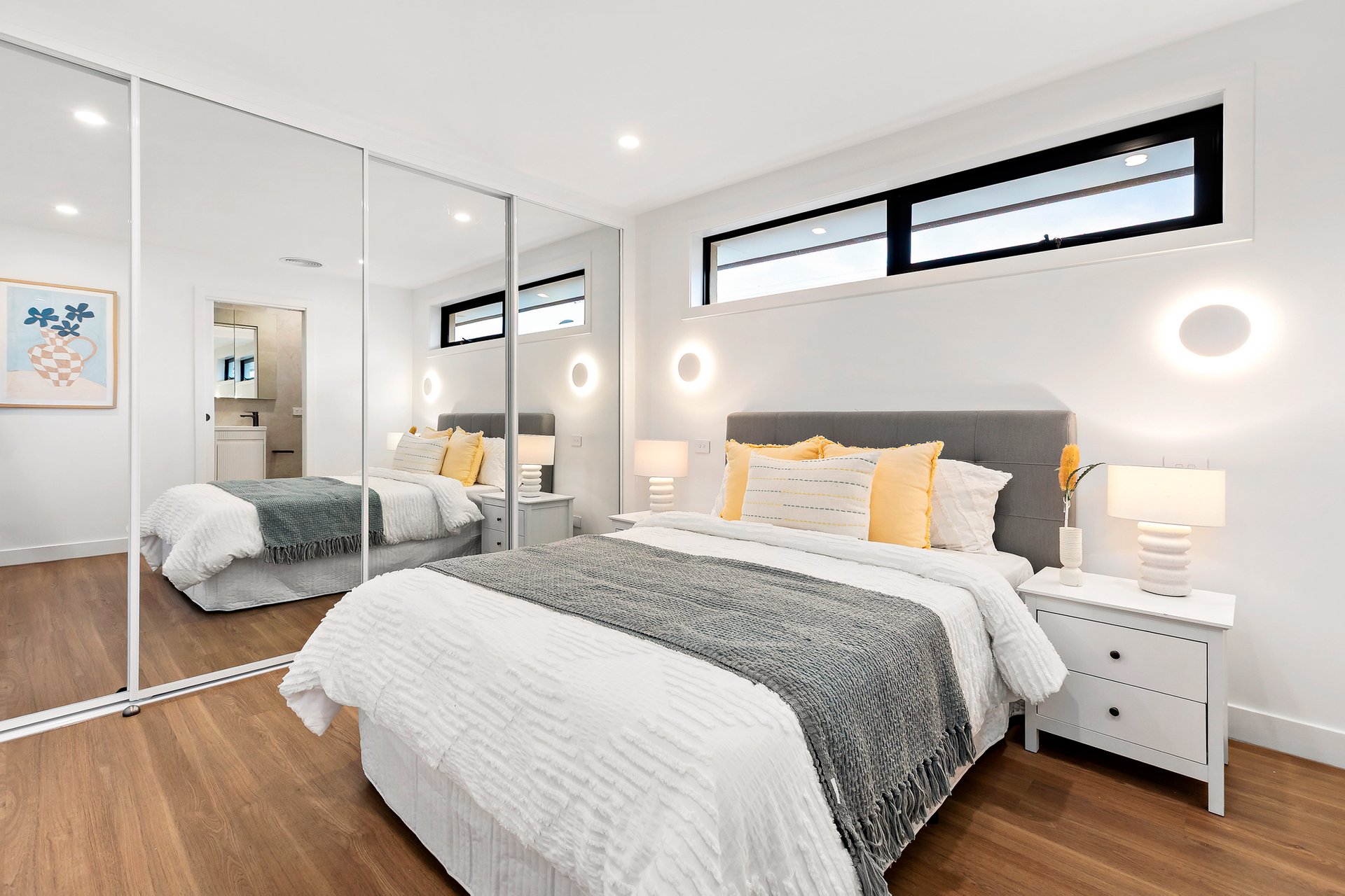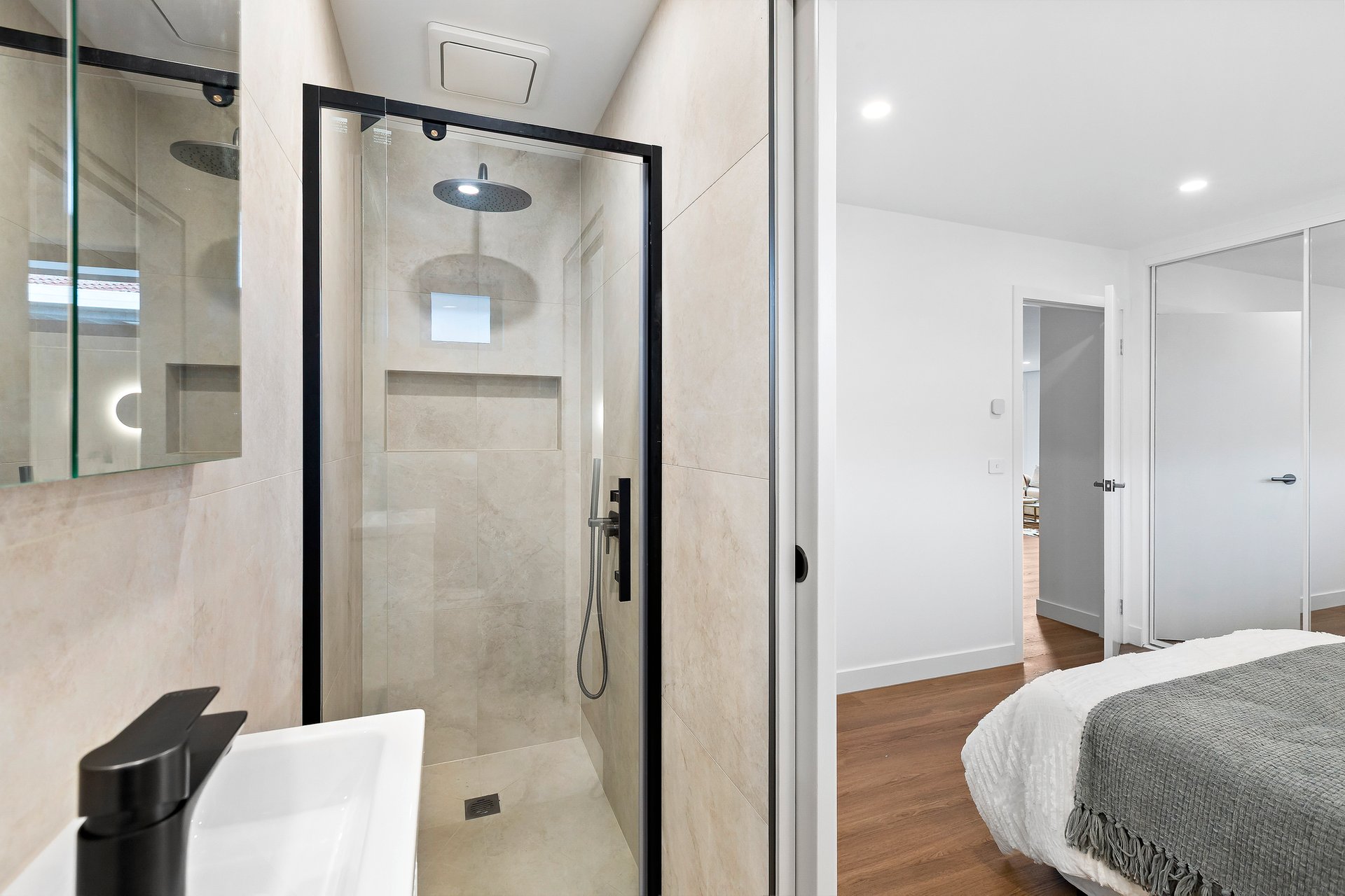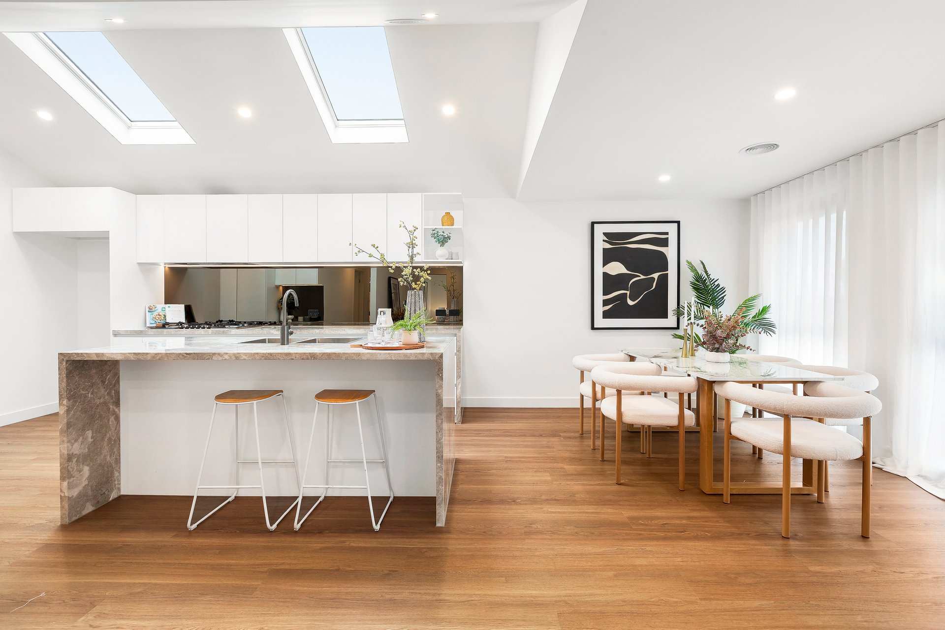 The accommodation is headlined by a luxurious master retreat featuring a beautifully appointed ensuite, while two additional well-sized bedrooms with custom wardrobes share a sleek, modern central bathroom and a convenient separate powder room. Every detail has been considered for year-round comfort, from the dual-zoned refrigerated heating and cooling to the whisper-quiet double-glazed windows and remote-controlled Velux skylights.
