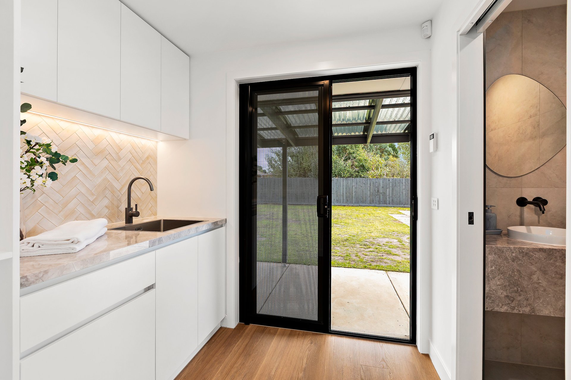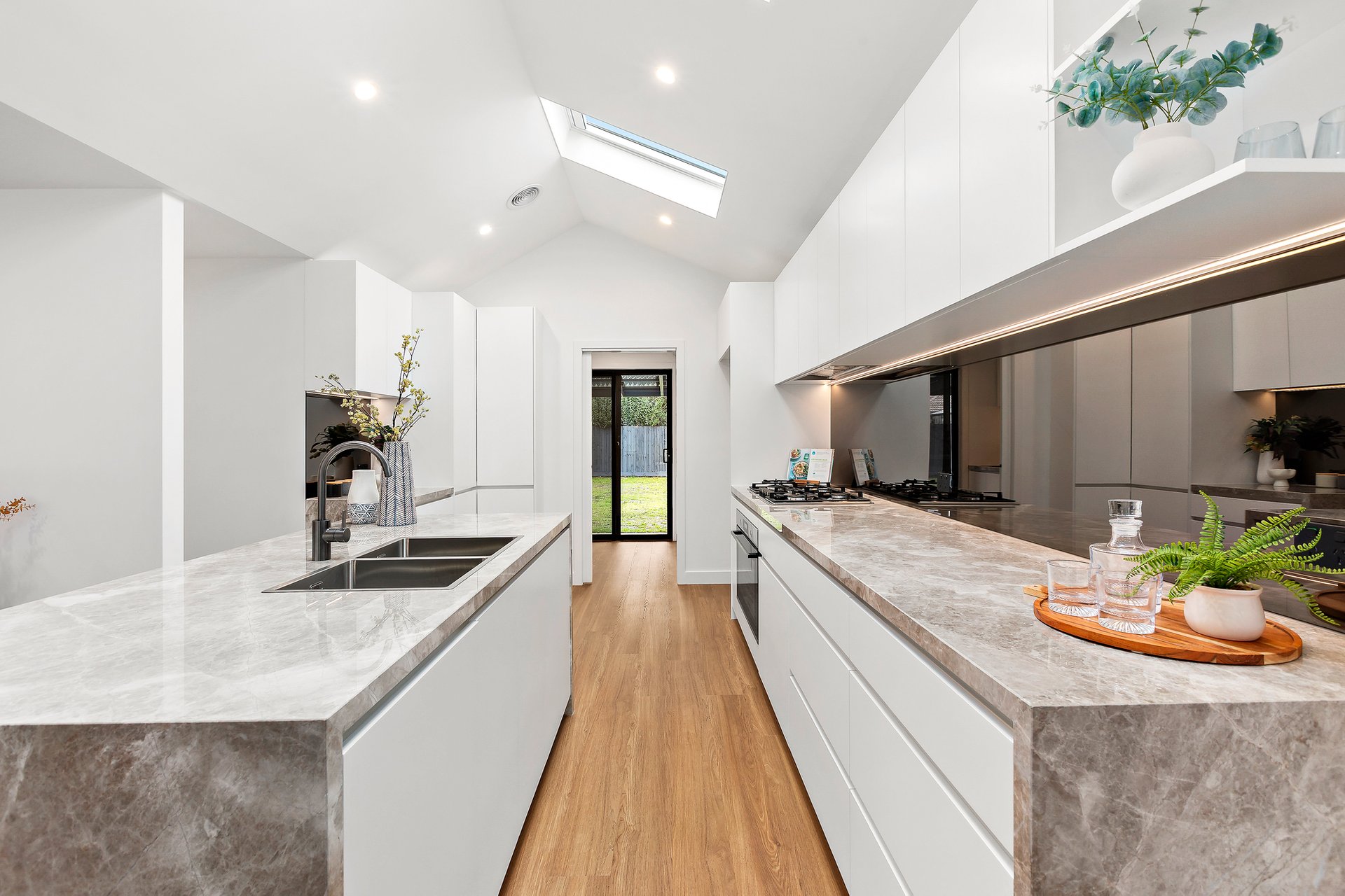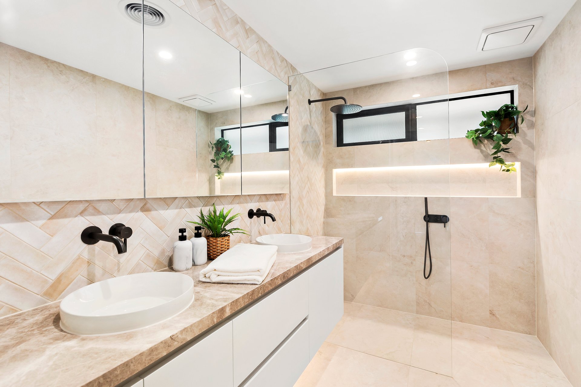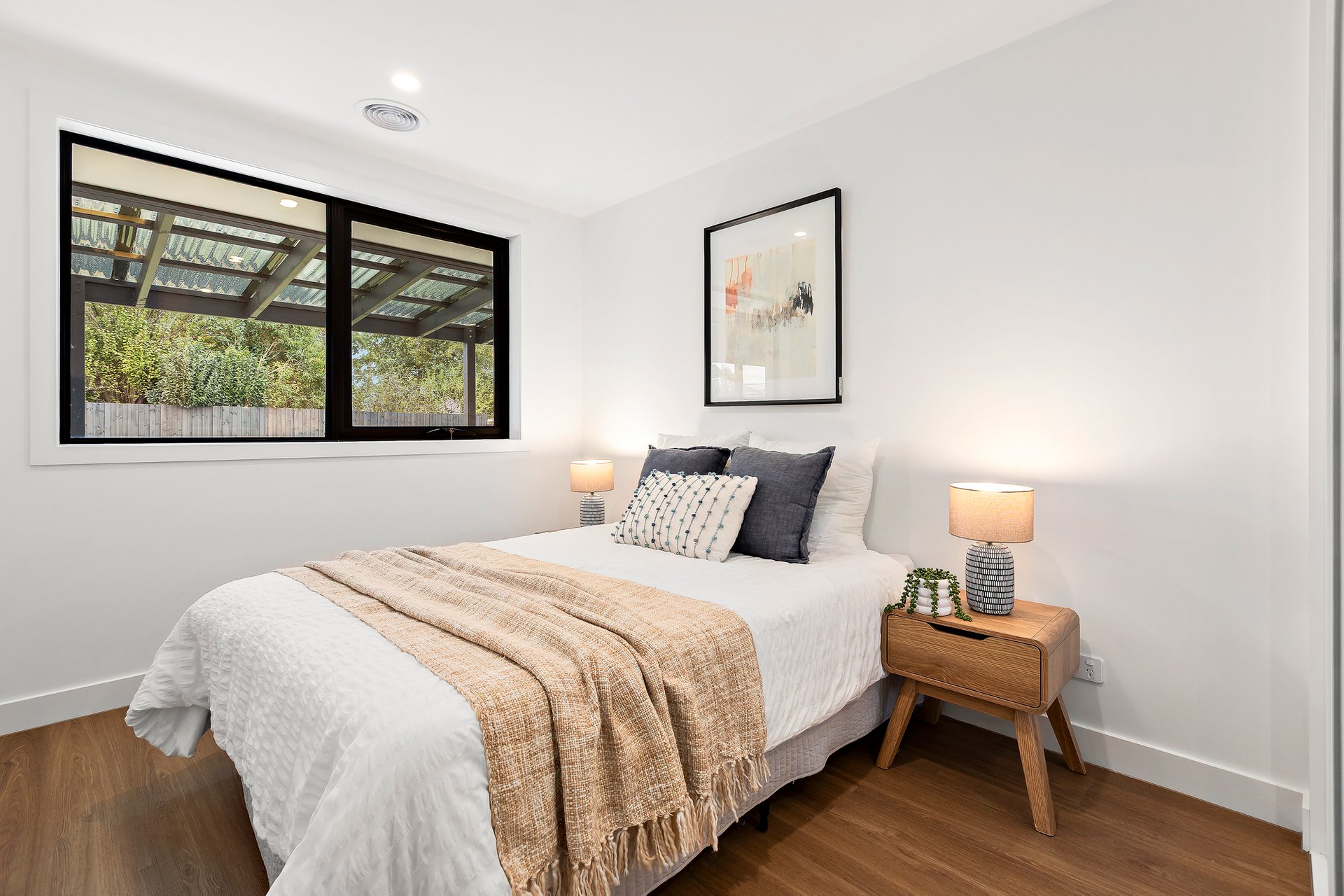The accommodation is headlined by a luxurious master retreat featuring a beautifully appointed ensuite, while two additional well-sized bedrooms with custom wardrobes share a sleek, modern central bathroom and a convenient separate powder room. Every detail has been considered for year-round comfort, from the dual-zoned refrigerated heating and cooling to the whisper-quiet double-glazed windows and remote-controlled Velux skylights.