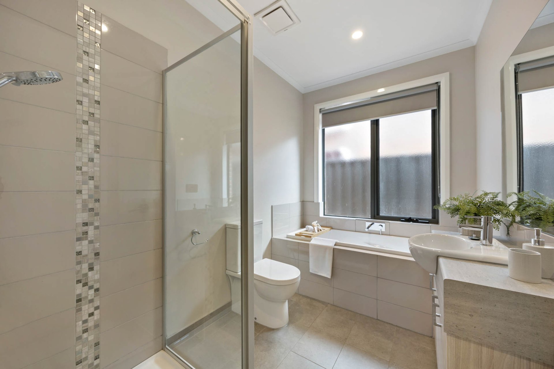Three carpeted bedrooms provide comfortable accommodation, each with built-in robes. The main bedroom enjoys a private ensuite with a glass-framed shower, mosaic tile detailing, under-bench vanity storage and a large mirror. A central bathroom with a shower and bath serves the remaining bedrooms.
