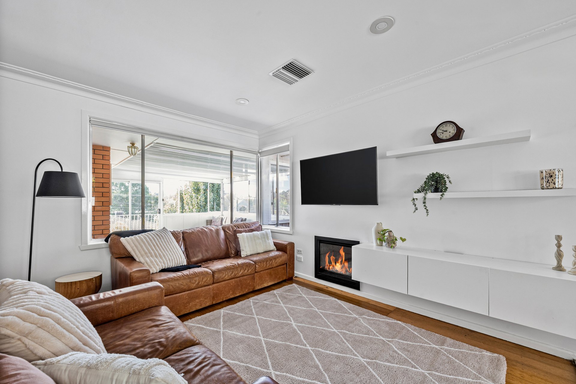 Comfort and efficiency are key, with refrigerated heating and cooling throughout, complemented by a gas fireplace that adds warmth and ambience to the main living zone, while solar panels contribute to long term energy savings.