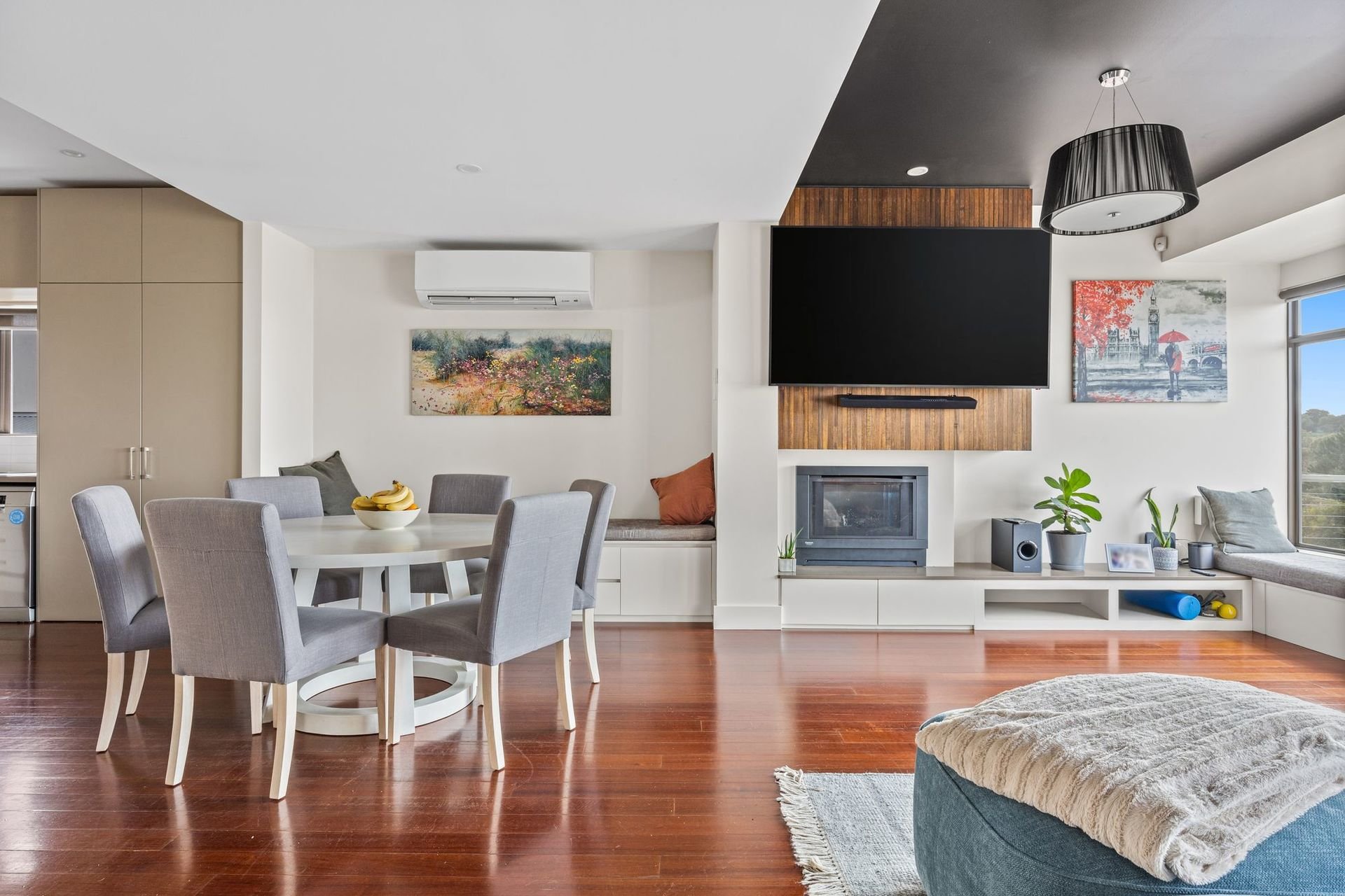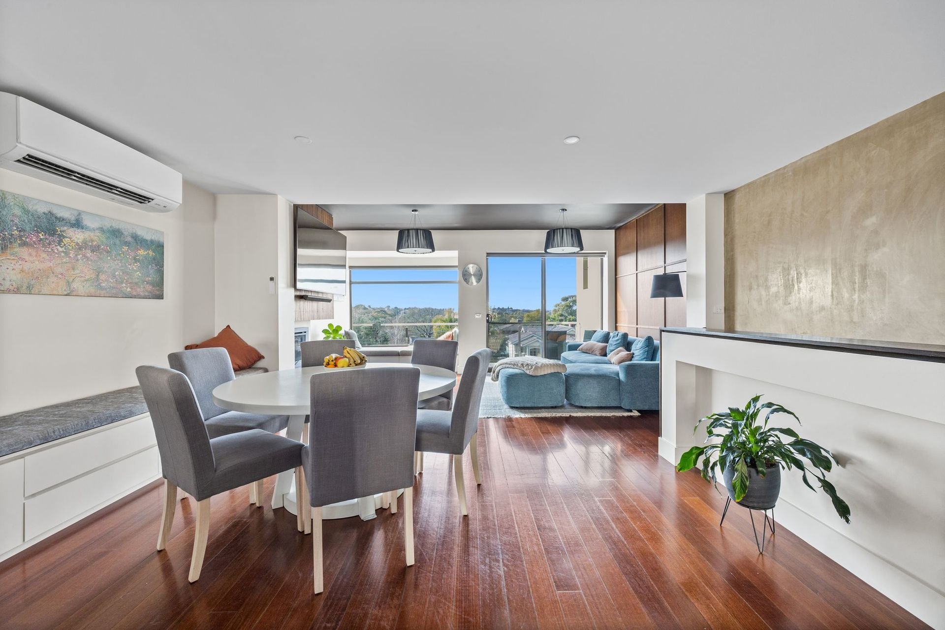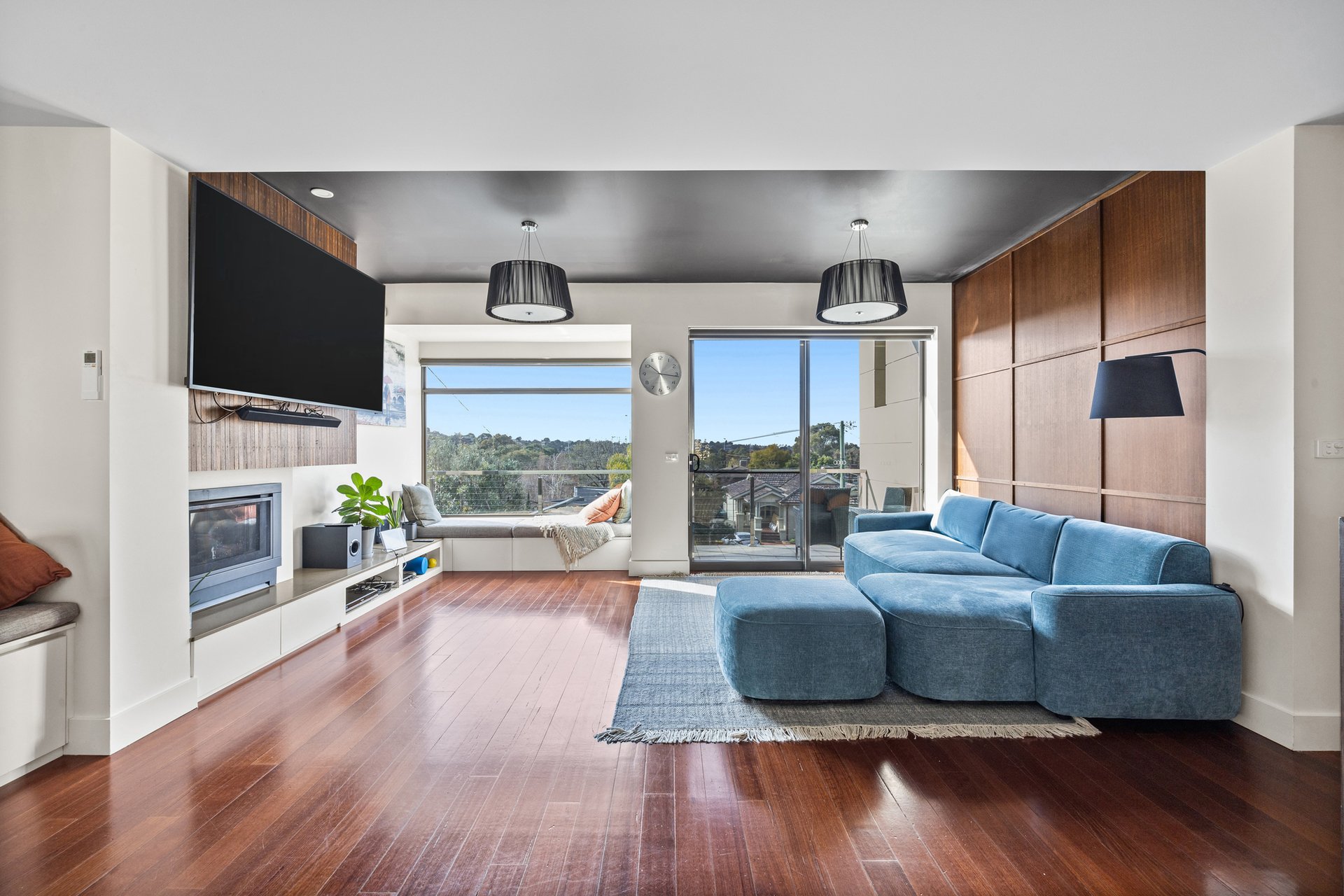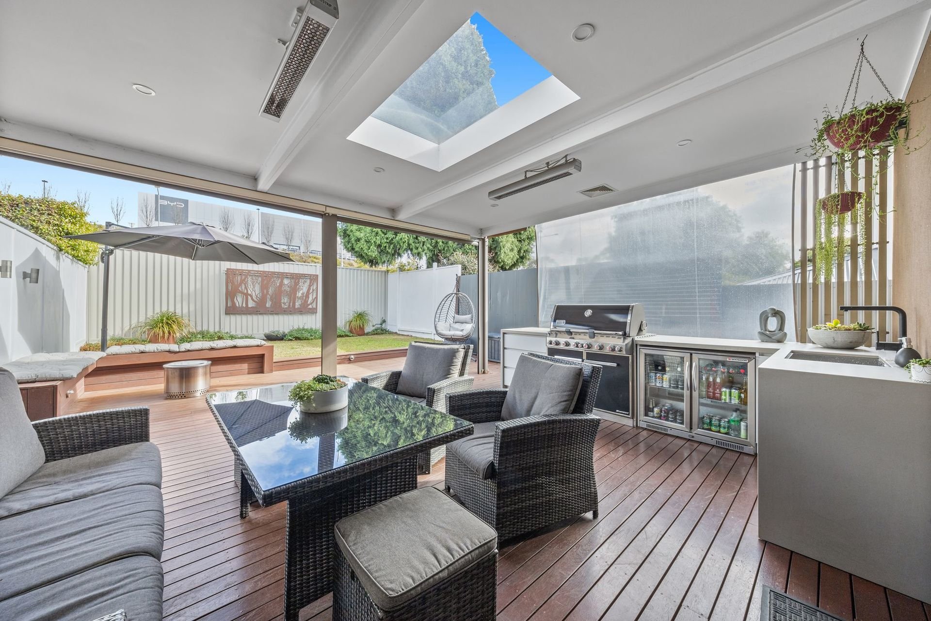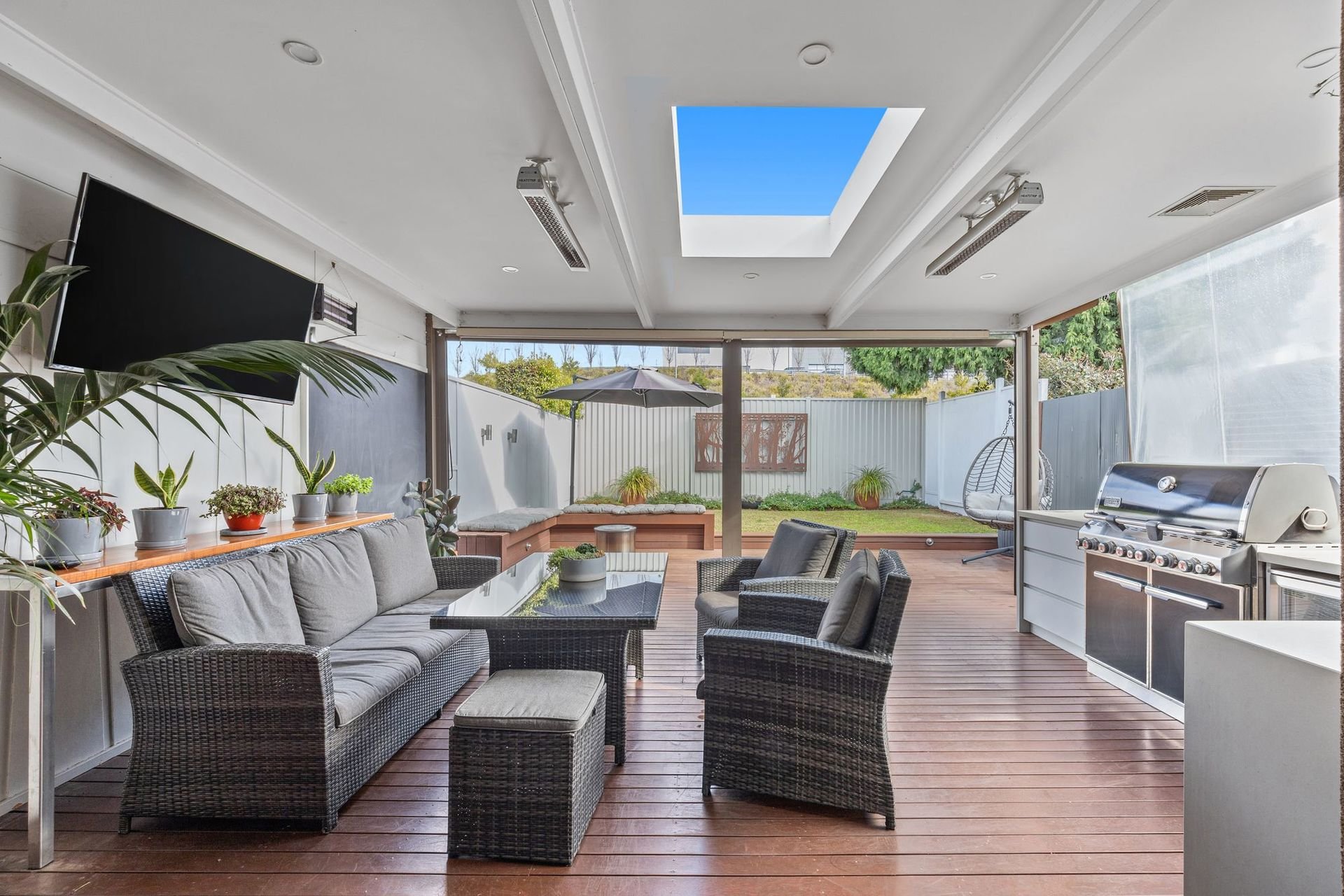 Step outside to an entertainer's haven, a large alfresco deck with café blinds, strip heaters and an integrated Weber Summit BBQ kitchen, overlooking a sunny, private garden framed by high fencing. A wide front balcony captures picturesque valley views, while a secure front terrace offers another spot to enjoy morning coffee or evening relaxation.