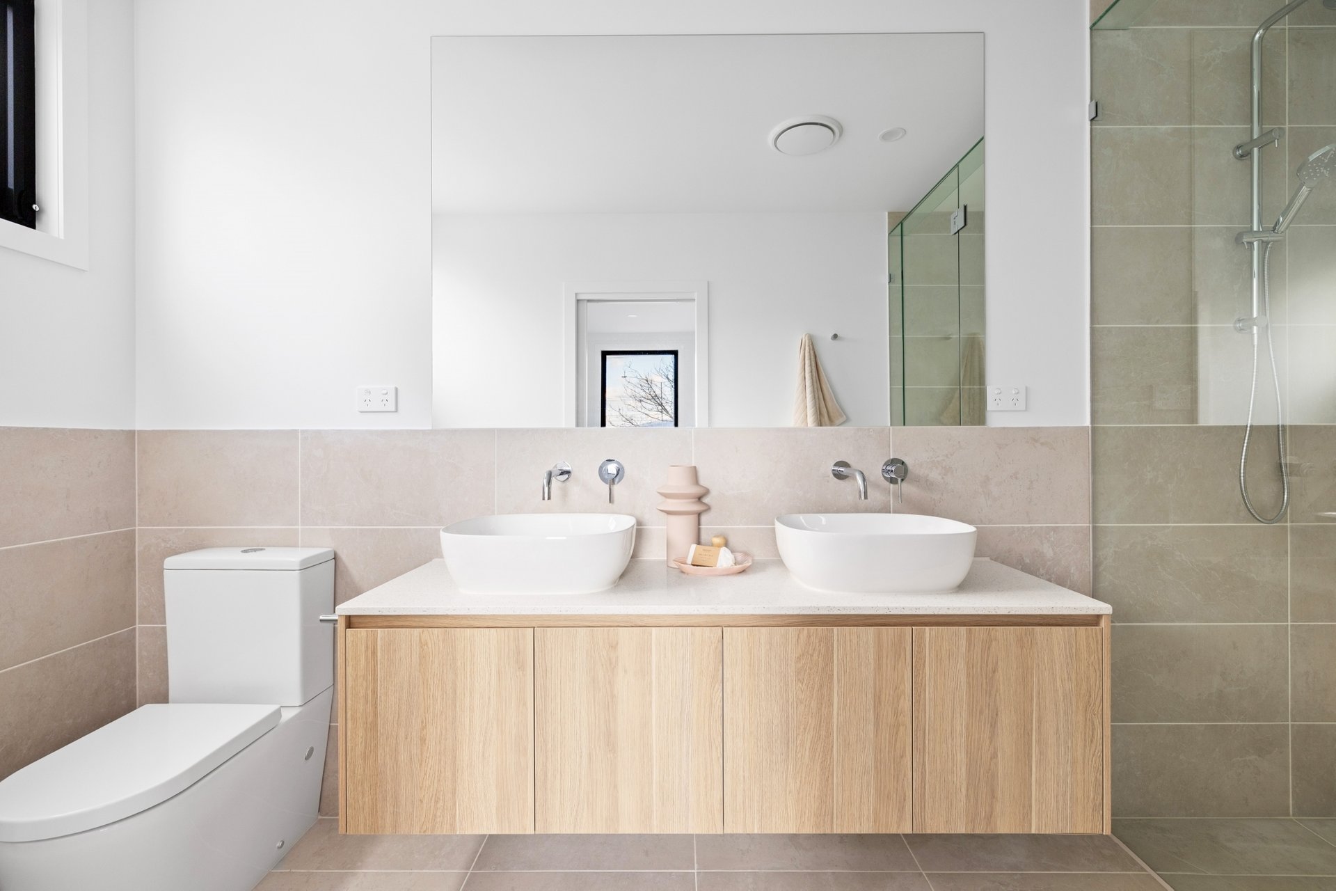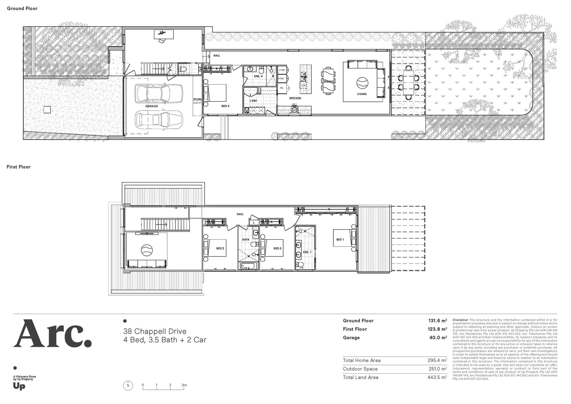 Four generously sized bedrooms with built-in wardrobes are complemented by three bathrooms defined by a clean, minimal aesthetic. This includes a master suite on each floor, offering flexibility for multi-generational families or guests.