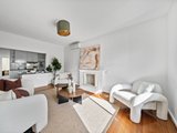 The warm and inviting living area features timber flooring and a refrigerated cooling system, seamlessly connected to the kitchen. The kitchen’s open-plan layout includes a breakfast bar dividing it from the living zone, providing functionality and everyday convenience.