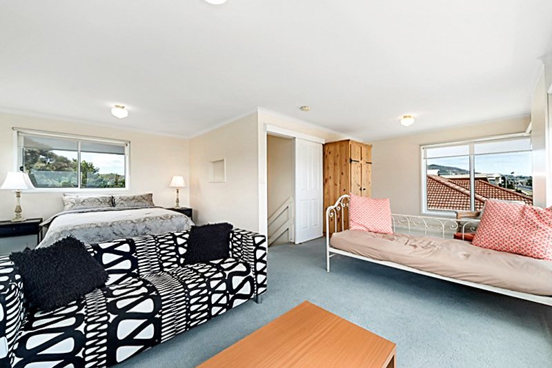 The lower level houses three well-appointed bedrooms, all of which are serviced by a centralised bathroom, providing a private and peaceful retreat for family or guests. Ascend to the upper sanctuary where the master suite resides, offering a walk-in robe, a personal ensuite, and an intimate sitting area. This haven is complemented by sweeping bay views, allowing residents to revel in the picturesque scenery through all seasons.
