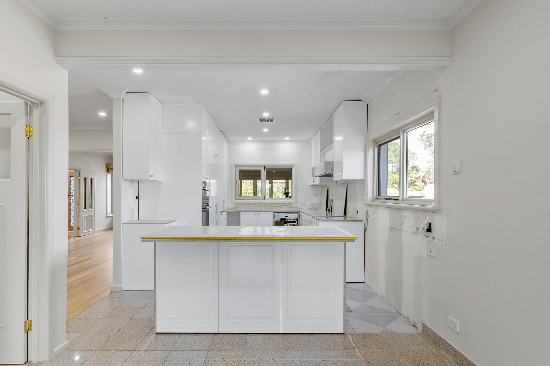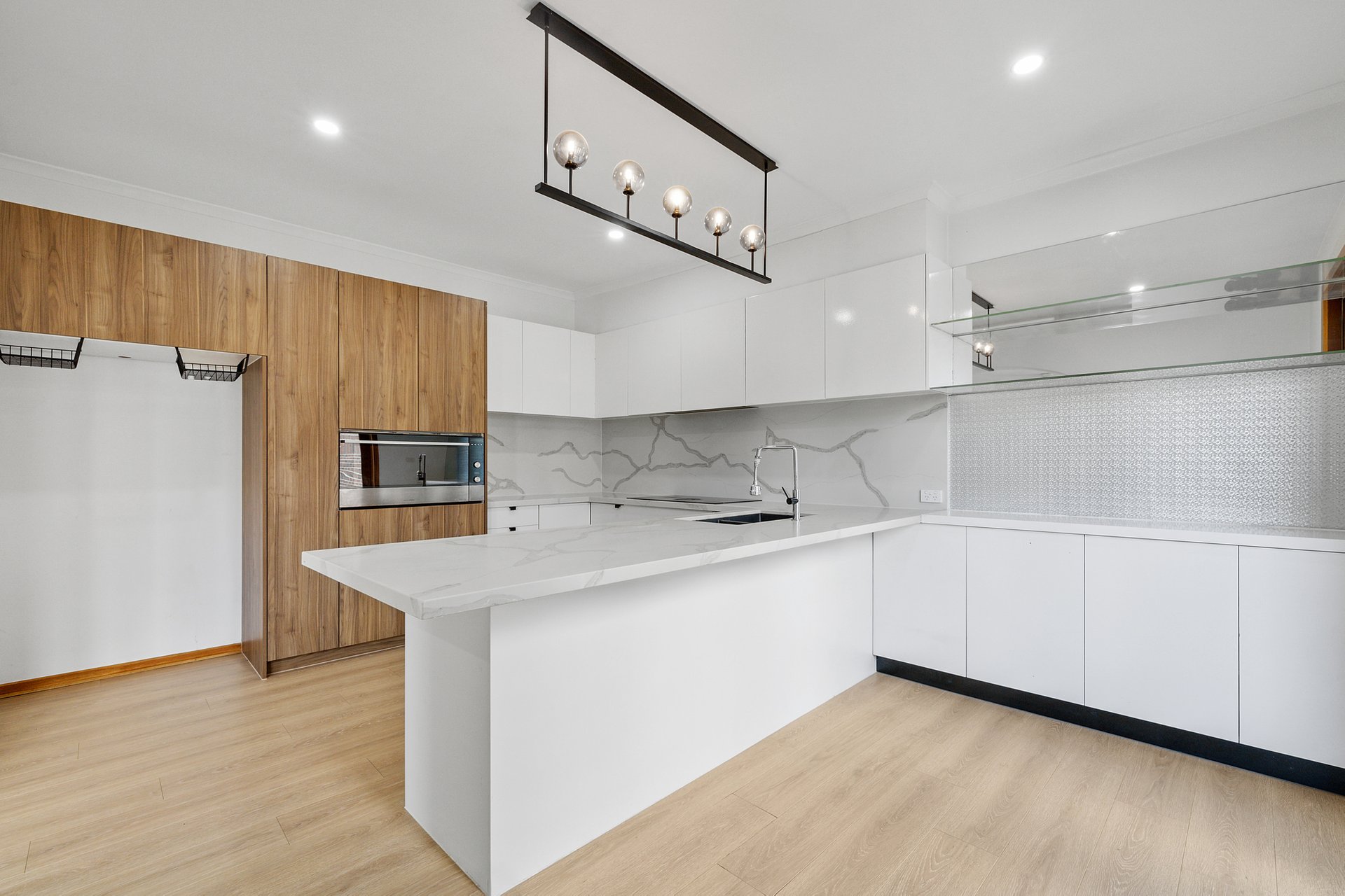 The main living domain features an open plan kitchen and meals flowing seamlessly into the dining and living areas, creating a central hub ideal for everyday family life. Timber and tiled flooring provide warmth and durability, while LED downlights enhance the clean, modern aesthetic. A sunroom adds further versatility, offering a light filled retreat or additional living zone.