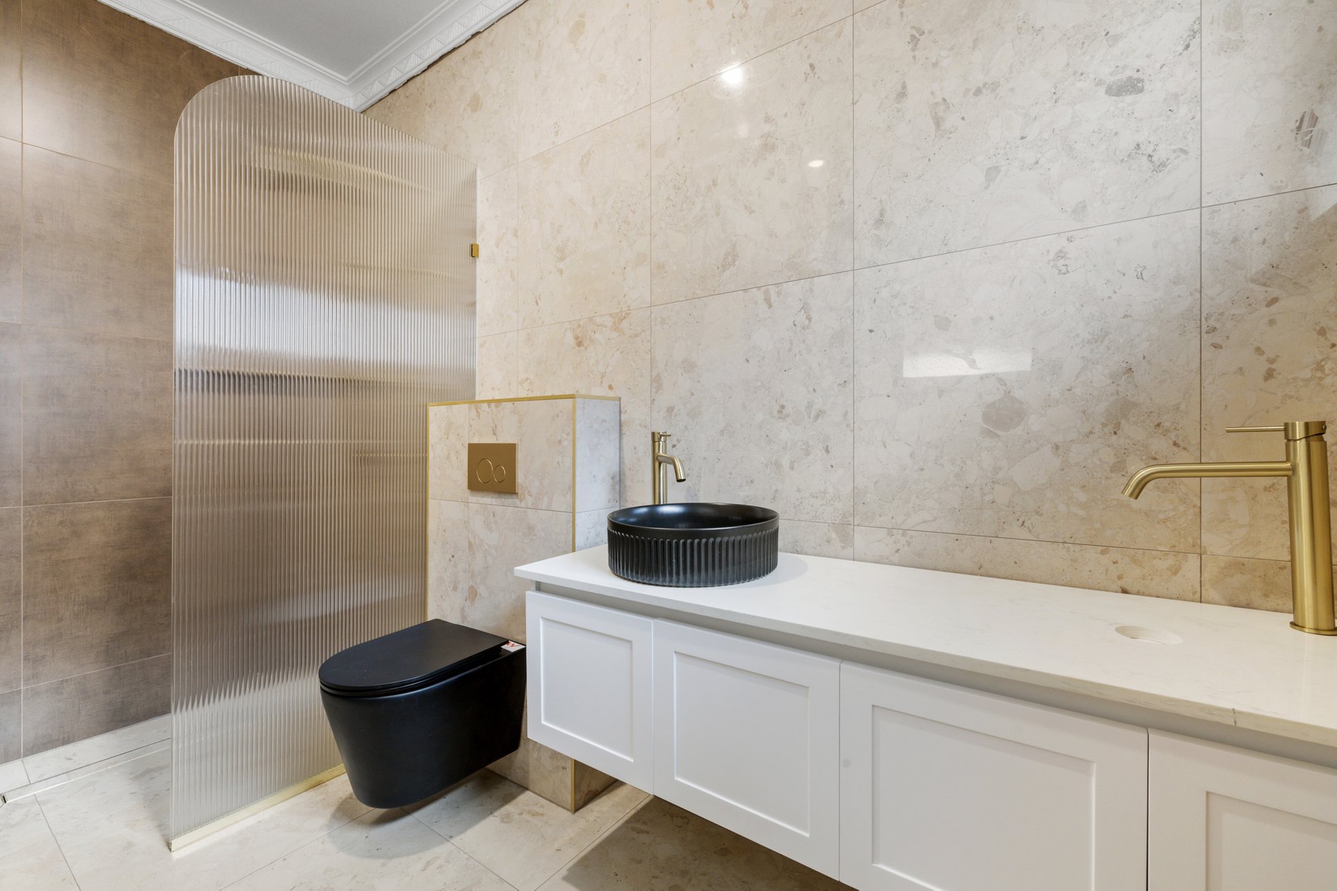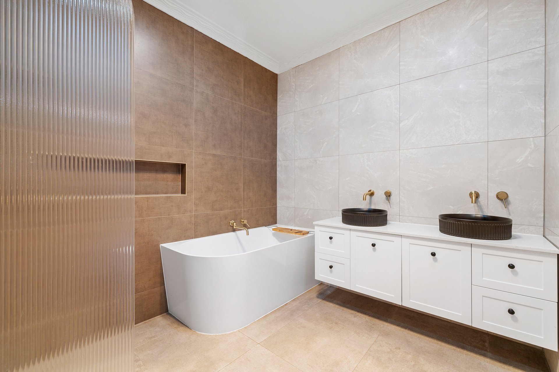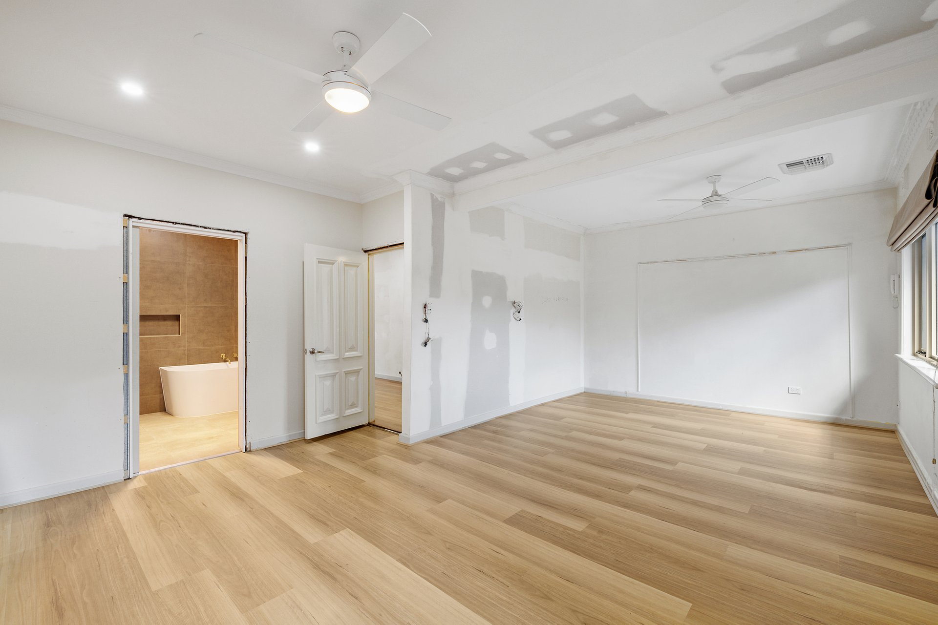 Accommodation includes three bedrooms within the main residence, supported by three bathrooms and two powder rooms positioned across both levels. The updated main bathroom showcases floor to ceiling tiling, a walk in shower, and floating double vanity, delivering a sleek and contemporary finish. Understairs storage, ceiling fans, and quality finishes further enhance everyday practicality.