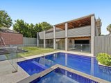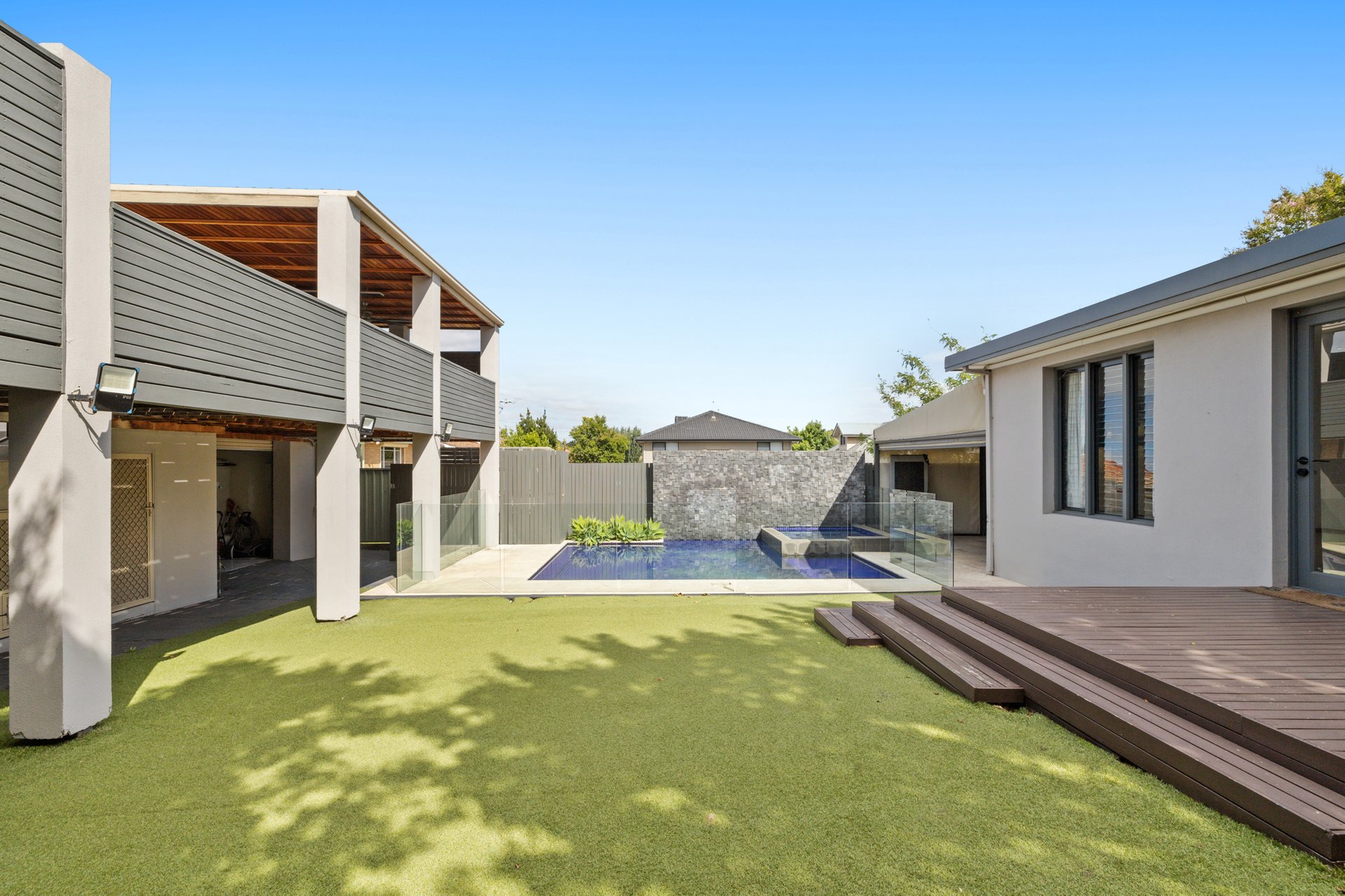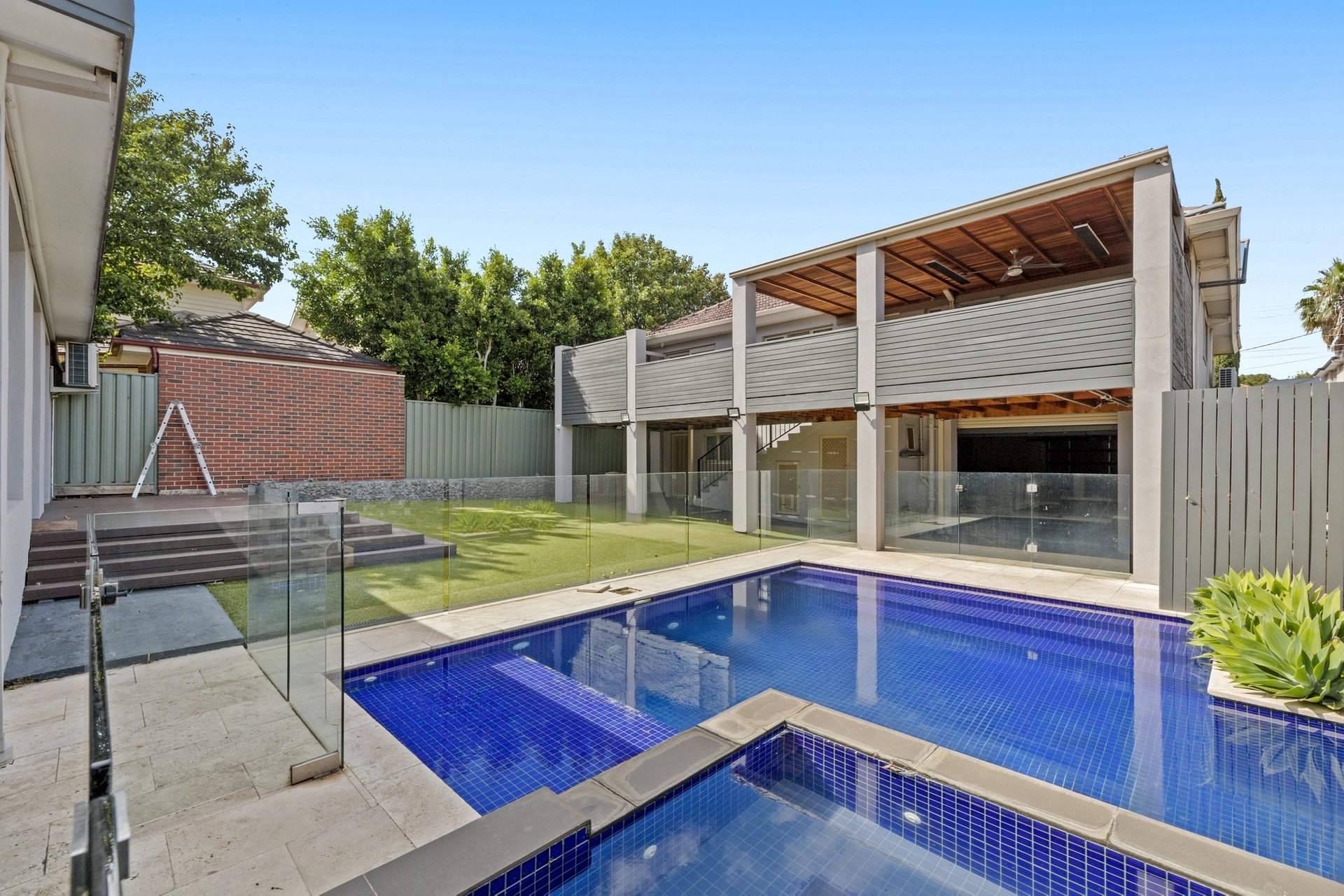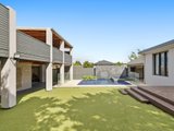 Outdoor entertaining is a standout feature. The alfresco and entertainment area includes an outdoor kitchen and overlooks a pool and spa enclosed by glass fencing, creating a private and luxurious setting. The low maintenance gardens complement the lifestyle focus of the property.
