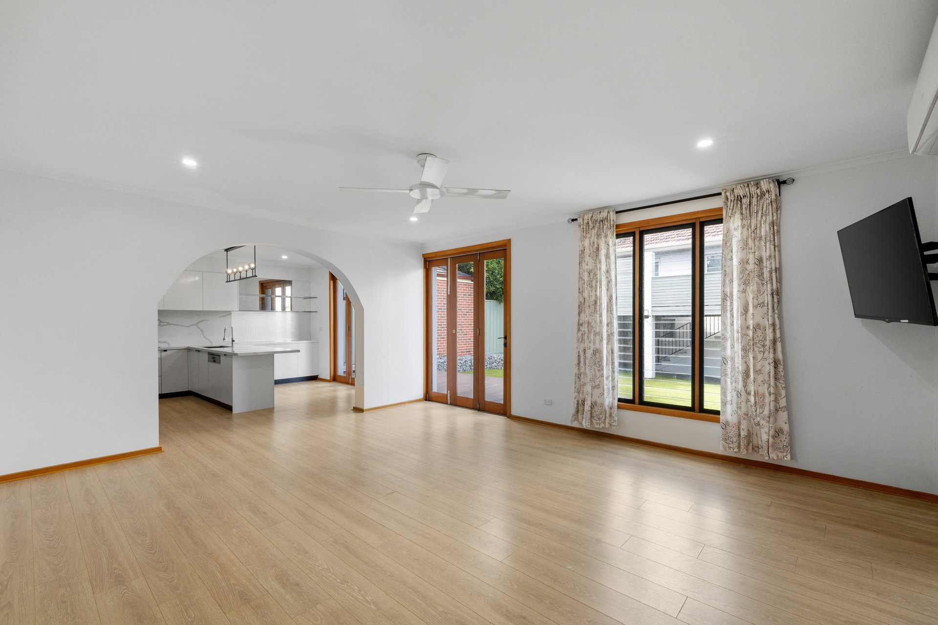 The kitchen integrates seamlessly with the open plan design, providing practical connection to both dining and entertaining spaces. Ceiling fans and reverse cycle heating and cooling ensure year round comfort throughout the home.