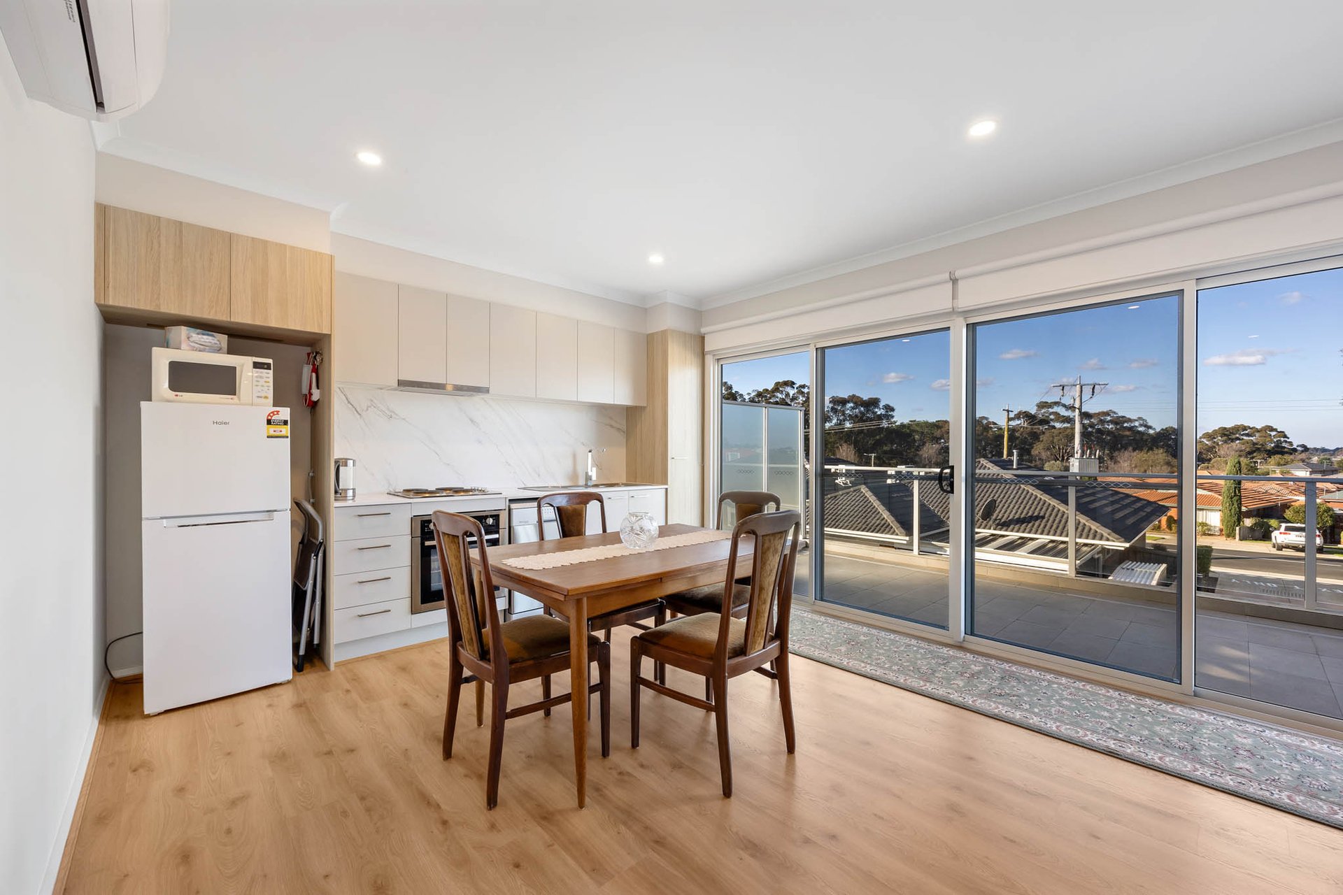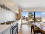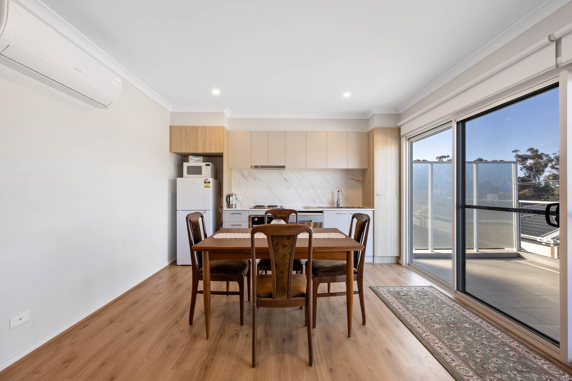 A well-considered floorplan places emphasis on space and flow, with the open-plan living, dining, and kitchen zone opening via glass sliding doors to a full-width balcony—ideal for entertaining or quiet reflection while enjoying impressive leafy district views. The kitchen is elegantly appointed with stone benchtops, a marble-effect splashback, and stainless steel appliances including a dishwasher.