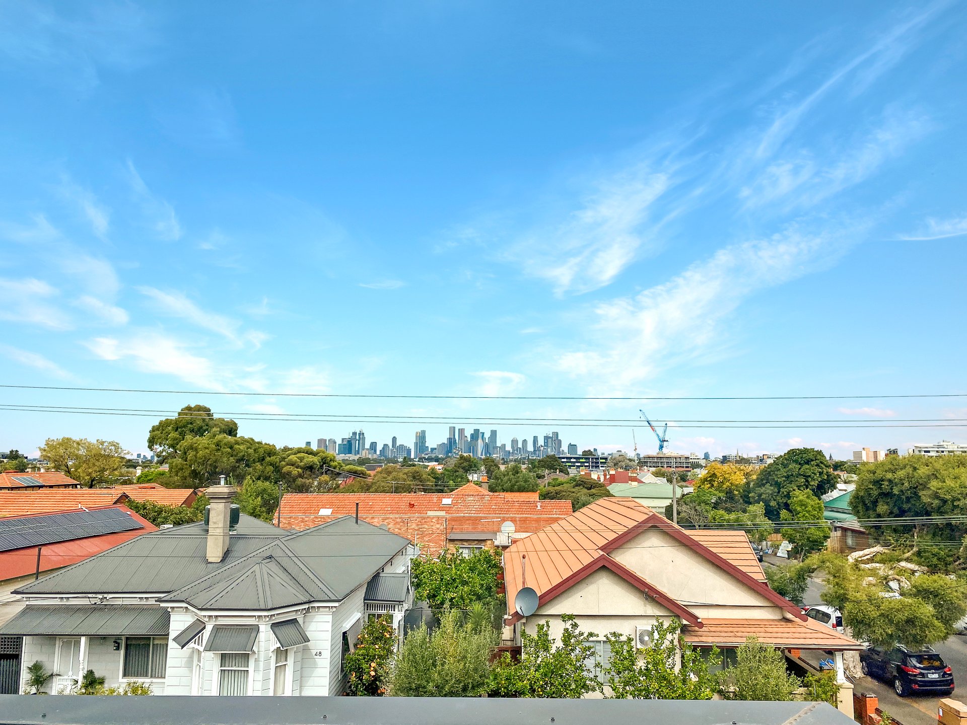 The first floor is bathed in natural light and showcases an open-plan living and dining area, complemented by a well-appointed entertainer’s kitchen with electric cooktop, integrated dishwasher, fridge and microwave, plus abundant bench space and storage. Enjoy stunning city views from this level, along with a private balcony — the perfect spot for your morning coffee.