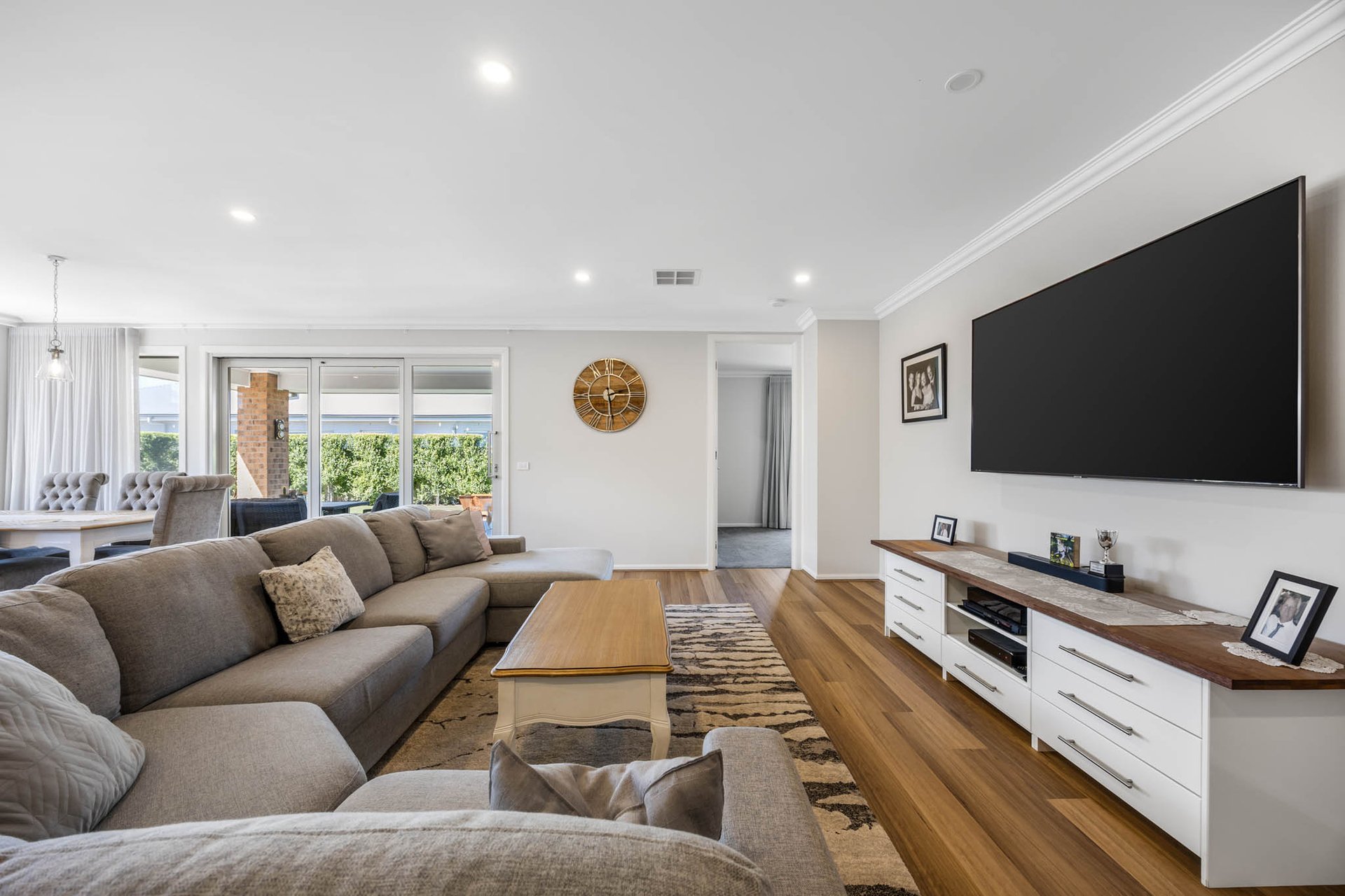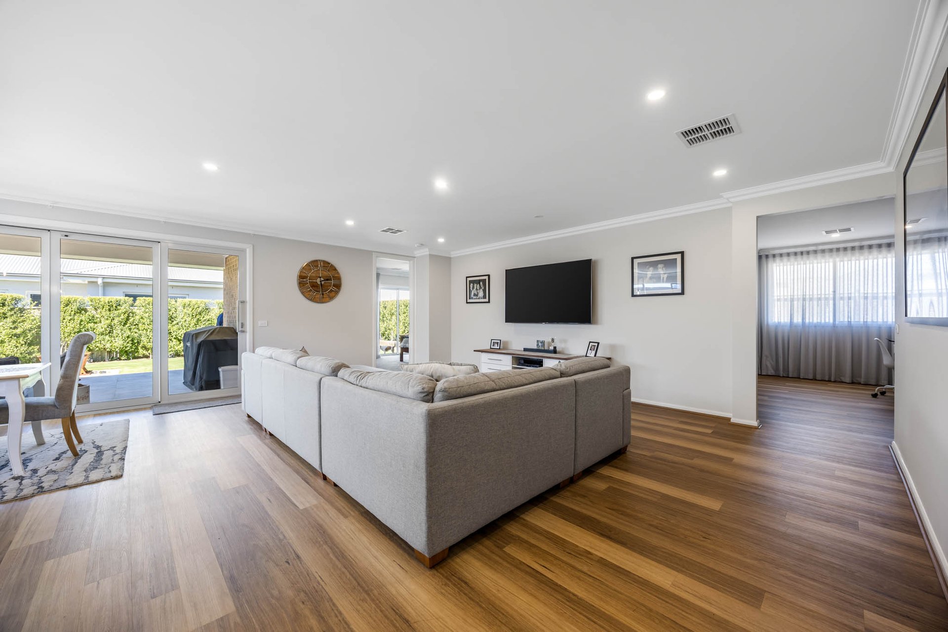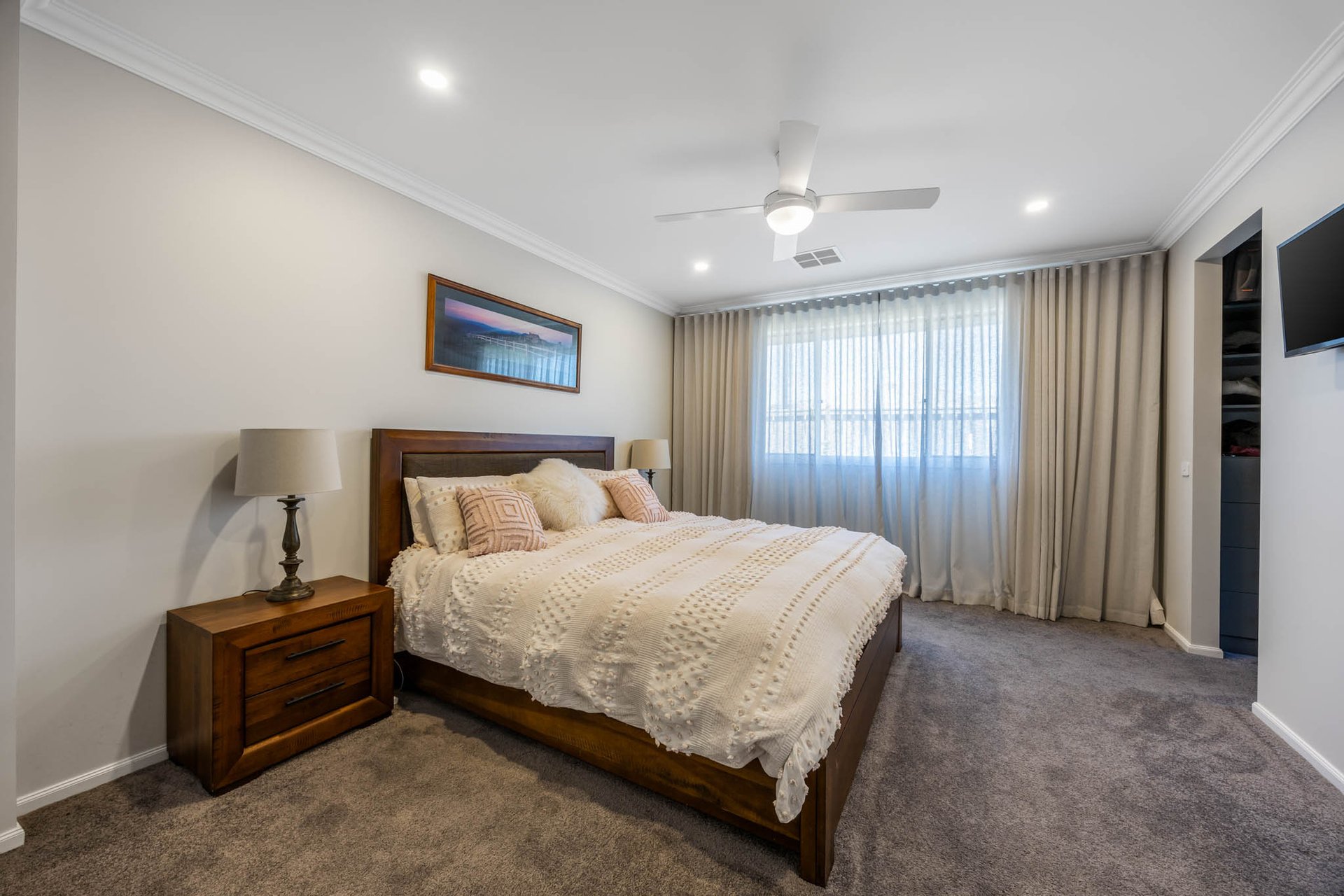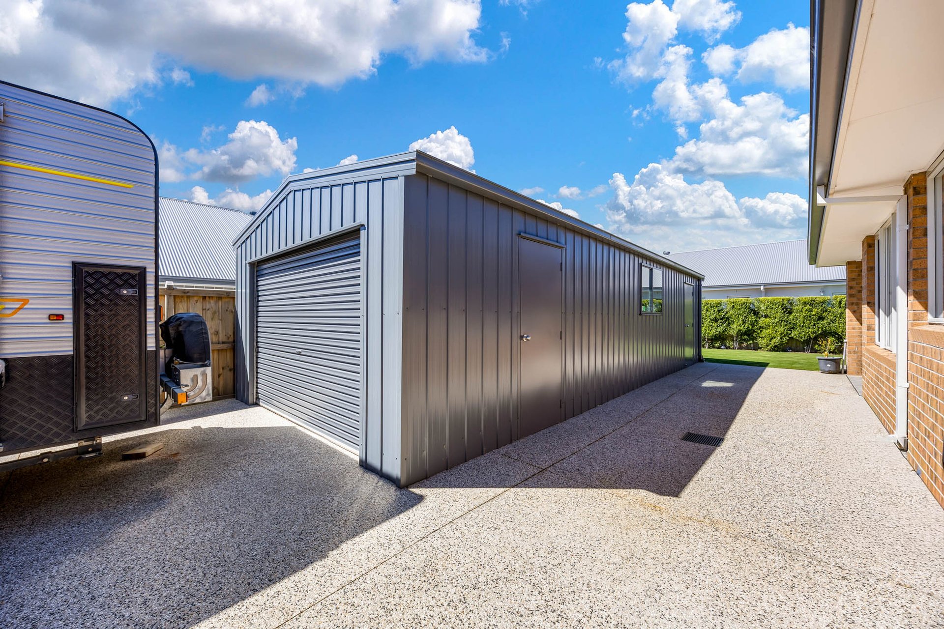 Practical excellence continues with an integrated remote-controlled double garage complemented by a gated side driveway to an aggregate-concrete driveway ideal for caravan or boat parking. A large, powered shed with a roller door and separate workshop room suits trades or hobbyists, and the corner allotment provides additional side gated access off Cotton Circuit. Further features include ducted heating, refrigerated cooling, floor-to-ceiling sheers and quality drapes, a 5,000-litre water tank, and fully irrigated grounds.