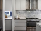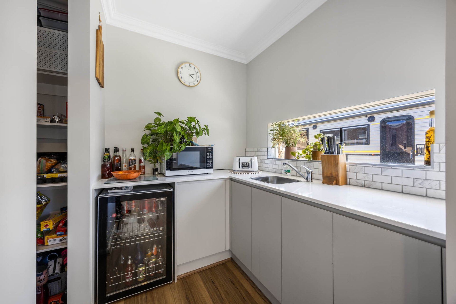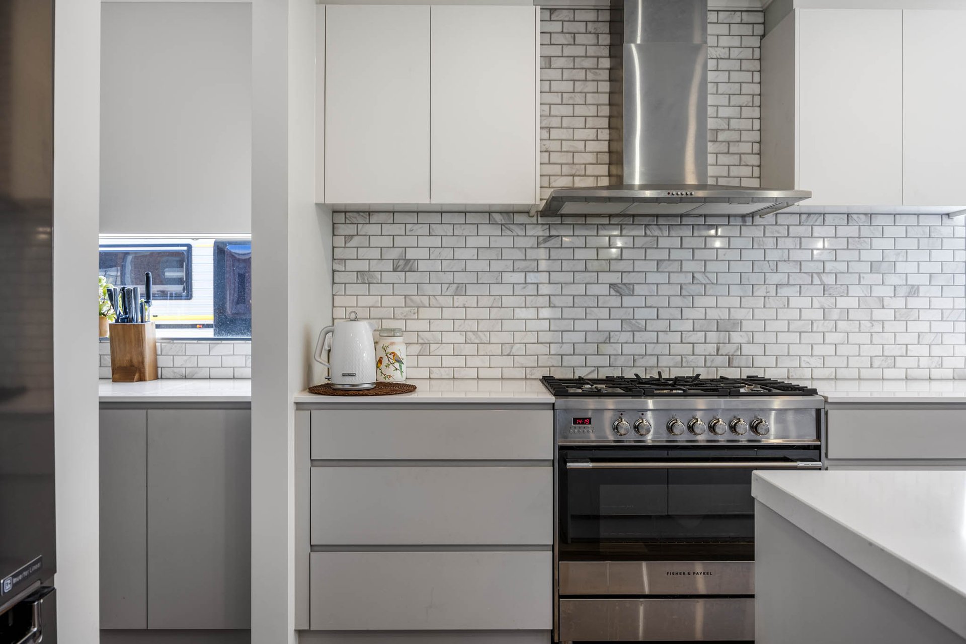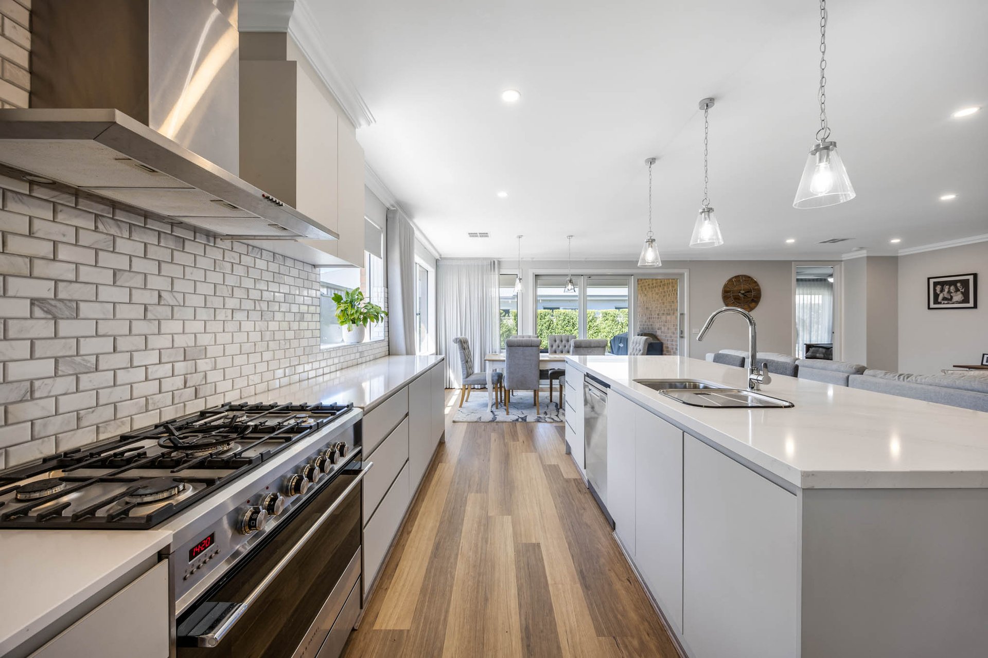 At its heart, lavish stone elevates the elegant entertainer's kitchen, showcasing a deep-set island with bar seating against an intricate brick-mosaic splashback, soft-close cabinetry and drawers, and quality appointments including a 900 mm F&P oven with 5-zone cooktop and a dishwasher, accompanied by a fully appointed butler's pantry with a drinks fridge.