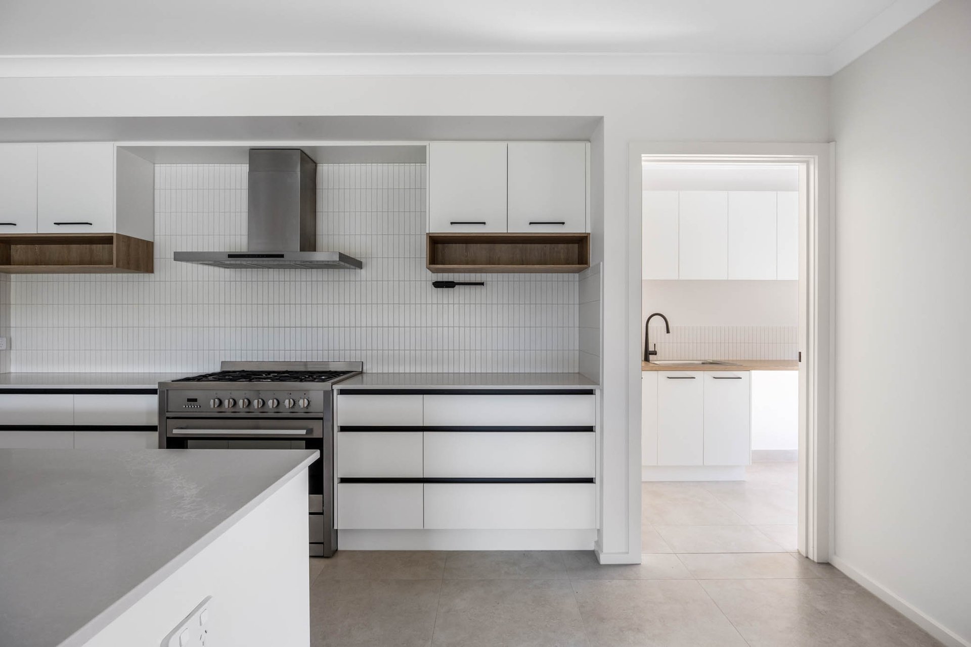 Multiple living zones include a carpeted lounge, with a stone-topped kitchen showcasing an island bench, double sink, soft-close drawers, under-bench storage, Technika 900mm oven, 5-hob cooktop, and an oversized fridge cavity. A walk-in butler’s pantry offers a secondary cooktop, sink, dishwasher, and ample storage.