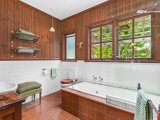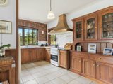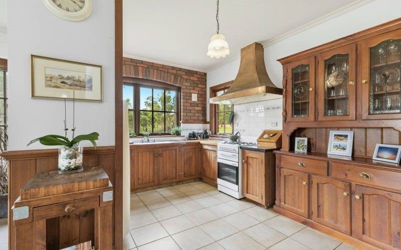 Timber kitchen with a freestanding stove overlooking serene trees & paddocks