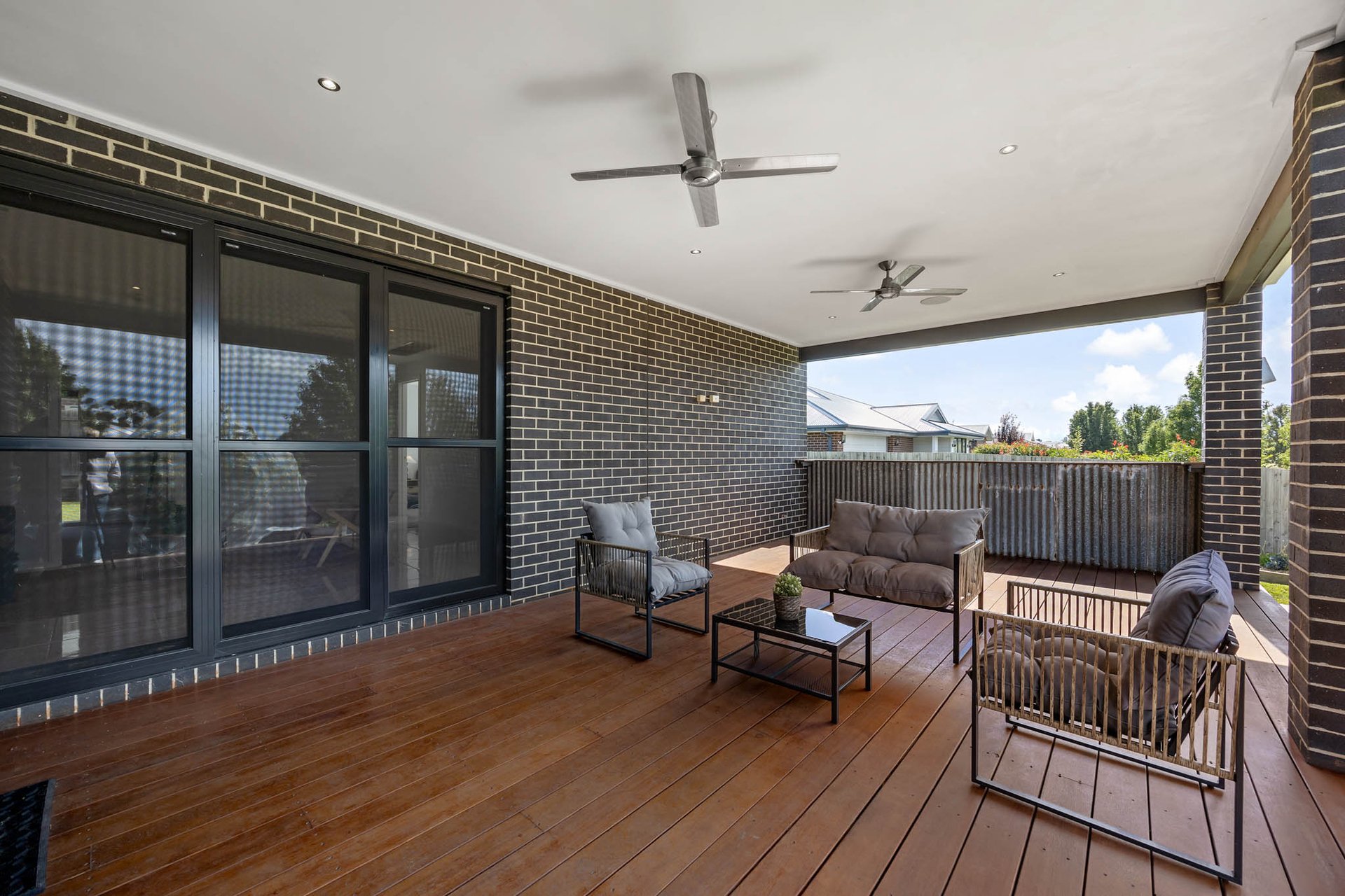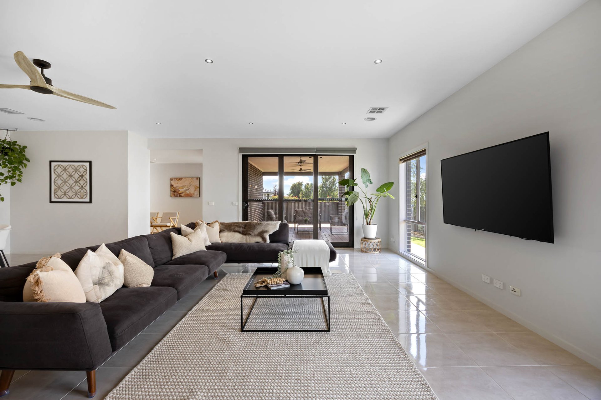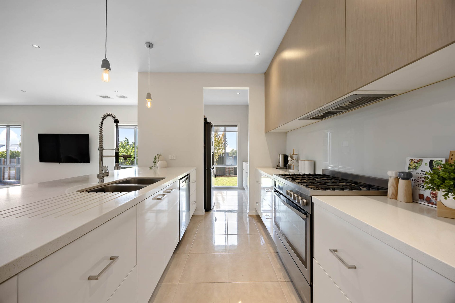 At its heart, a stunning kitchen is appointed with 40mm stone benchtops and a waterfall-edge island with undermount sinks, complemented by a 900mm-wide Westinghouse upright oven with 5-zone cooktop, a Miele dishwasher, and a large walk-in pantry. Interiors extend to an alfresco domain with wide Merbau decking and exterior fans, creating a perfect setting for outdoor entertaining.