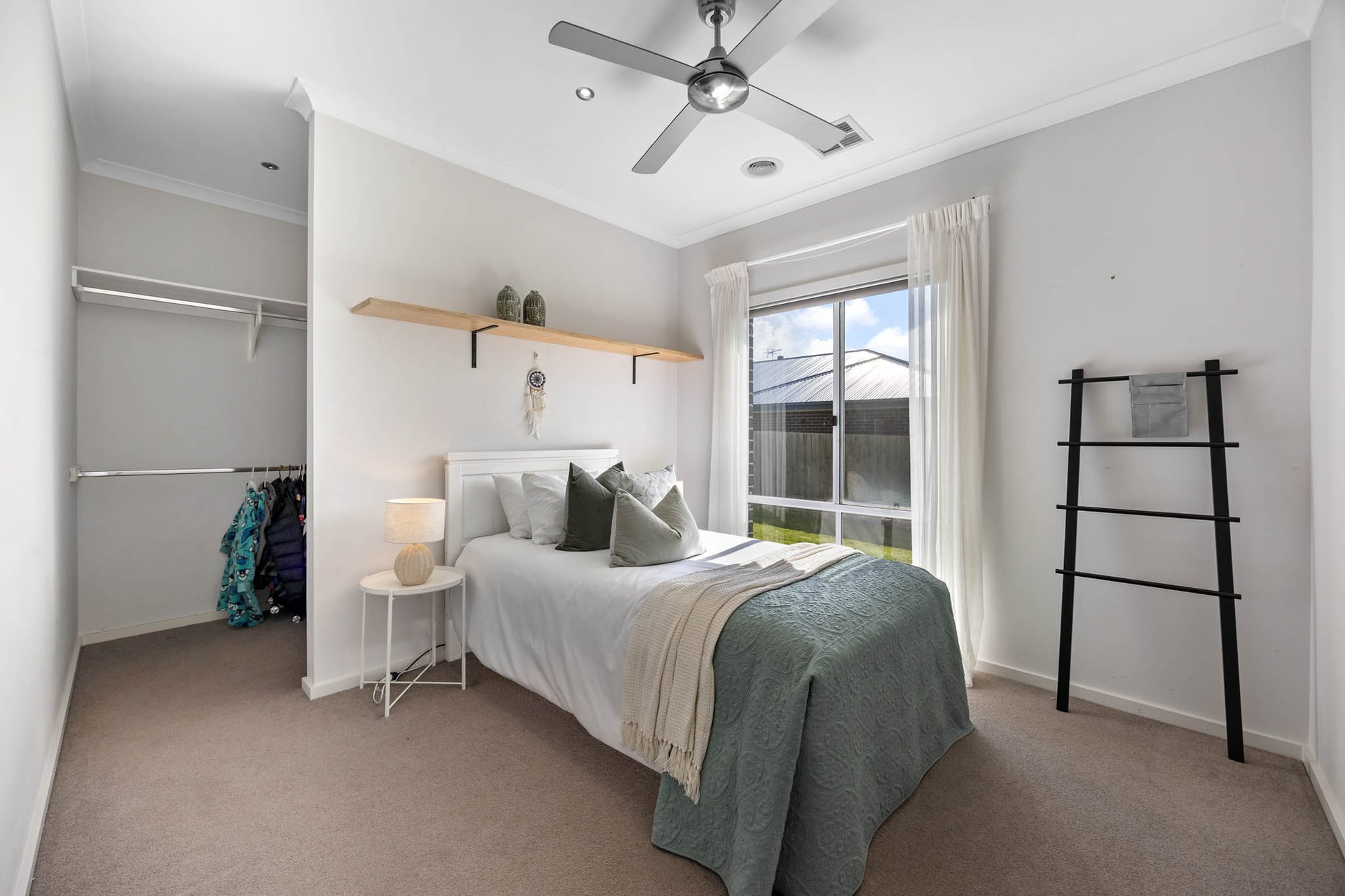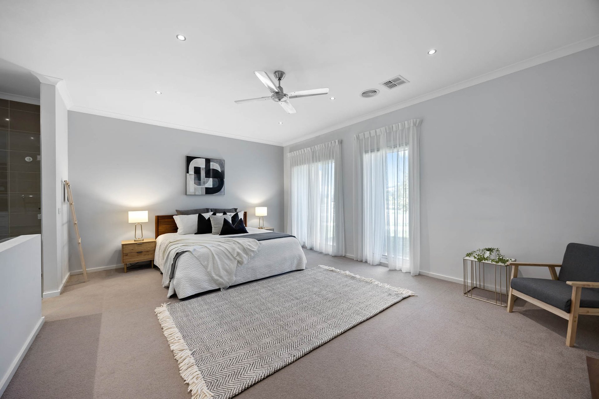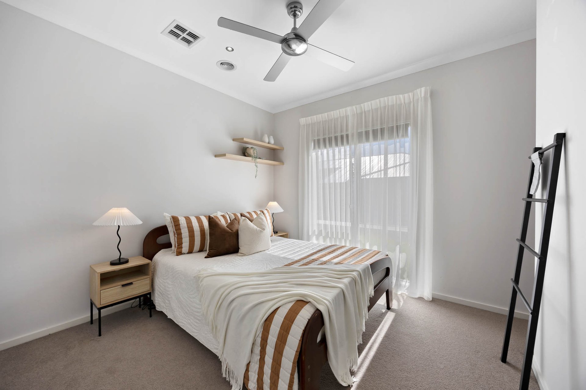At its heart, a stunning kitchen is appointed with 40mm stone benchtops and a waterfall-edge island with undermount sinks, complemented by a 900mm-wide Westinghouse upright oven with 5-zone cooktop, a Miele dishwasher, and a large walk-in pantry. Interiors extend to an alfresco domain with wide Merbau decking and exterior fans, creating a perfect setting for outdoor entertaining.