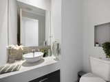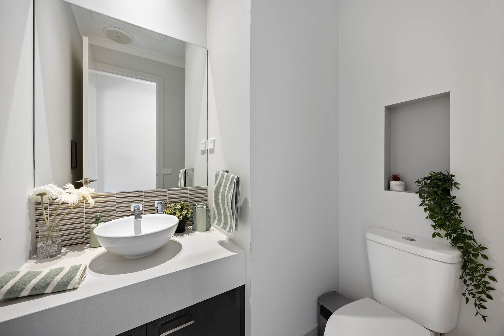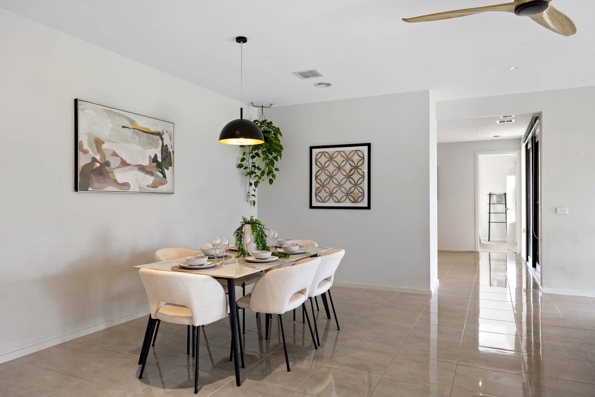 A striking façade embellished with Western red cedar horizontal timber slats, introduces interiors where 9-foot square-set ceilings and polished tile flooring create a sense of scale and cohesion throughout. Multiple living zones provide flexibility for growing families, including open-plan living and dining, a theatre in a moody dark palette, and a lounge.