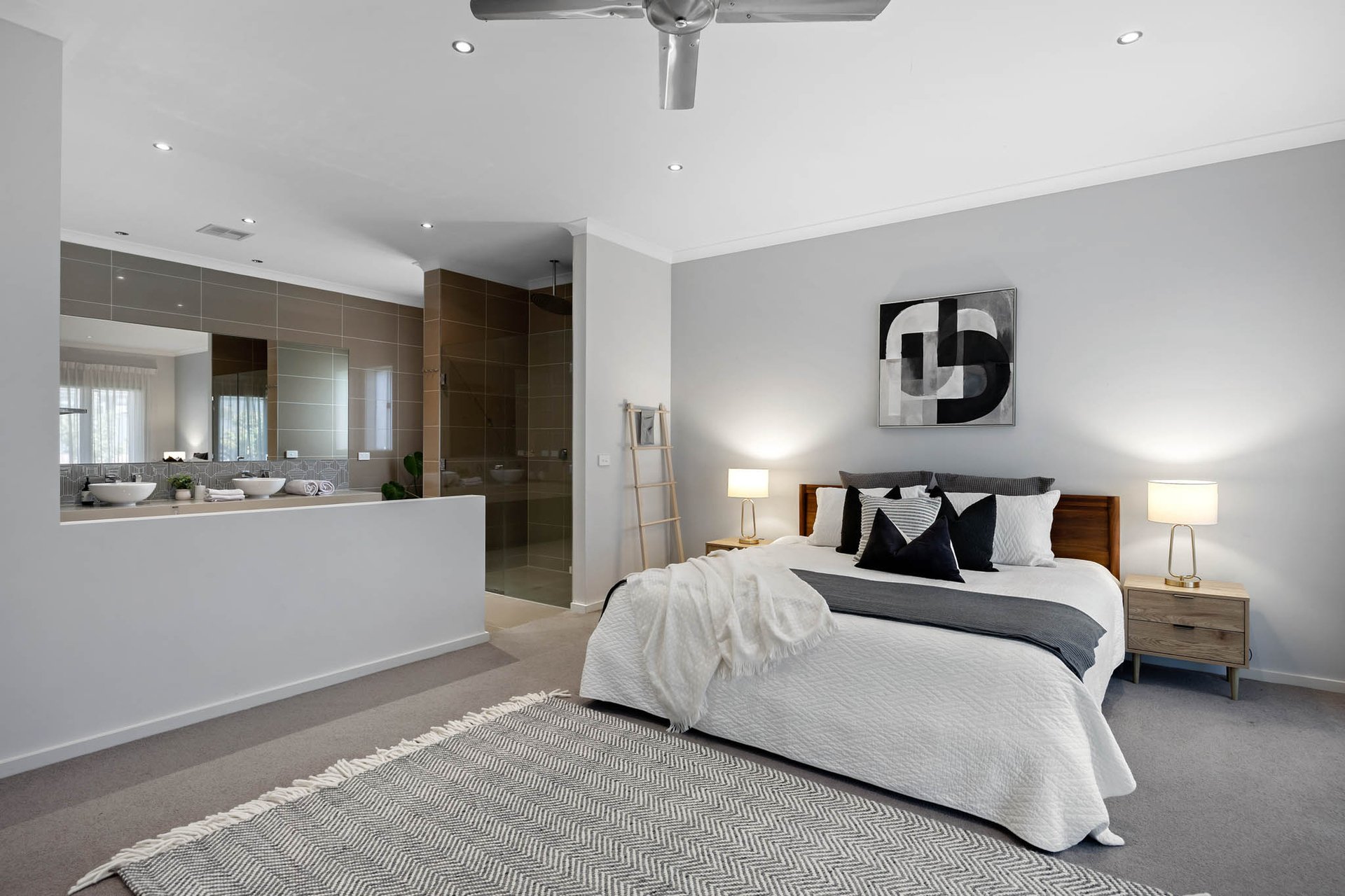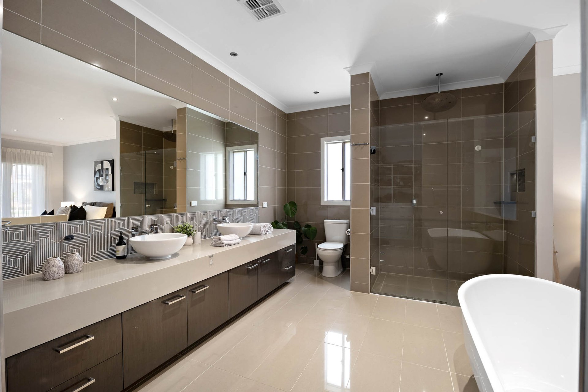 Accommodation of 4 bedrooms and 2 bathrooms includes a main bedroom configured as a generous retreat with a sitting area, walk-in robe, and a luxury ensuite featuring a frameless glass shower, bath, and twin stone vanity. The central bathroom includes a 2nd bath plus a shower, while a powder room is appointed with a stone vanity.