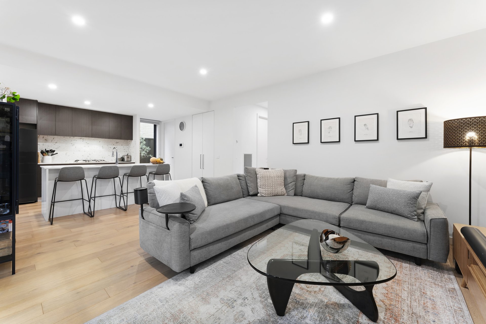 A light-filled open-plan living and dining domain forms the heart of the home, enhanced by warm timber flooring and a sleek stone kitchen appointed with quality appliances, excellent storage and generous bench space. Sliding doors create a seamless connection to a private alfresco deck and courtyard, ideal for entertaining or relaxed everyday living.