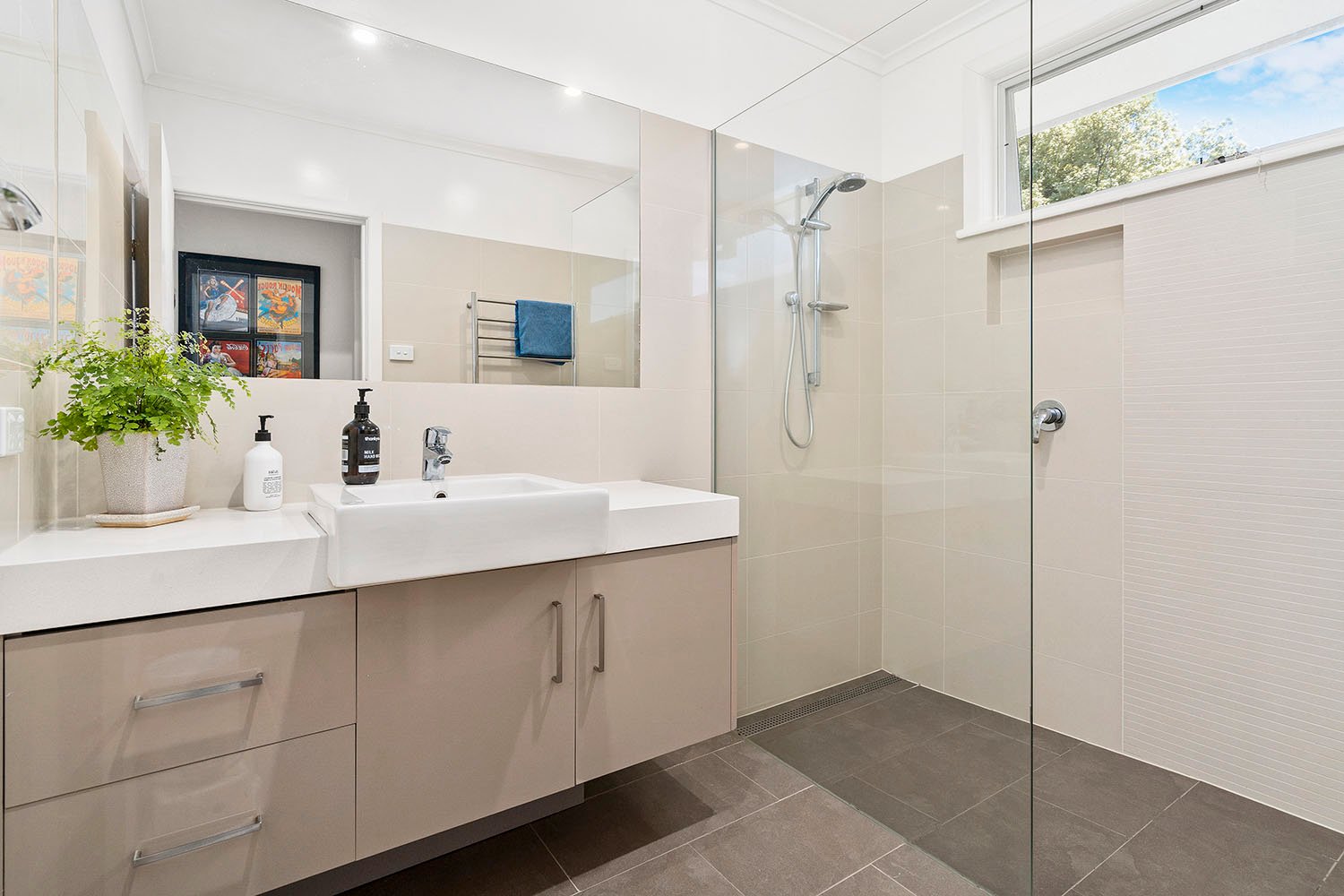 - Central bathroom with floating vanity and heated towel rack