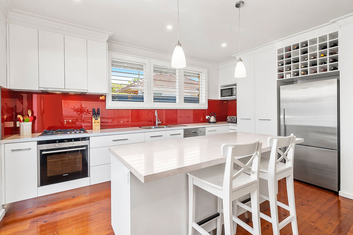 - Stunning gourmet kitchen with crimson glass splash back, luxe stone island, and premium Bosch/Siemens appliances