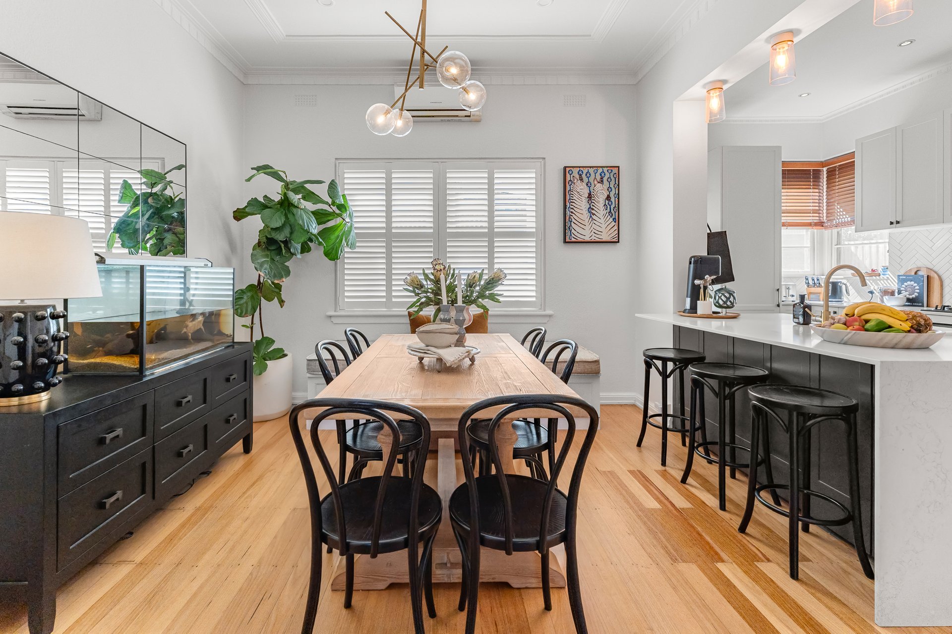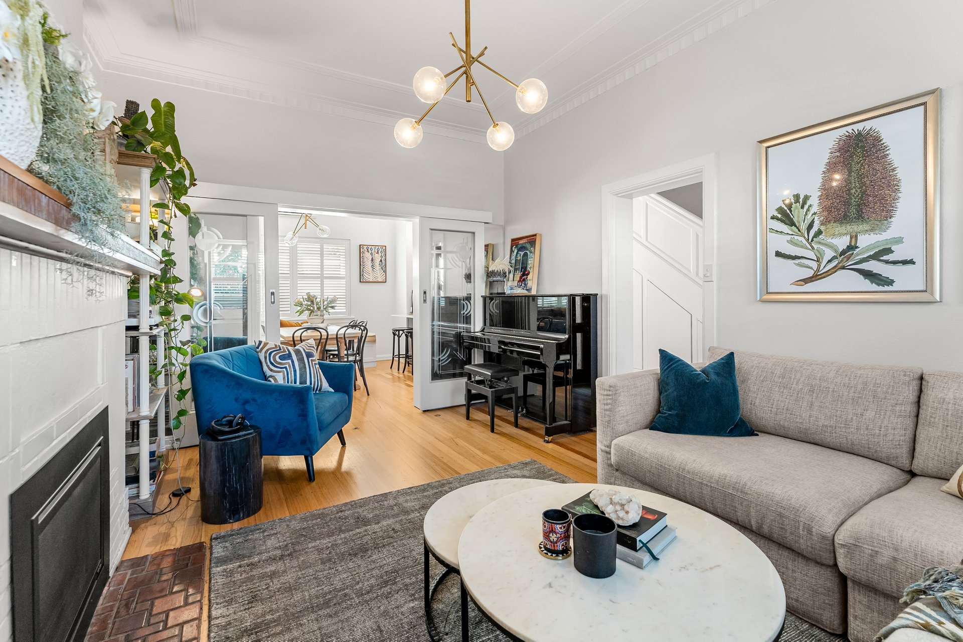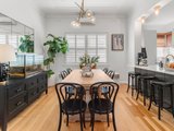 Privately set behind a secure front courtyard, the home immediately reveals its character through ornate decorative ceilings, intricate cornices and meticulously restored Tasmanian oak floorboards, each detail thoughtfully preserved and enhanced. Beyond its charming façade, the interiors unfold into a light-filled, open plan domain, designed to deliver both functional family living and elegant entertaining.