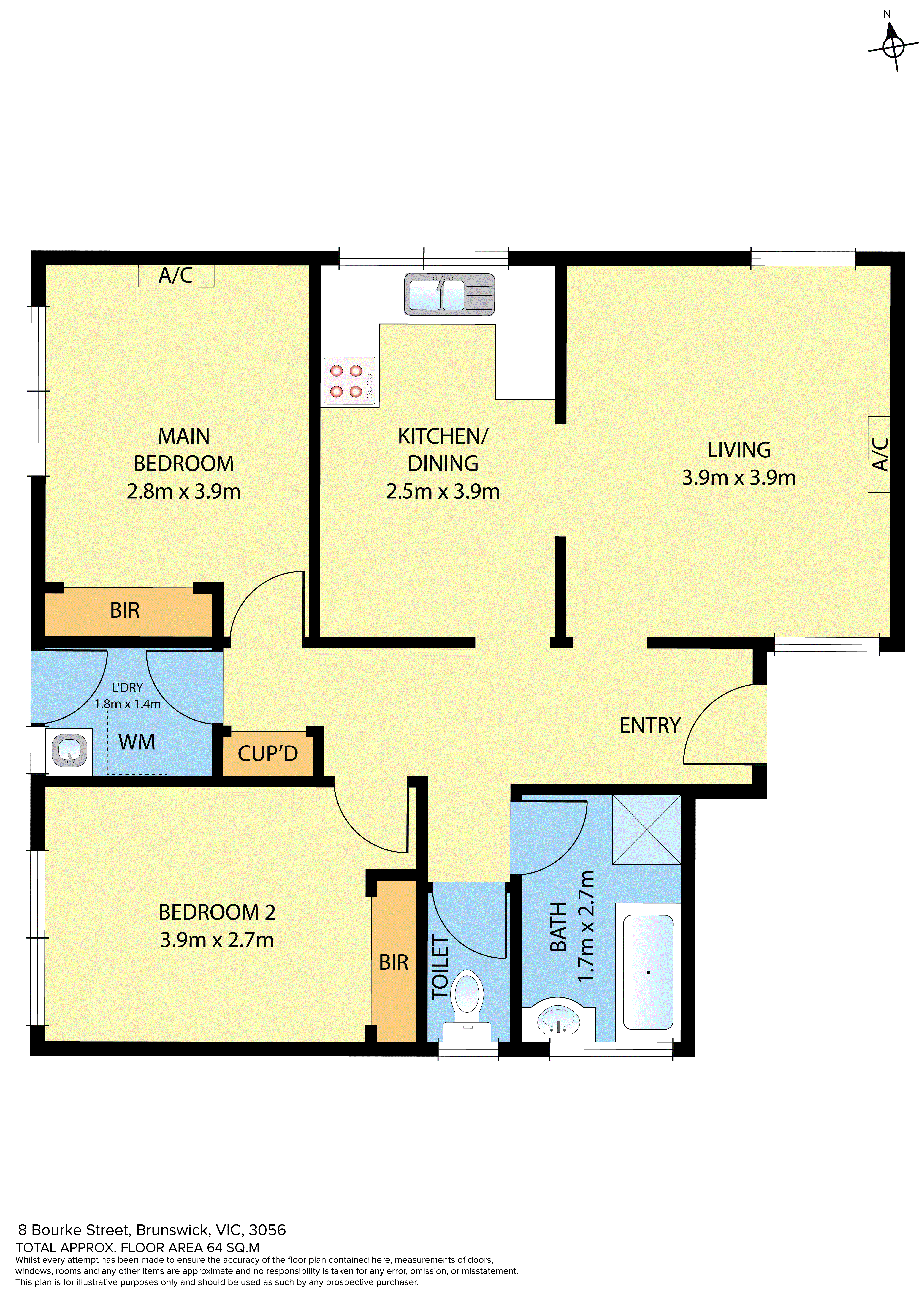 Both bedrooms are well-sized and serviced by a central bathroom, while the kitchen provides excellent storage and everyday functionality.