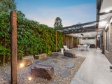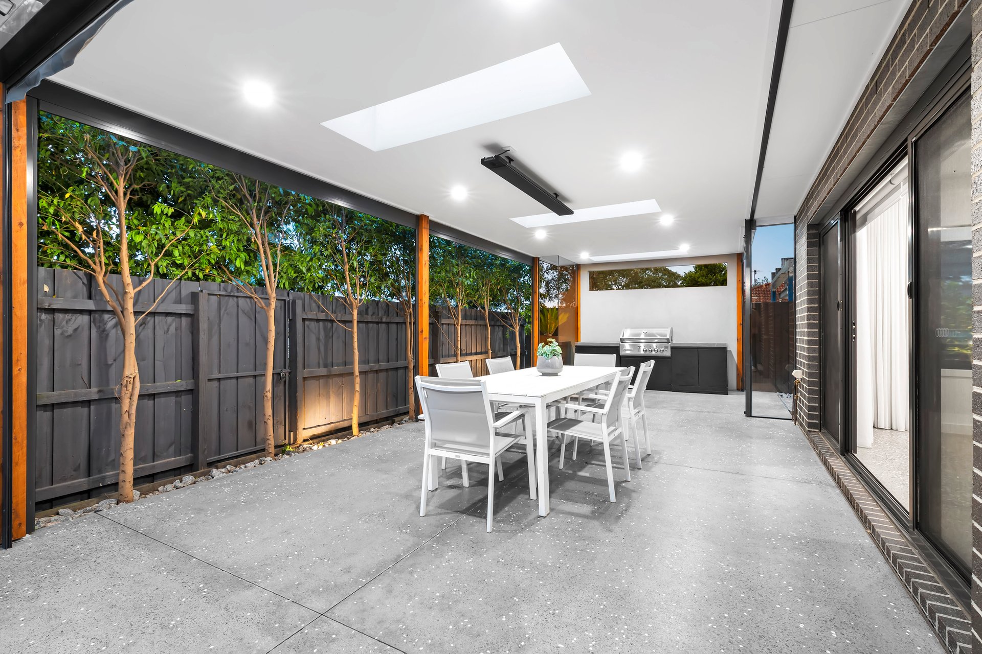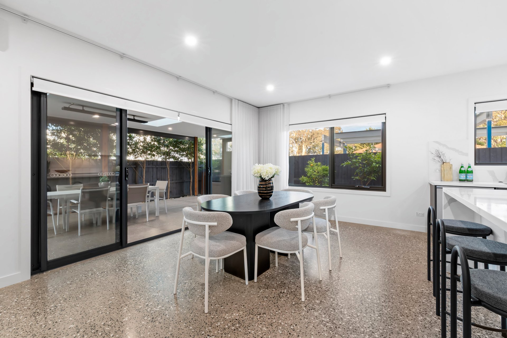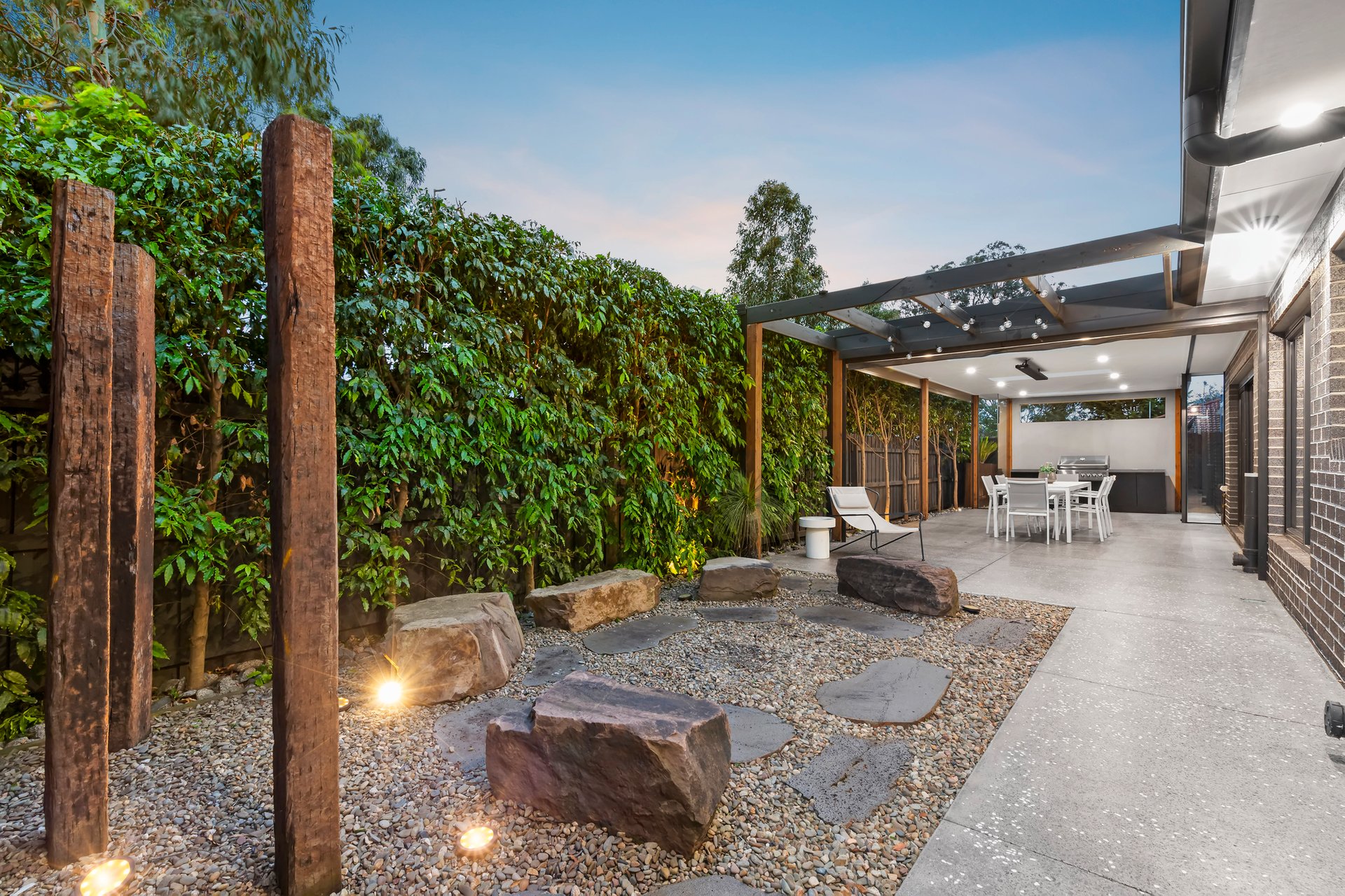 This architecturally refined townhouse delivers premium contemporary living with exceptional indoor–outdoor flow in a peaceful Nunawading position. Polished concrete floors and full-height glazing define the generous open-plan living zone, which extends effortlessly to a superb all-weather alfresco complete with electronic blinds, skylights and an integrated BBQ kitchen. Beyond the covered space, the landscaped rear garden reveals a tranquil fire-pit retreat surrounded by curated stonework and lush plantings, creating a rare outdoor sanctuary for year-round enjoyment.