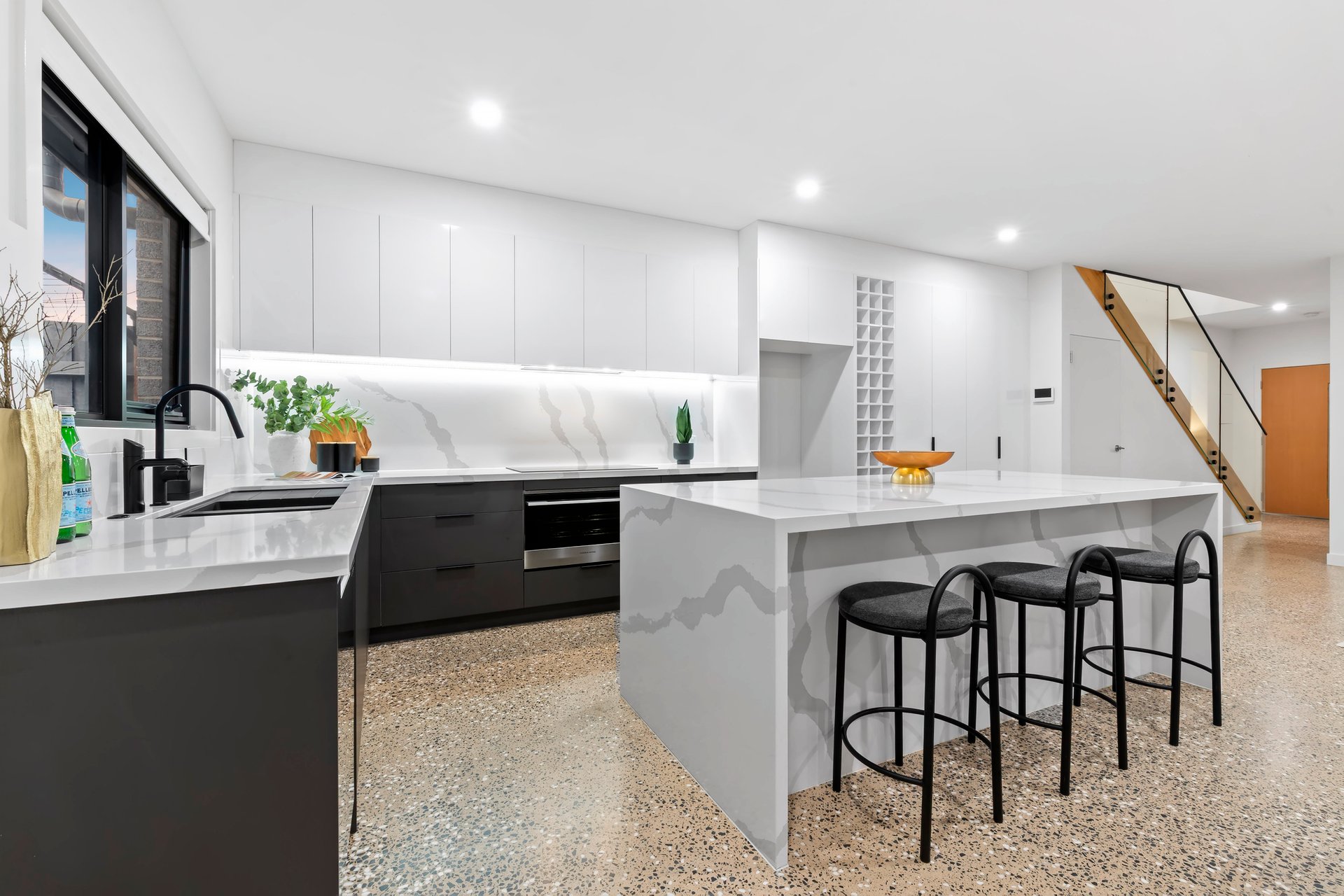 The designer kitchen is a standout feature, finished with stone waterfall benches, a breakfast island, abundant cabinetry, built-in wine storage and high-quality Fisher & Paykel appliances. Electronic blinds in the living area enhance day-to-day comfort and elevate the home’s modern convenience.