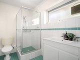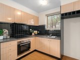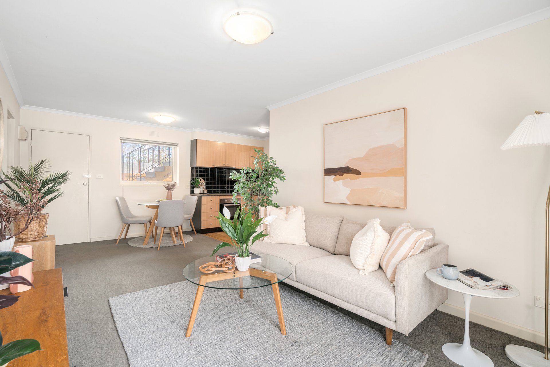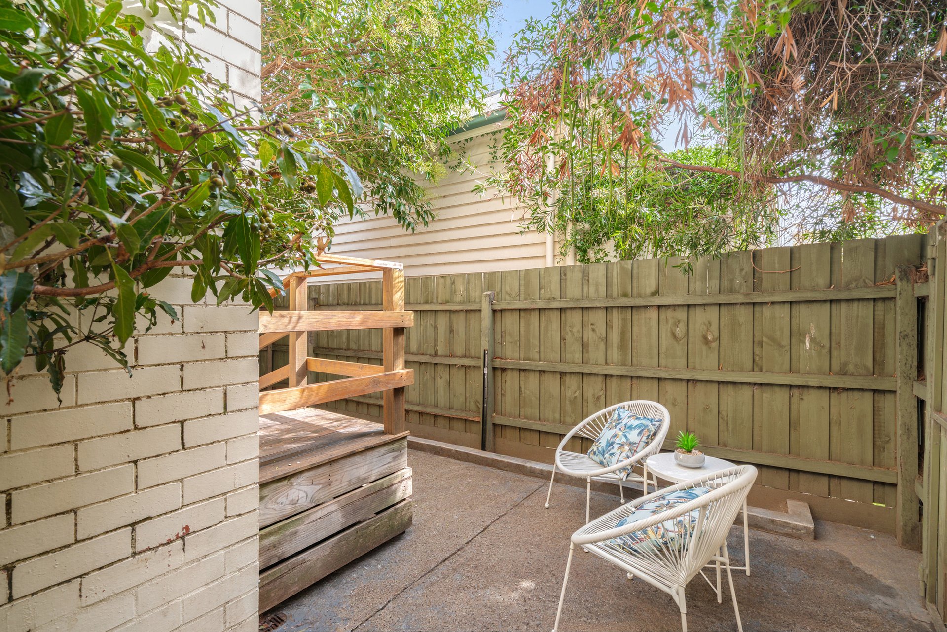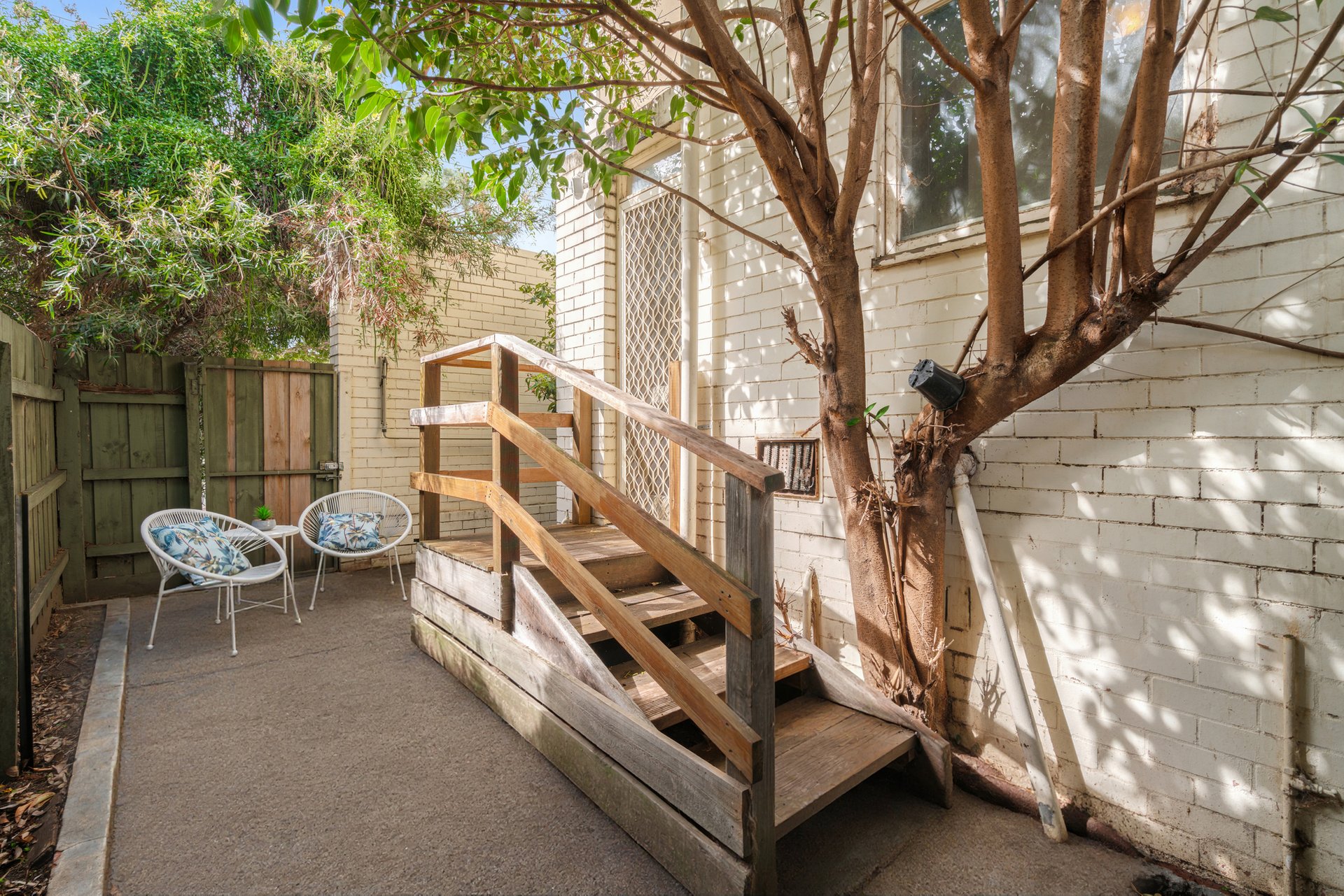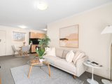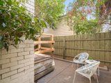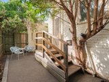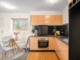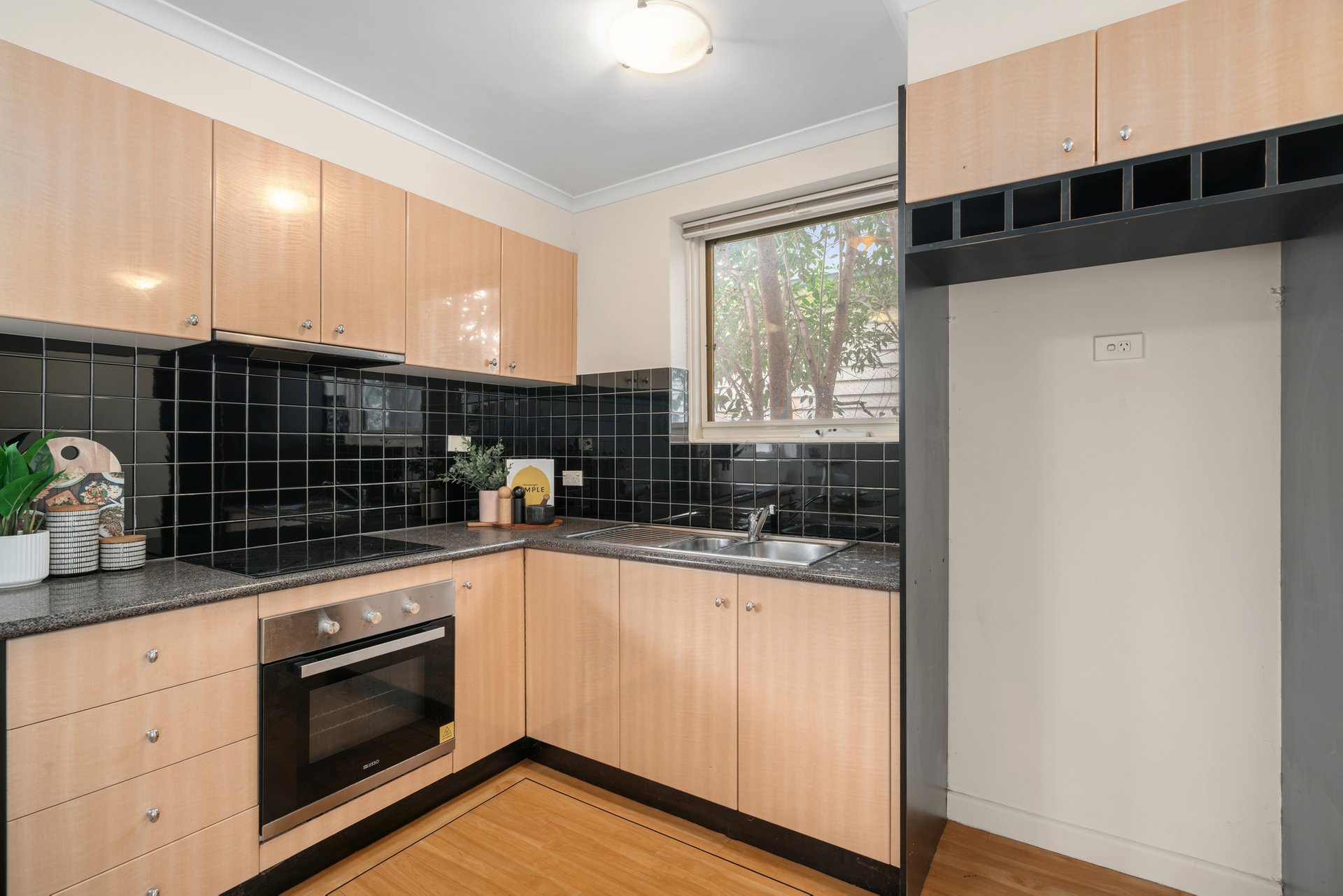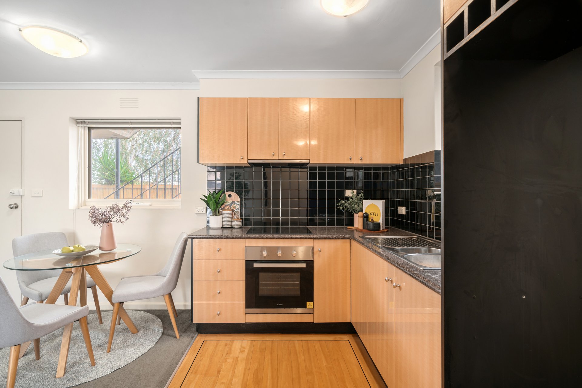 Stepping inside, the inviting open-plan living and dining domain is detailed with classic ceiling cornices and is bathed in natural light. The adjoining kitchen is efficiently designed, featuring timber-look cabinetry that contrasts against a striking black tiled splashback, and an electric oven and cooktop. A glass door from the kitchen provides seamless access to a private timber deck with steps leading down to a leafy courtyard, offering a tranquil space to relax or entertain.