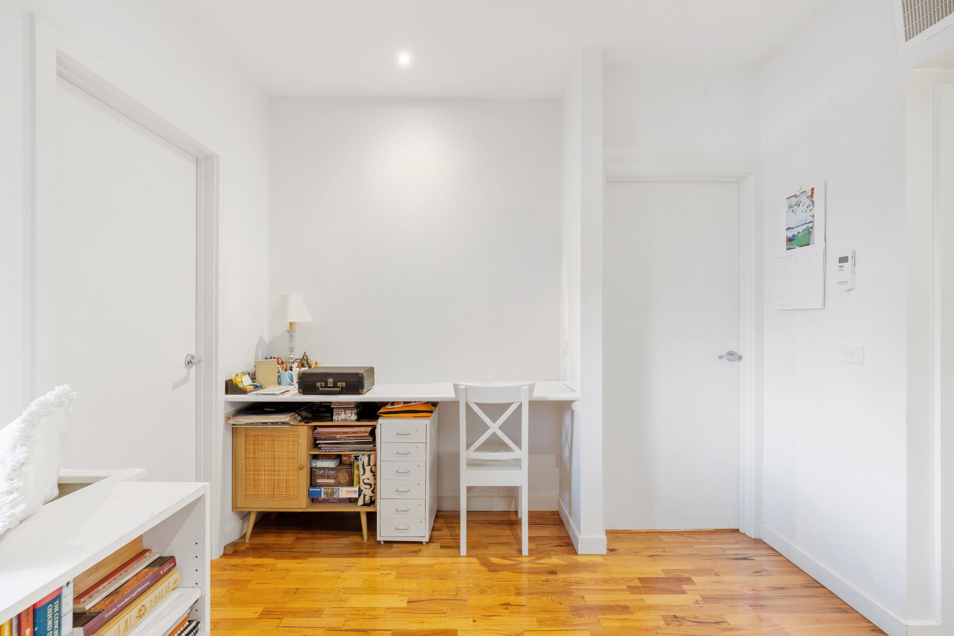 Inside, the open-plan living and dining area is enhanced by polished timber flooring, creating a warm and contemporary feel. Natural light flows through the space, while split system heating and cooling ensure year-round comfort. The layout is practical and well considered, with a dedicated study area positioned adjacent to the kitchen, ideal for working or studying from home.