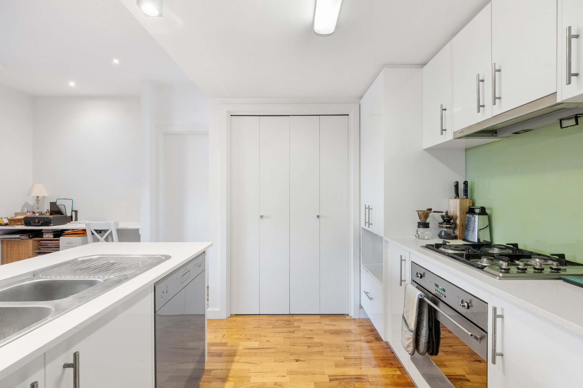 The kitchen is sleek and modern, featuring speckled white stone benchtops, white cabinetry with stainless steel fixtures and a glass splashback. High-quality SMEG appliances, including a 4-burner gas cooktop, electric oven and dishwasher, are complemented by a double stainless steel sink, making the space both stylish and highly functional.