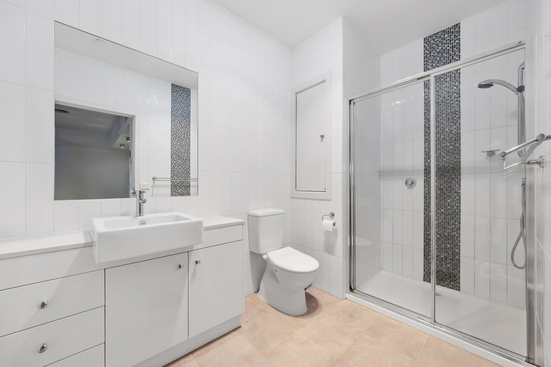 The bathroom is finished with floor-to-ceiling tiling and features an oversized shower, a large vanity with ceramic basin, and ample under-bench storage. A European laundry is neatly integrated, maximising space without compromising practicality.