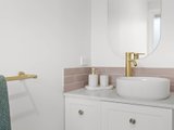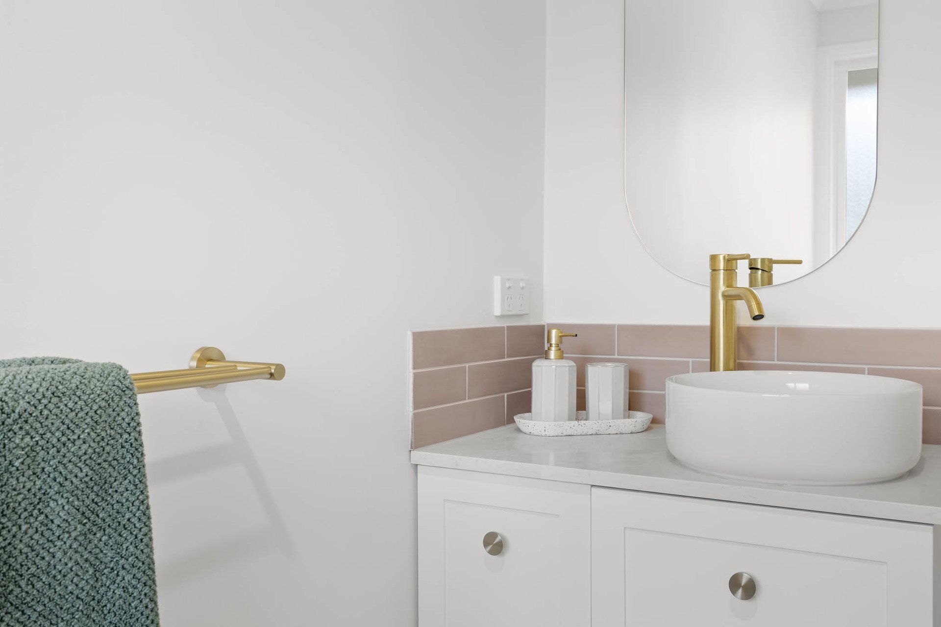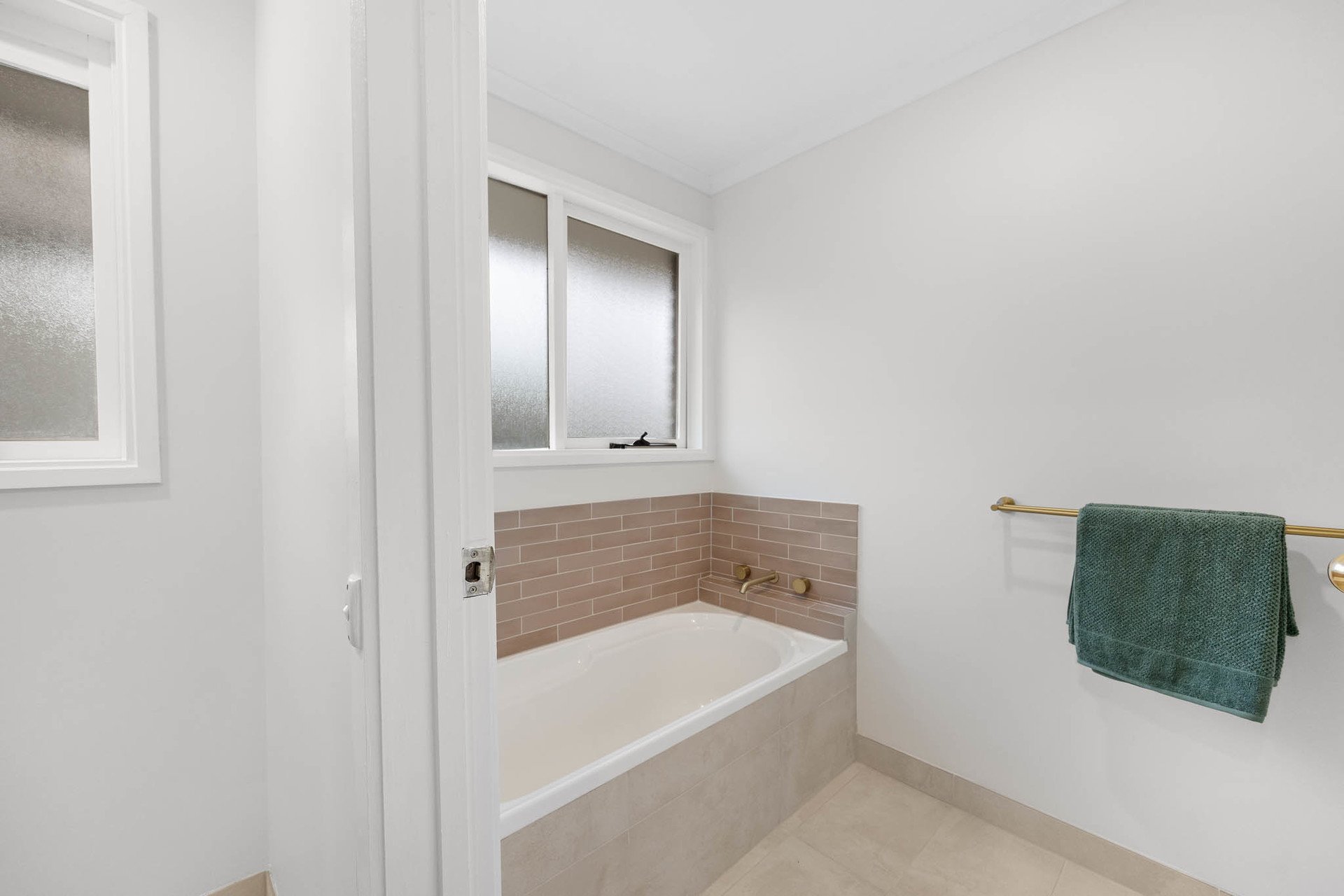 Accommodation includes three robed bedrooms, with the main enjoying a walk-in robe, while two fully renovated luxury bathrooms elevate daily living. One pairs sage and neutral tones with a frameless walk-in shower, stone vanity, heated towel rail and brushed gold tapware. The 2nd features a soft textural palette, a bath, stone vanity, and gold fixtures.