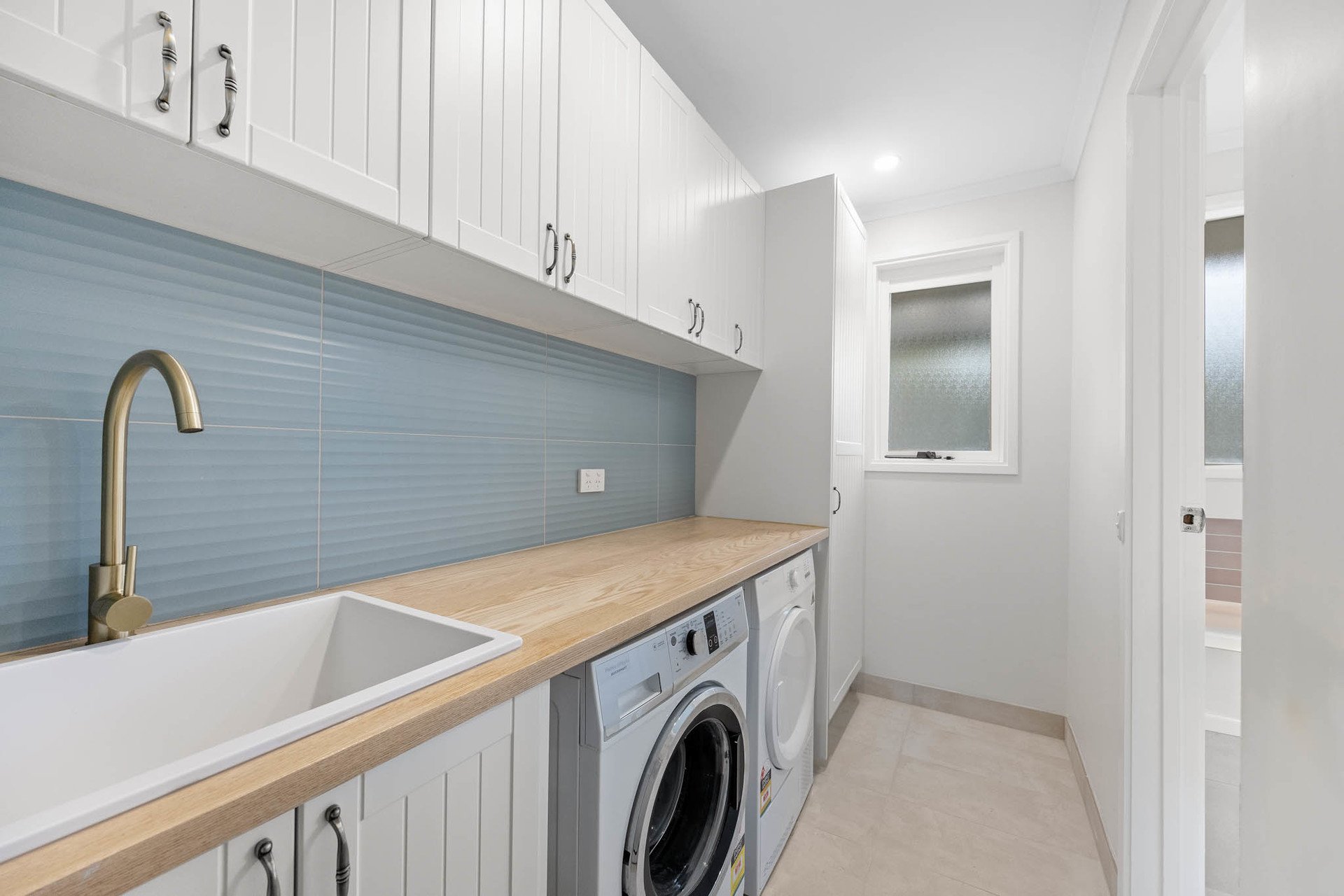 Introduced by an inviting front veranda, the home opens to a spacious L-shaped living area with plenty of space for a study nook, while the central kitchen features abundant bench space, a wall oven/grill, 4-zone cooktop, and a dishwasher. Glass sliders from the dining area open to an elevated decked alfresco zone, overlooking a private garden oasis featuring lush lawns, exotic plantings, and a majestic palm.