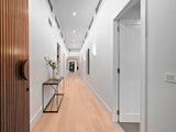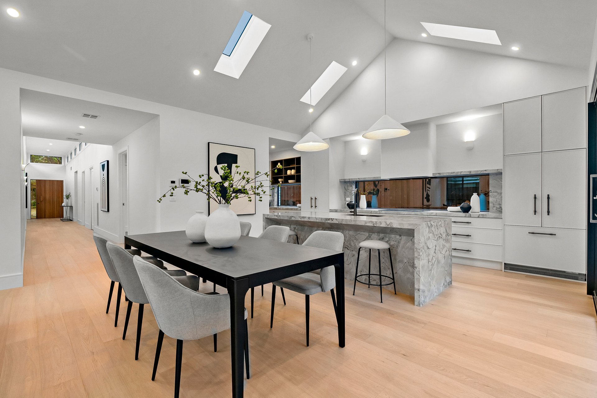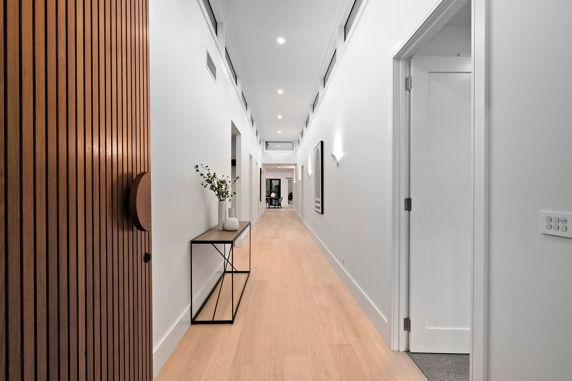 An extended, gallery-like hallway rises beneath soaring ceilings, clerestory windows spilling natural light across engineered oak floors. It’s not just an entrance — it’s an arrival. A statement. A promise of what’s to come.
