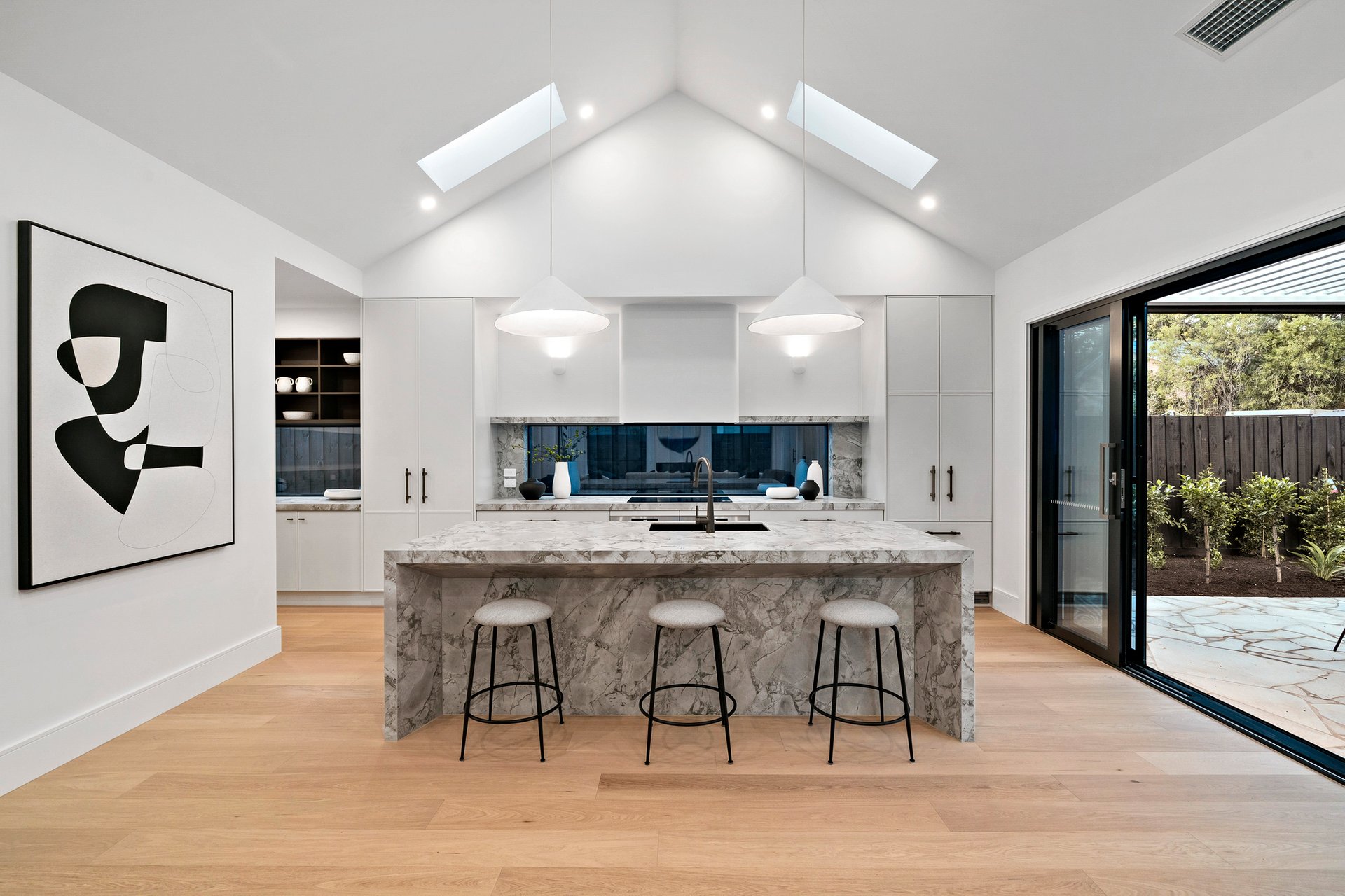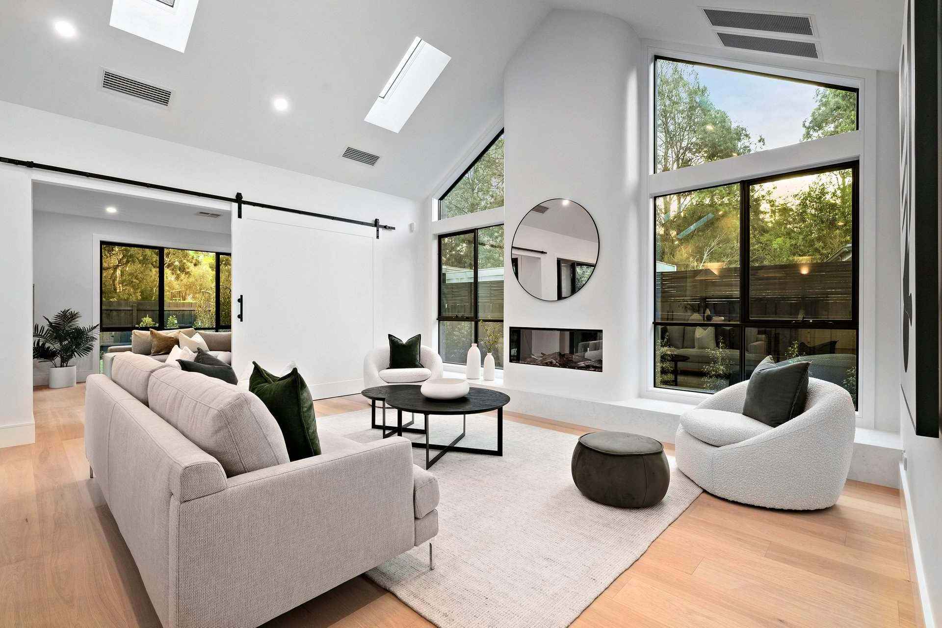 At the heart of the home, cathedral ceilings soar above the central living and dining domain. High angled windows and Velux skylights flood the space with golden daylight, while a British electric log fireplace brings warmth and intimacy as evening falls. Oversized sliding doors reveal a second family room with tranquil garden views — the perfect retreat, reading space, or children’s haven.