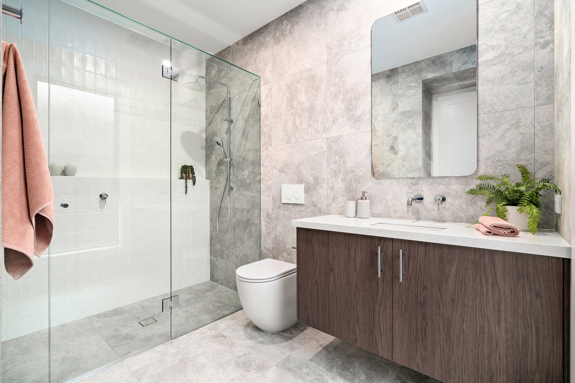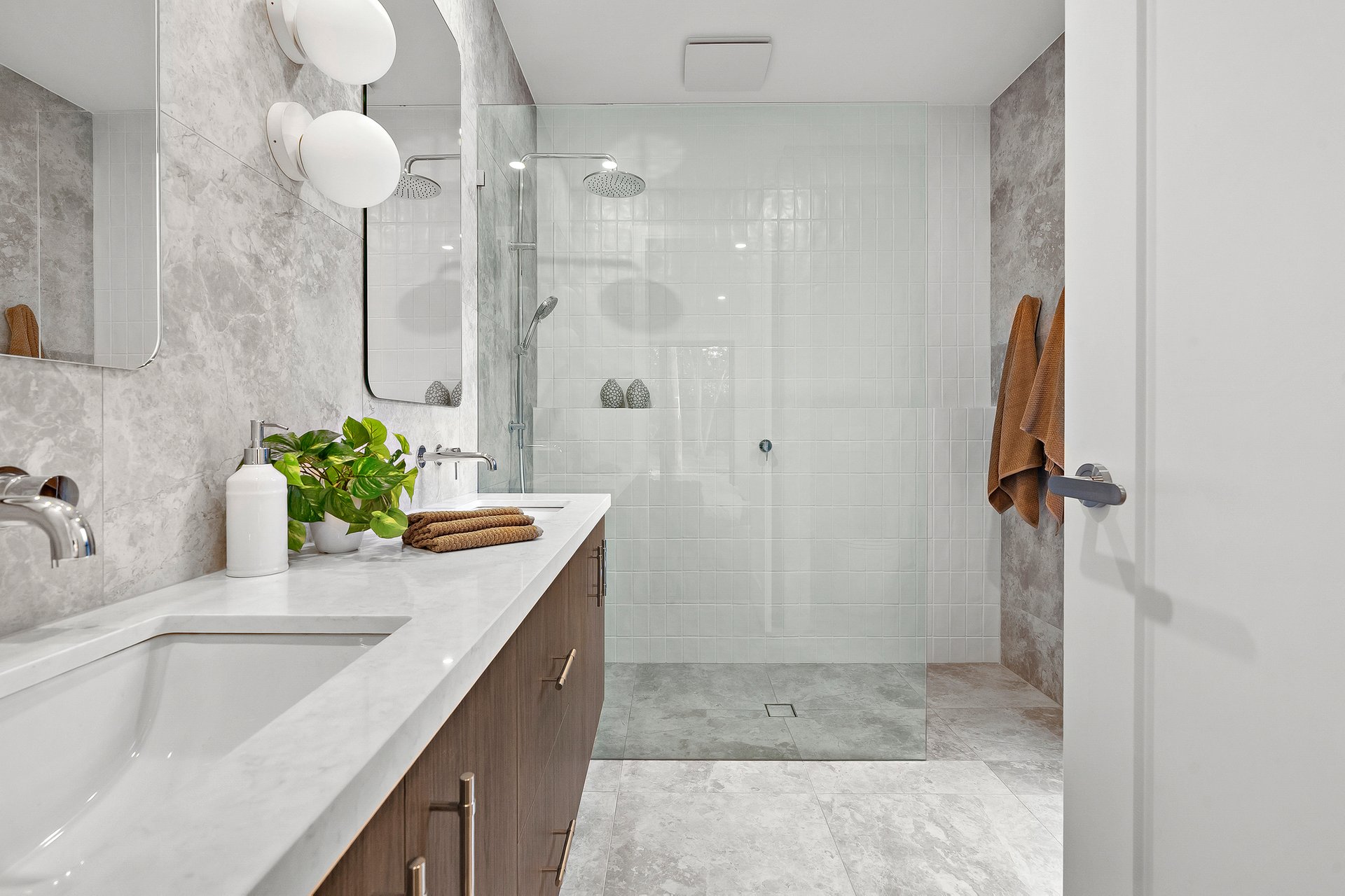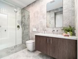 At the front of the home, the first of two magnificent main suites offers sanctuary and sophistication. A generous and fully fitted walk-in robe. A breathtaking double-vanity ensuite adorned with exquisite stone. A rain shower that transforms everyday rituals into indulgent escapes.