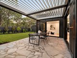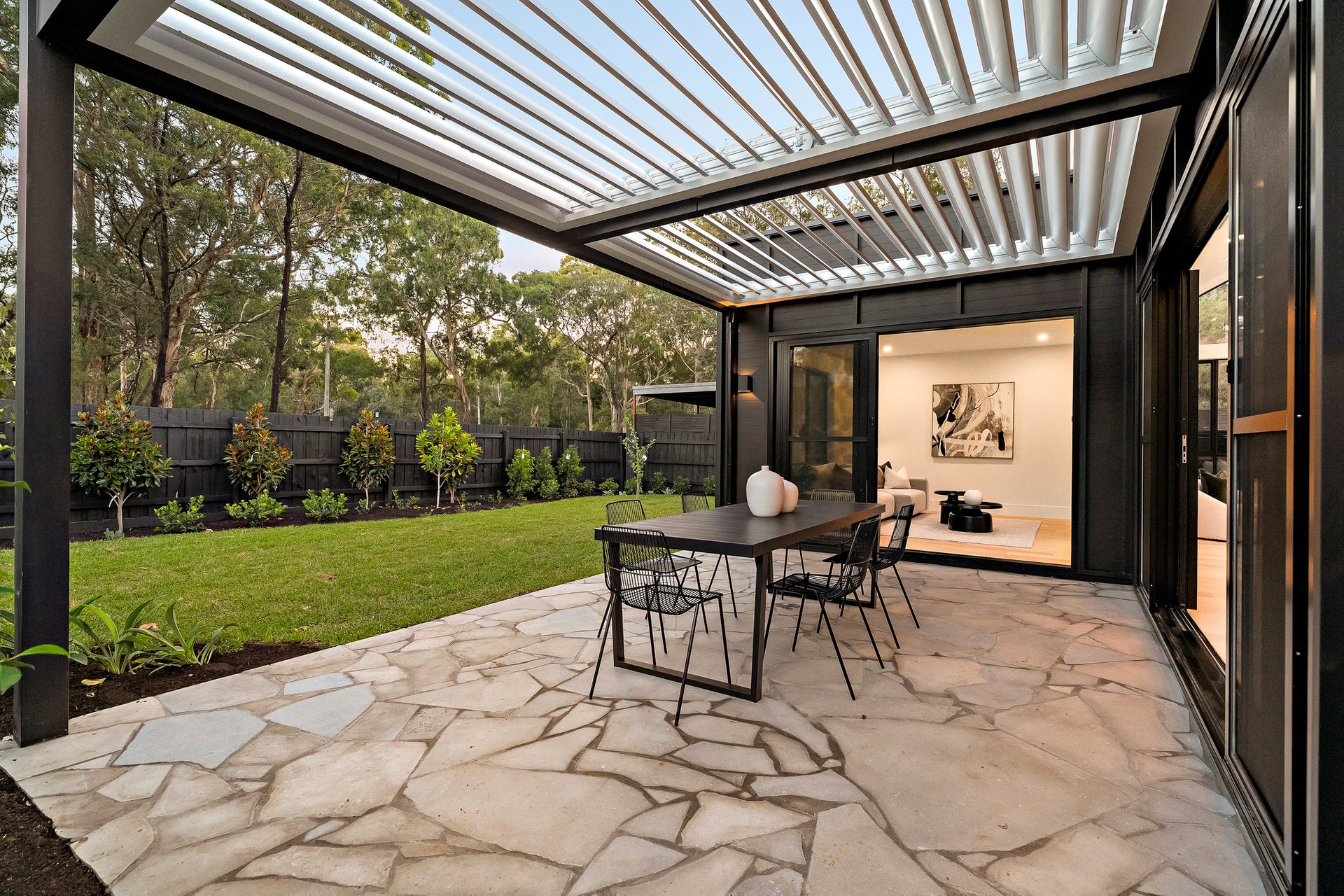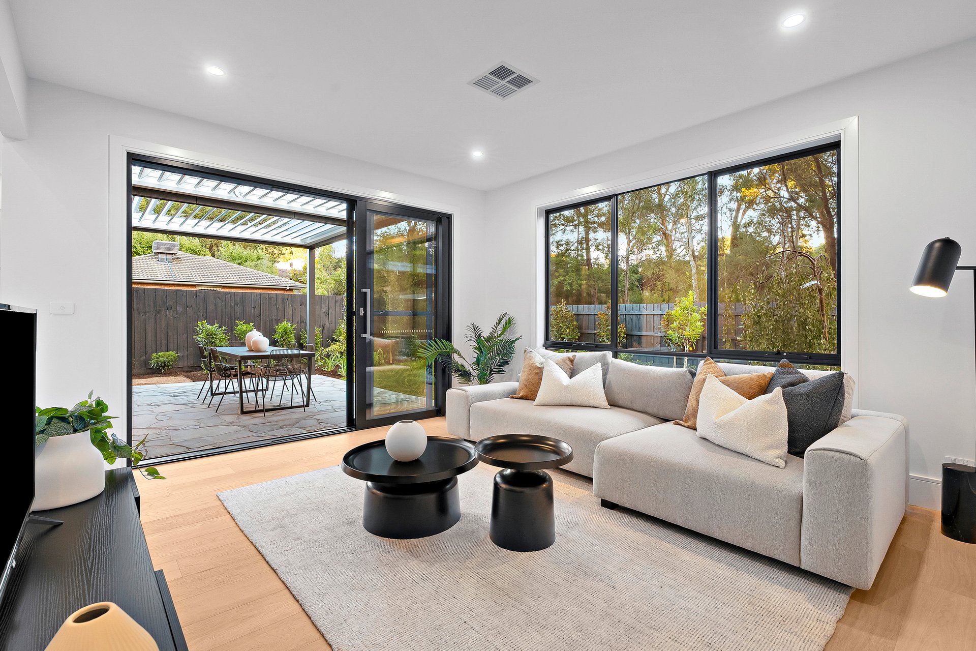 A landscaped garden set on approximately 696sqm becomes your private oasis. The covered Vergola alfresco dining area invites long lunches, twilight dinners, and celebrations under open skies. Backing onto leafy serenity, the home feels worlds away — yet remains beautifully connected.