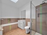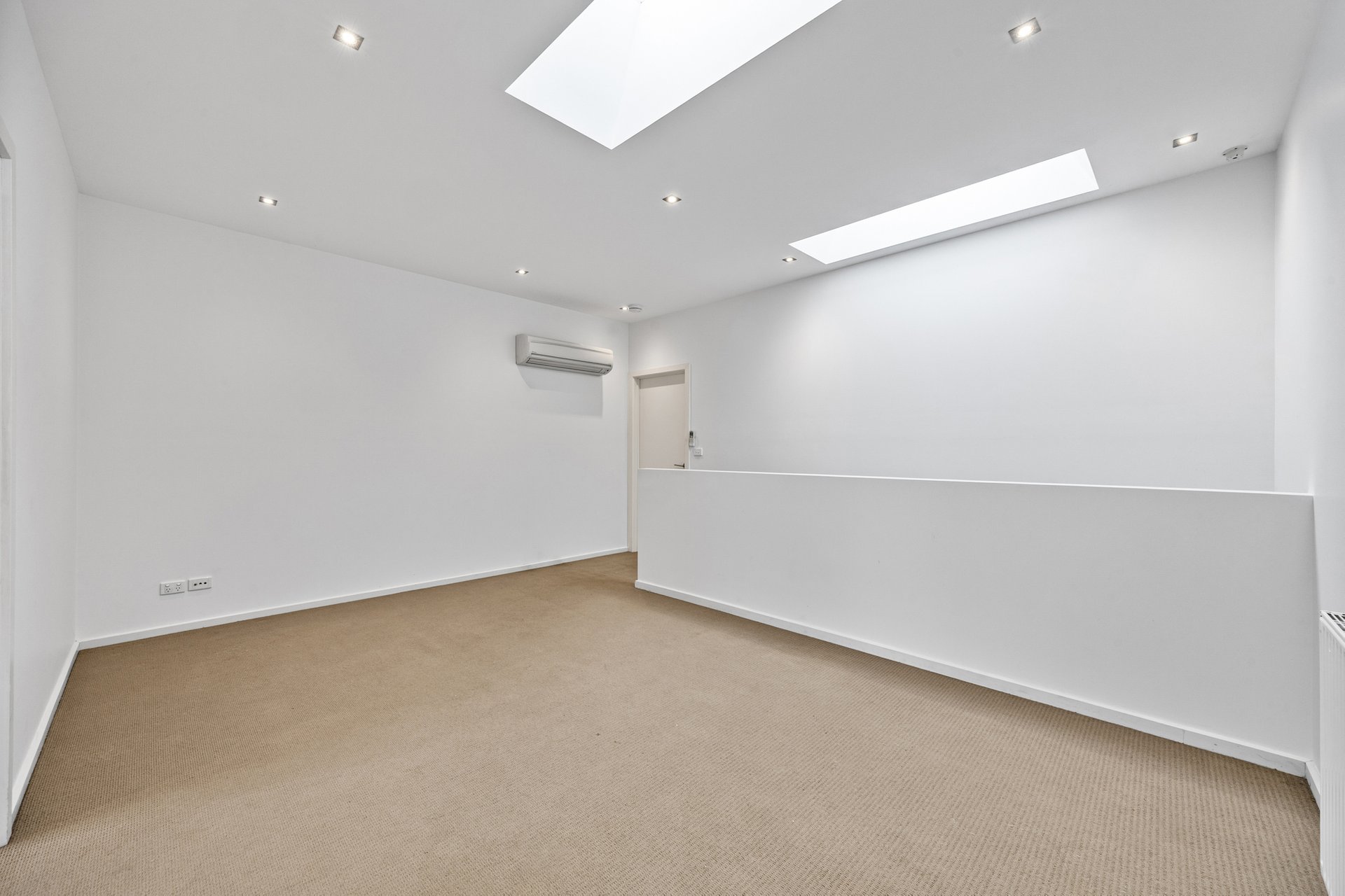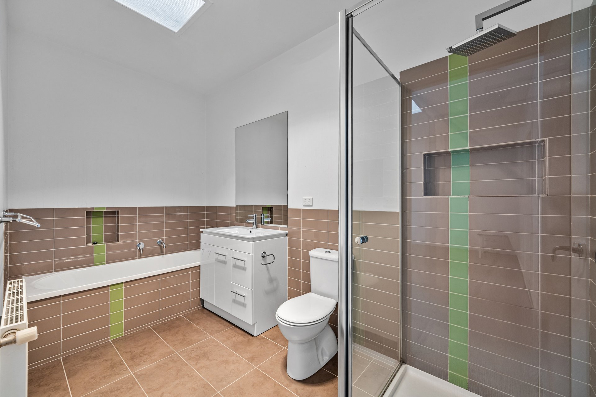 Upstairs, the master bedroom is a standout with a walk-in robe offering ample storage and a private ensuite bathroom. The room is carpeted and flooded with natural light from large windows and a sliding door. Two additional bedrooms with built-in robes, a spacious central living area, and a main bathroom with a shower and bathtub complete the upper level. Two large skylights bring in strong daylight, further enhancing the space, while Giacomini hydronic heating and split system air conditioning ensure comfort year-round.