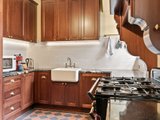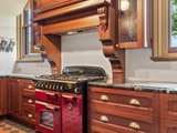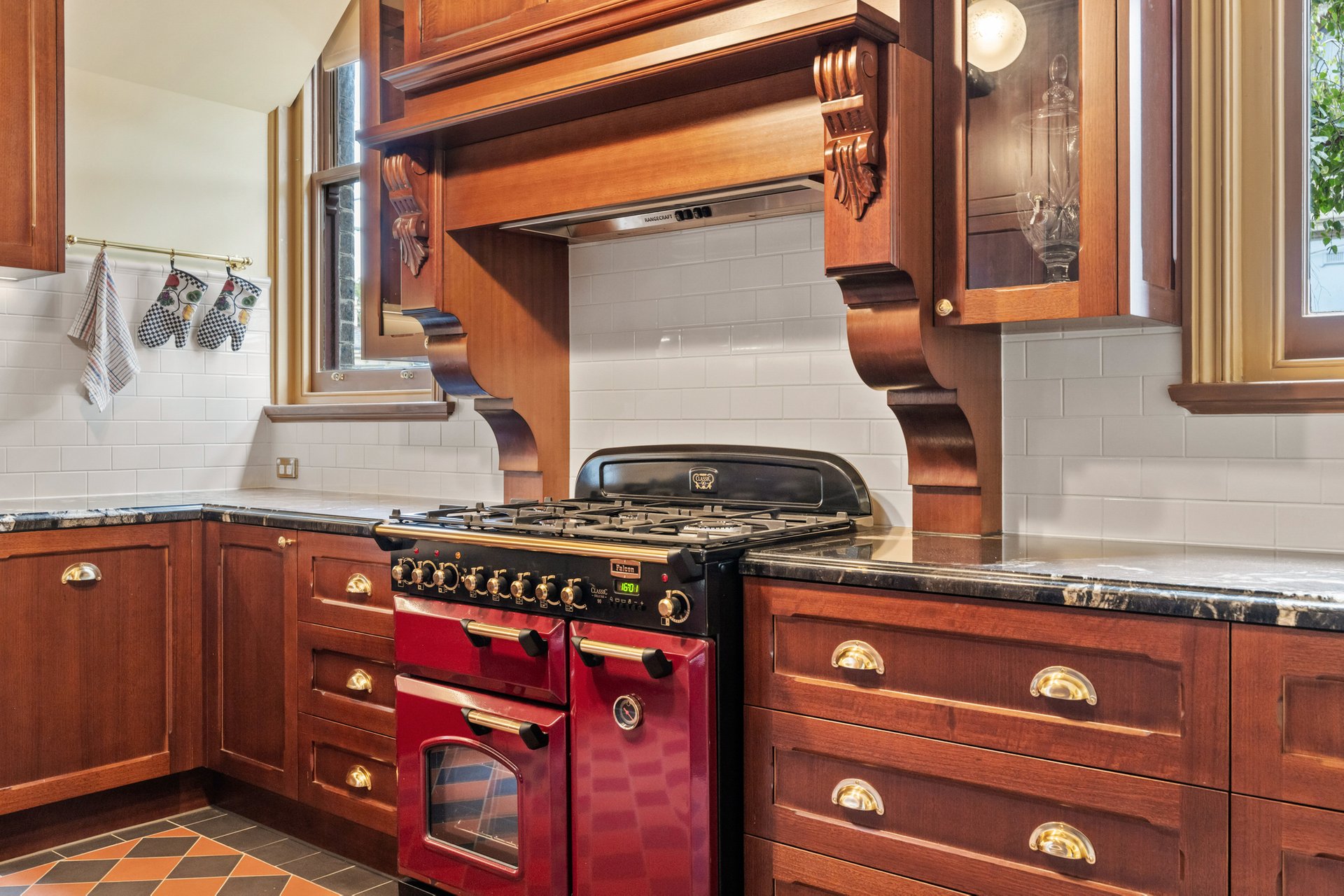 The kitchen, positioned to service both residential and commercial use, features durable stone benchtops, a freestanding Falcon oven and gas cooktop, a Belfast ceramic sink, and tiled splashback. Striking timber cabinetry provides ample storage, and the space enjoys plenty of natural light. The kitchen’s practical layout ensures easy workflow.